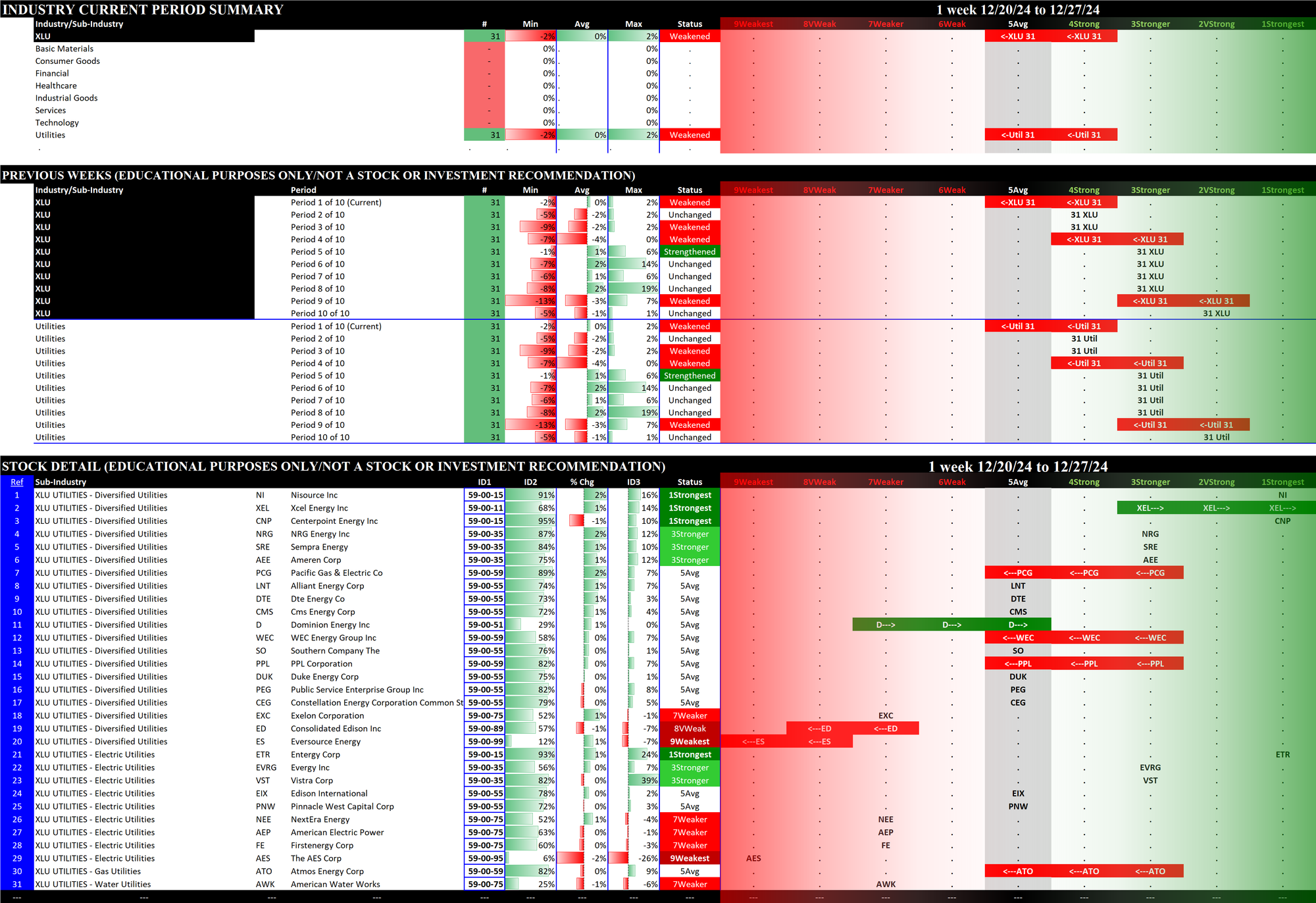 The XLK/Technology outlier to the upside was AVGO/Broadcom +9% which started and ended the week as a 1Strongest stock. The XLY/Consumer Discretionary outlier to the downside was CCL/Carnival Corp -6% which started and ended the week as a 1Strongest stock. This small highest/lowest range reflects the holiday-shortened minimal activity week.