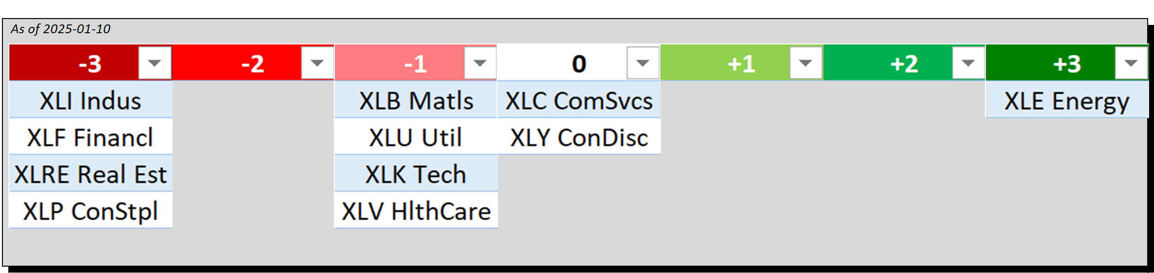 - Bottom row: XLP/Consumer Staples, XLY/Consumer Discretionary, and XLV/Health Care