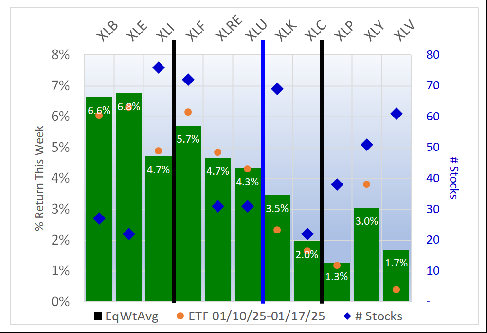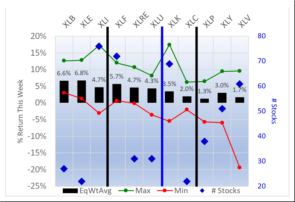 - XLE/Energy, 6.8% average for 22 stocks