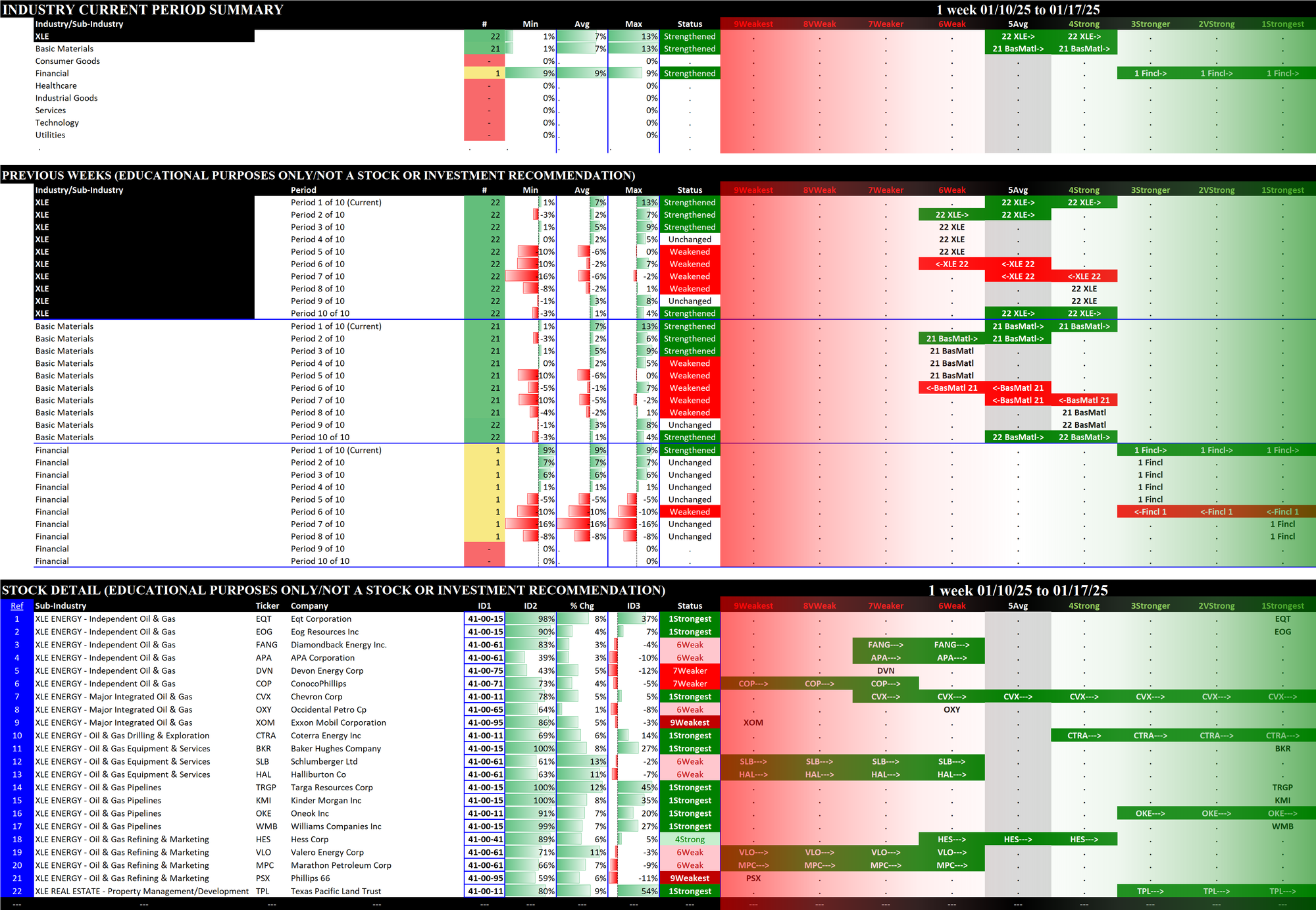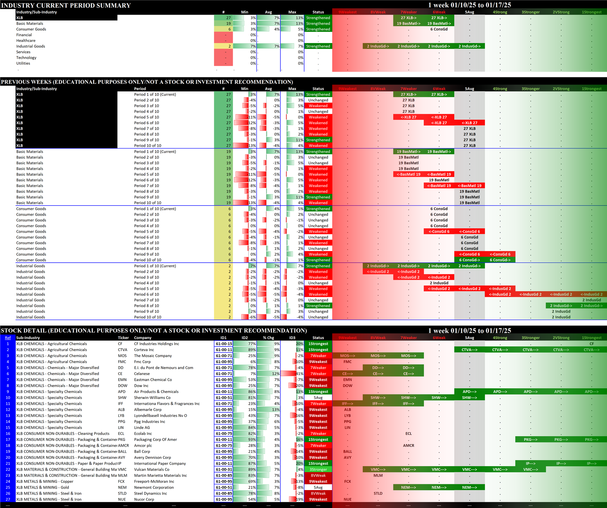 - The middle section shows the previous 10 weeks' strengthening and weakening of the relevant sectors. For example, since the XLB has Basic Materials, Consumer Goods, and Industrial Goods stocks, these three sectors are shown in the middle section of the XLB detail. The XLF (Financial) has Financial, Services, and Tech stocks.