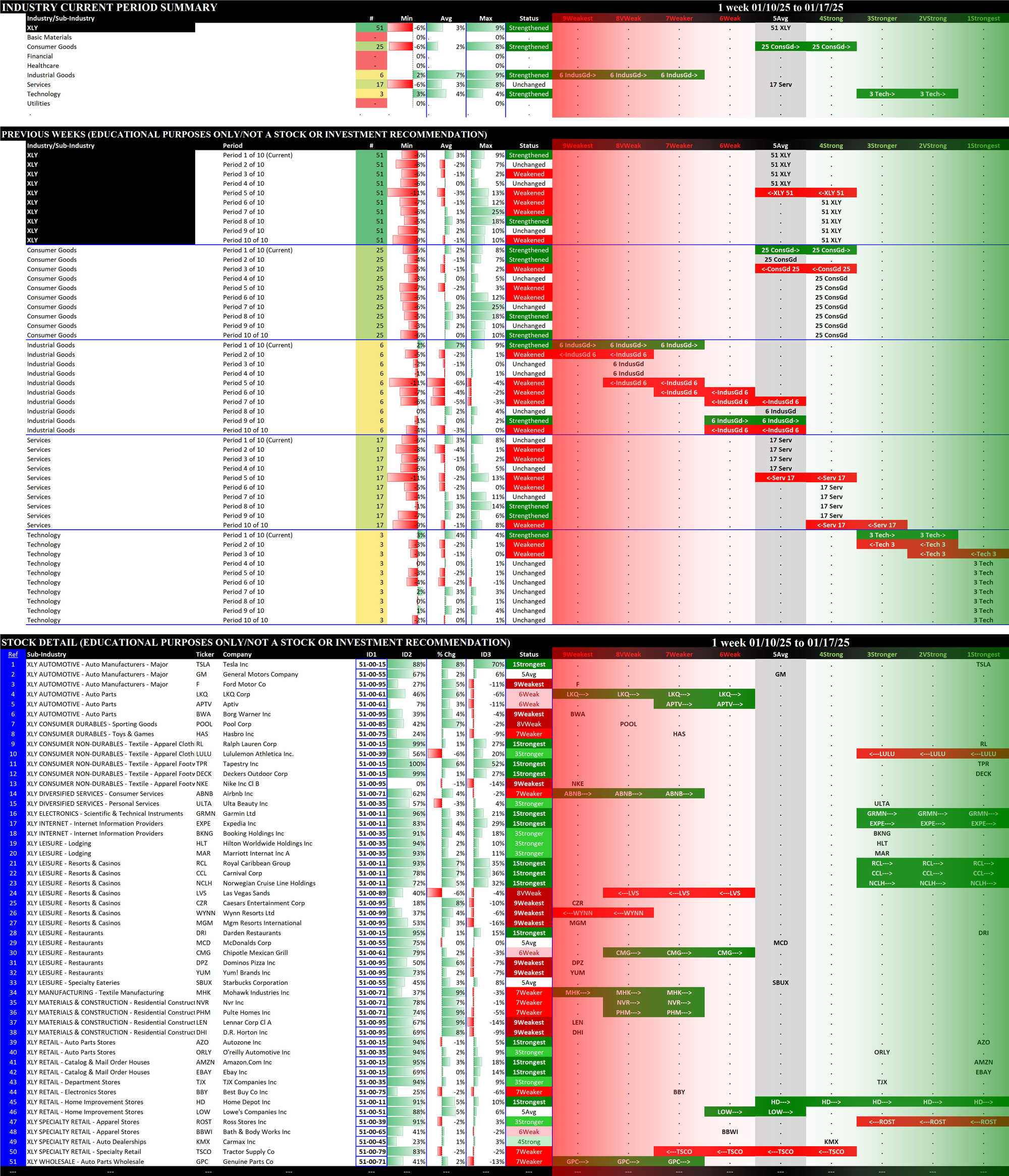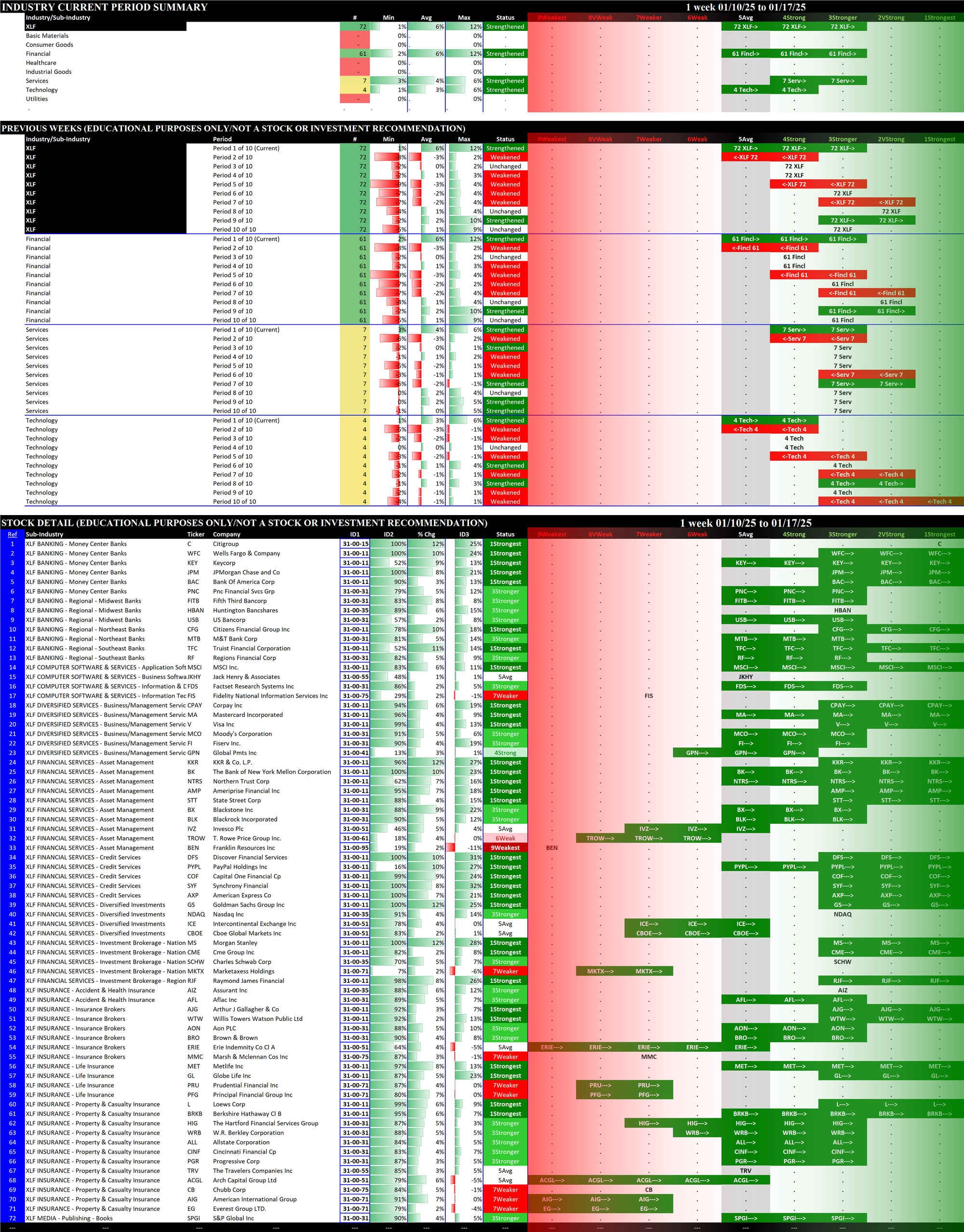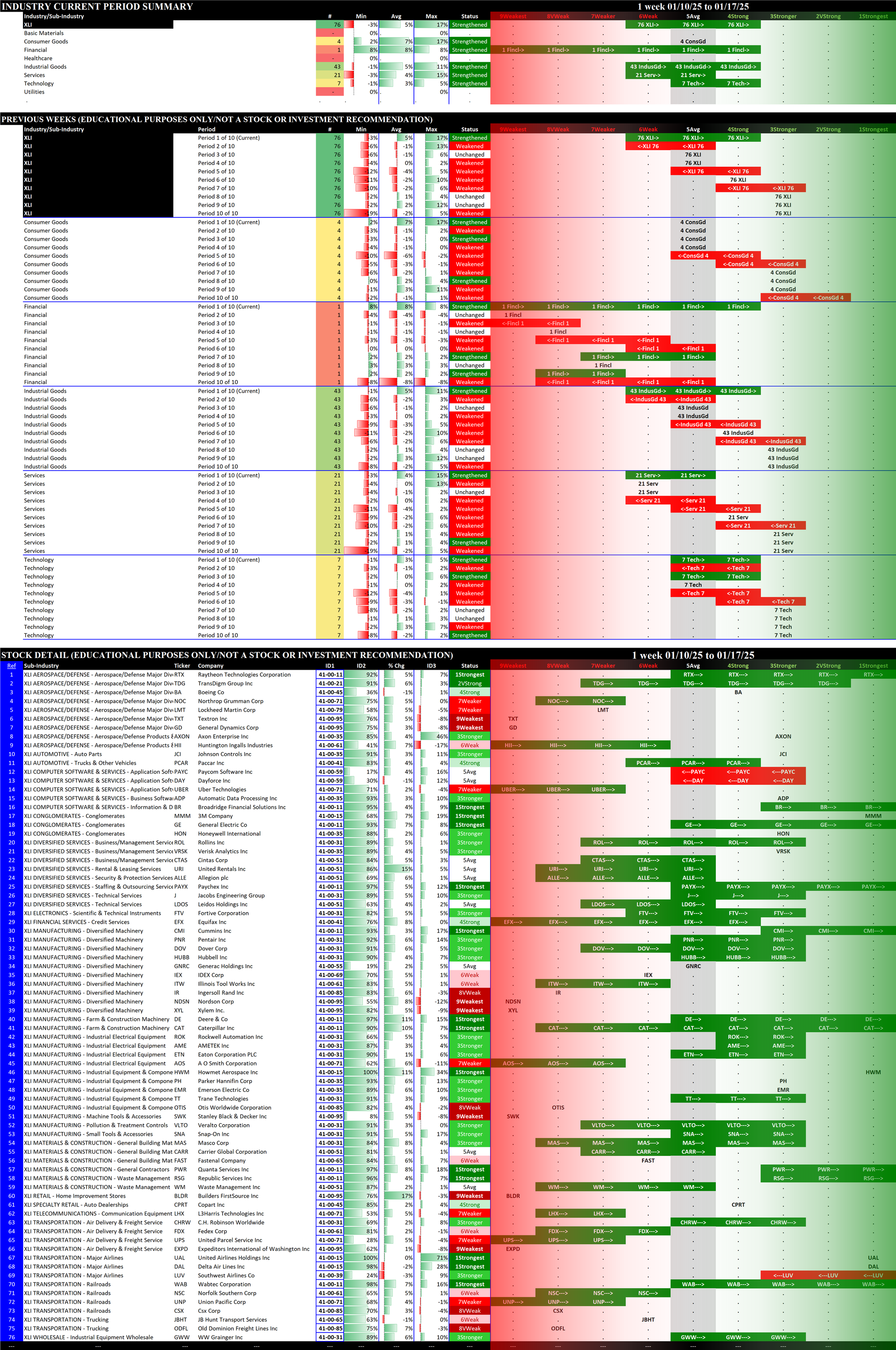 Below are 10-week historical strength rating summaries of the ETFs, sorted by week - each grouping shows one week for all 11 ETFs in newest-to-oldest format. This reveals the weekly strengthening/weakening path of all the ETFs.