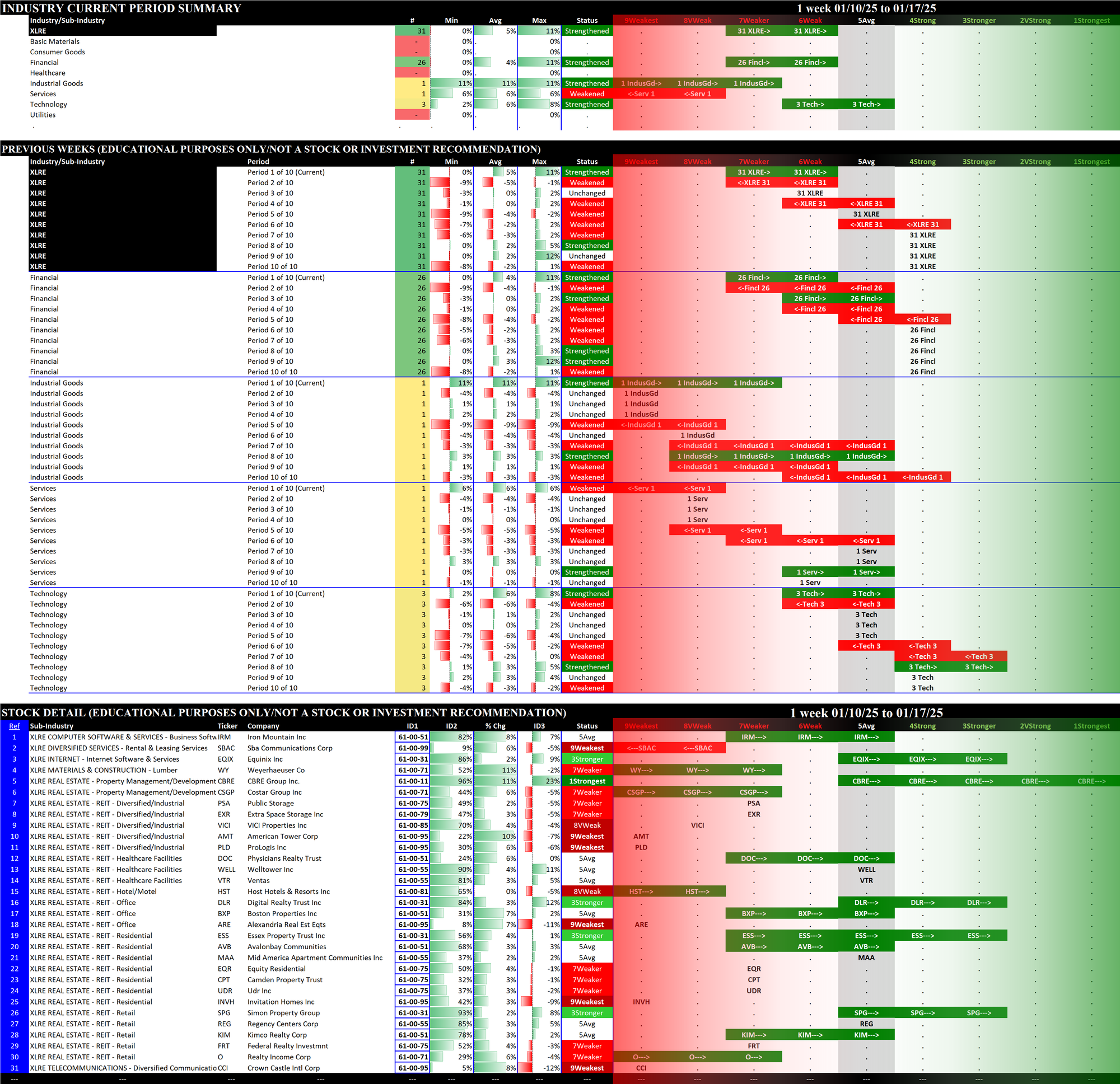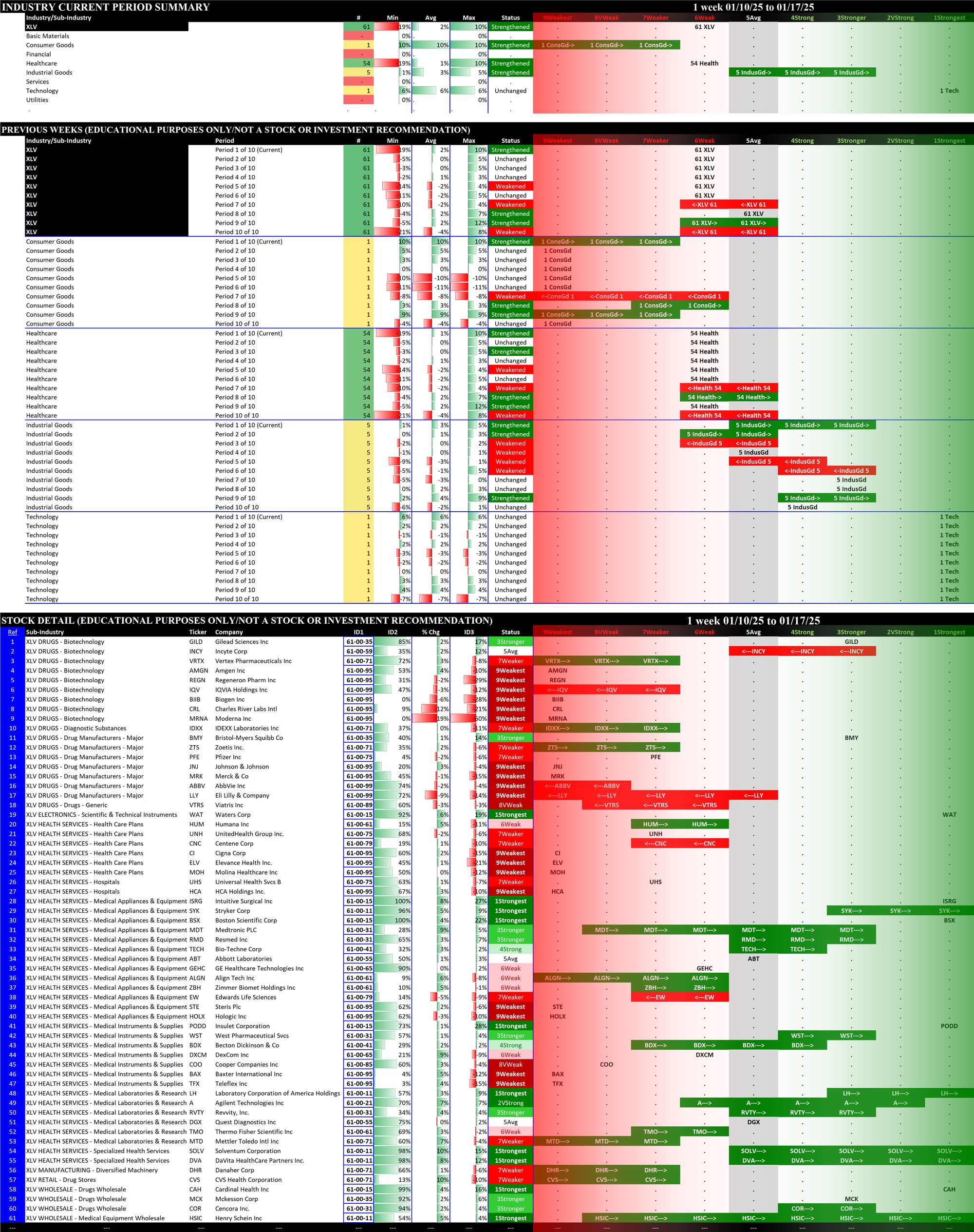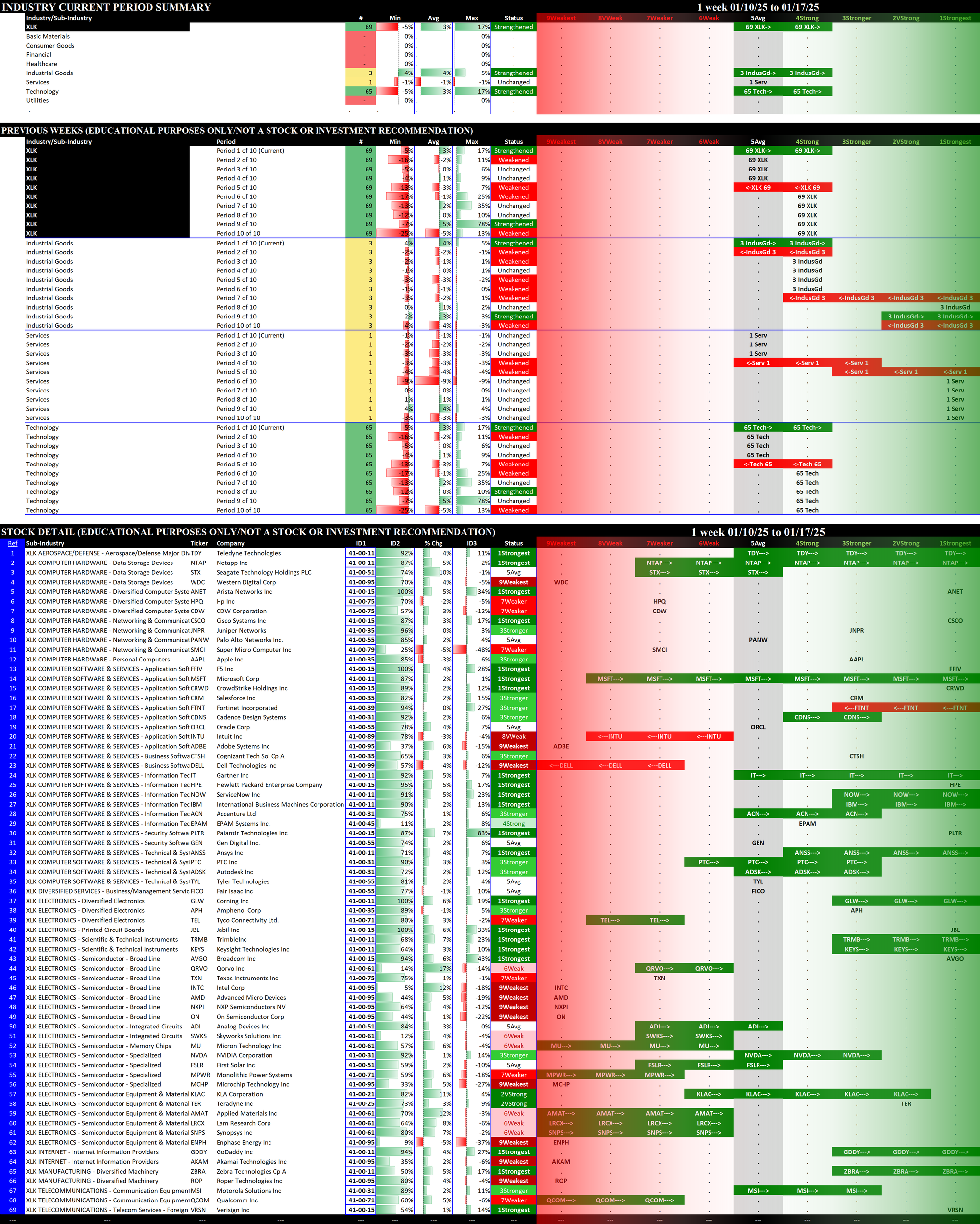 Below are 10-week historical strength rating summaries of the ETFs, sorted by week - each grouping shows one week for all 11 ETFs in newest-to-oldest format. This reveals the weekly strengthening/weakening path of all the ETFs.