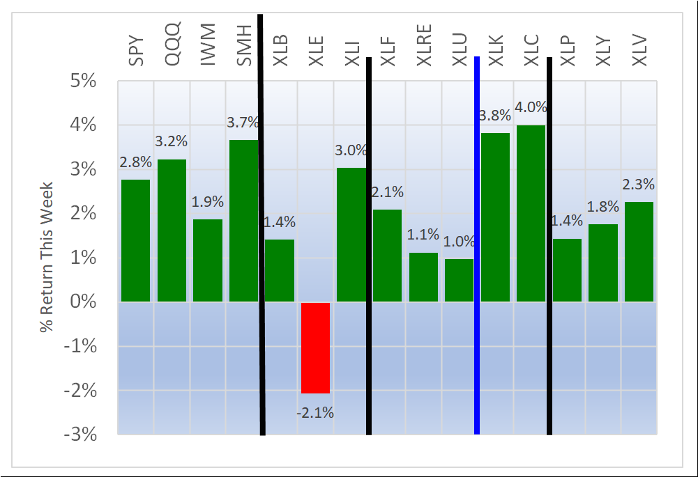 The following pie charts show the breadth of positive and negative returns for the week for the component stocks of each ETF.