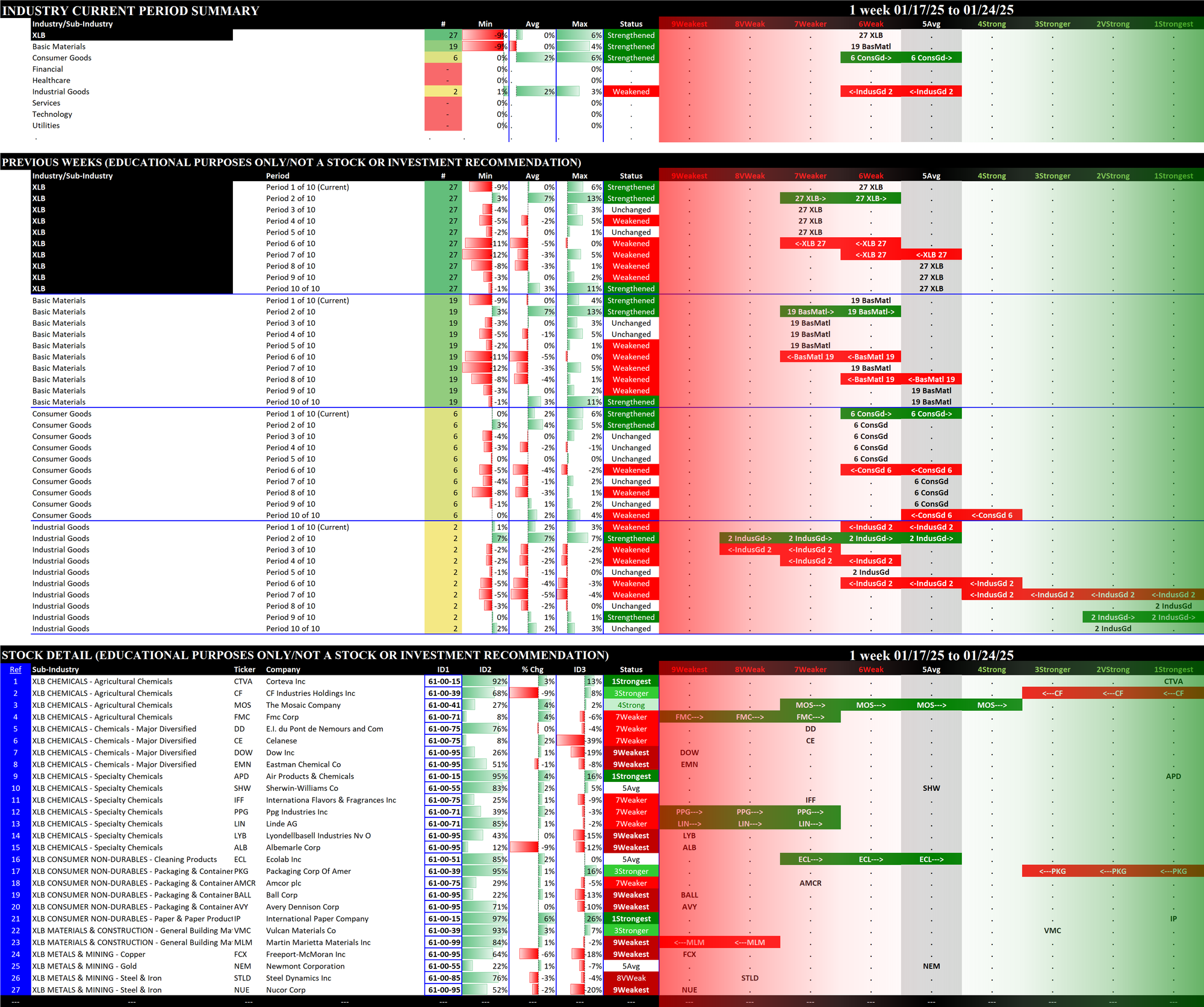 - The bottom section shows strengthening/weakening for the underlying ETF component stocks, and includes the listing of their Stock Market Organizer industries and sub-industries. These stocks are listed in order based on Sub-industry then strongest to weakest comparative stock strength rating. The Basic Materials XLB ETF includes both Newmont Corporation/NEM in the Gold sub-industry within the Metals & Mining industry and Dow Inc./DOW in the Specialty Chemicals sub-industry within the Chemicals industry.