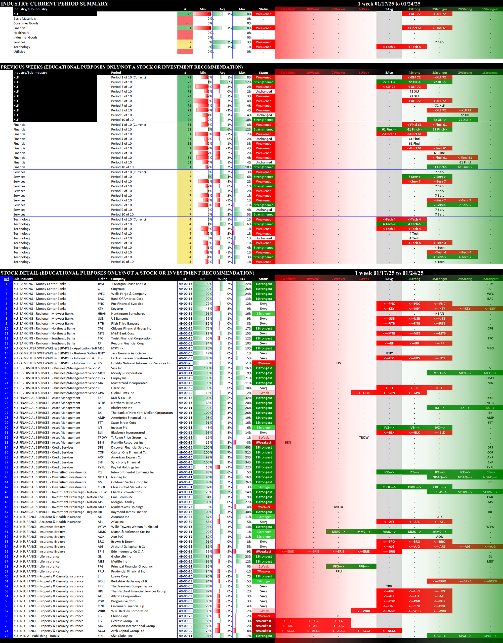 The following Stock Market Organizer strengthening/weakening analysis looks at the 11 SPDR ETFs and their underlying component stocks for the just-completed week, as follows:
