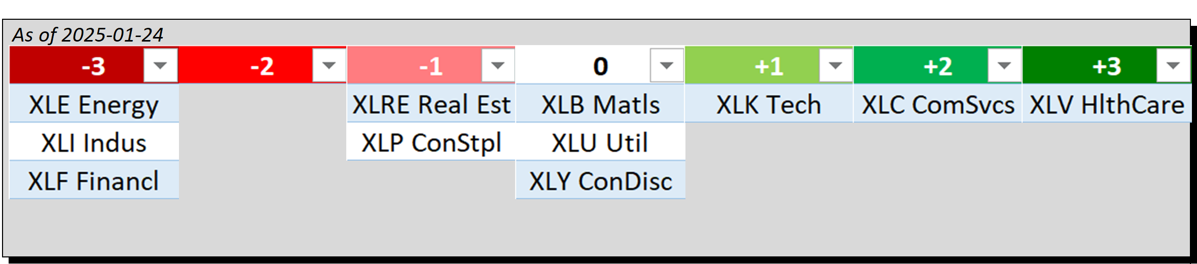 - Bottom row: XLP/Consumer Staples, XLY/Consumer Discretionary, and XLV/Health Care