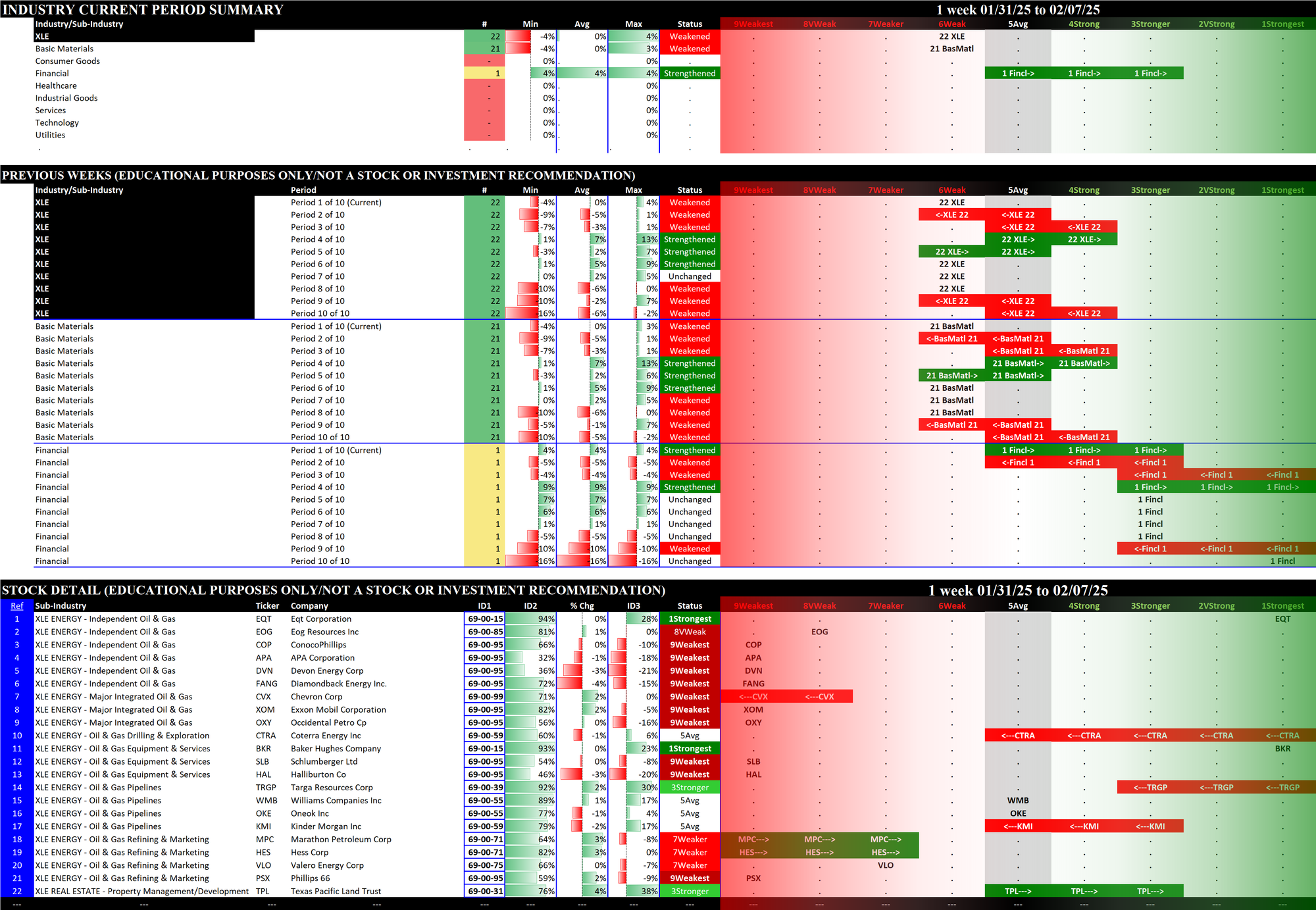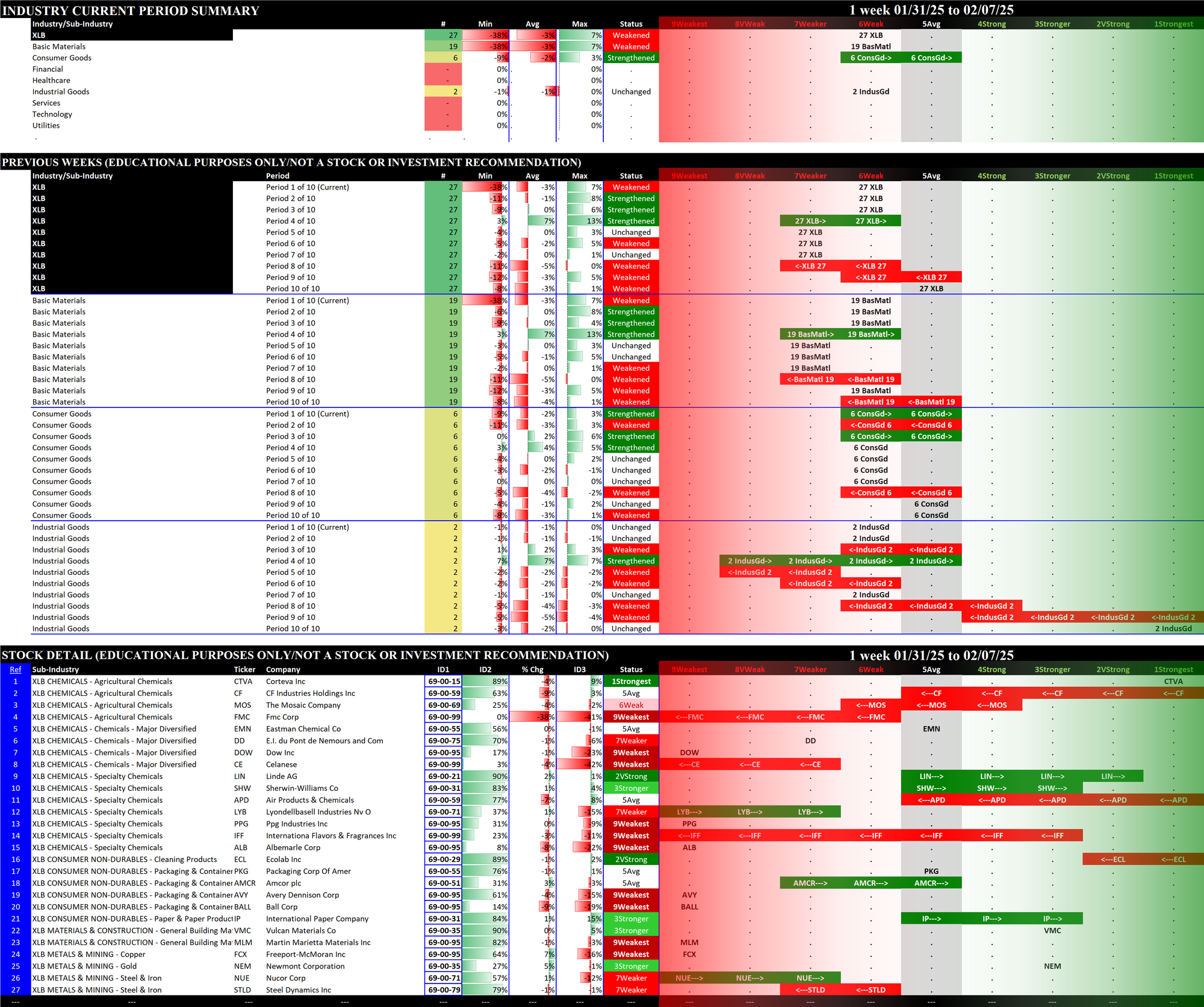 - The middle section shows the previous 10 weeks' strengthening and weakening of the relevant sectors. For example, since the XLB has Basic Materials, Consumer Goods, and Industrial Goods stocks, these three sectors are shown in the middle section of the XLB detail. The XLF (Financial) has Financial, Services, and Tech stocks.