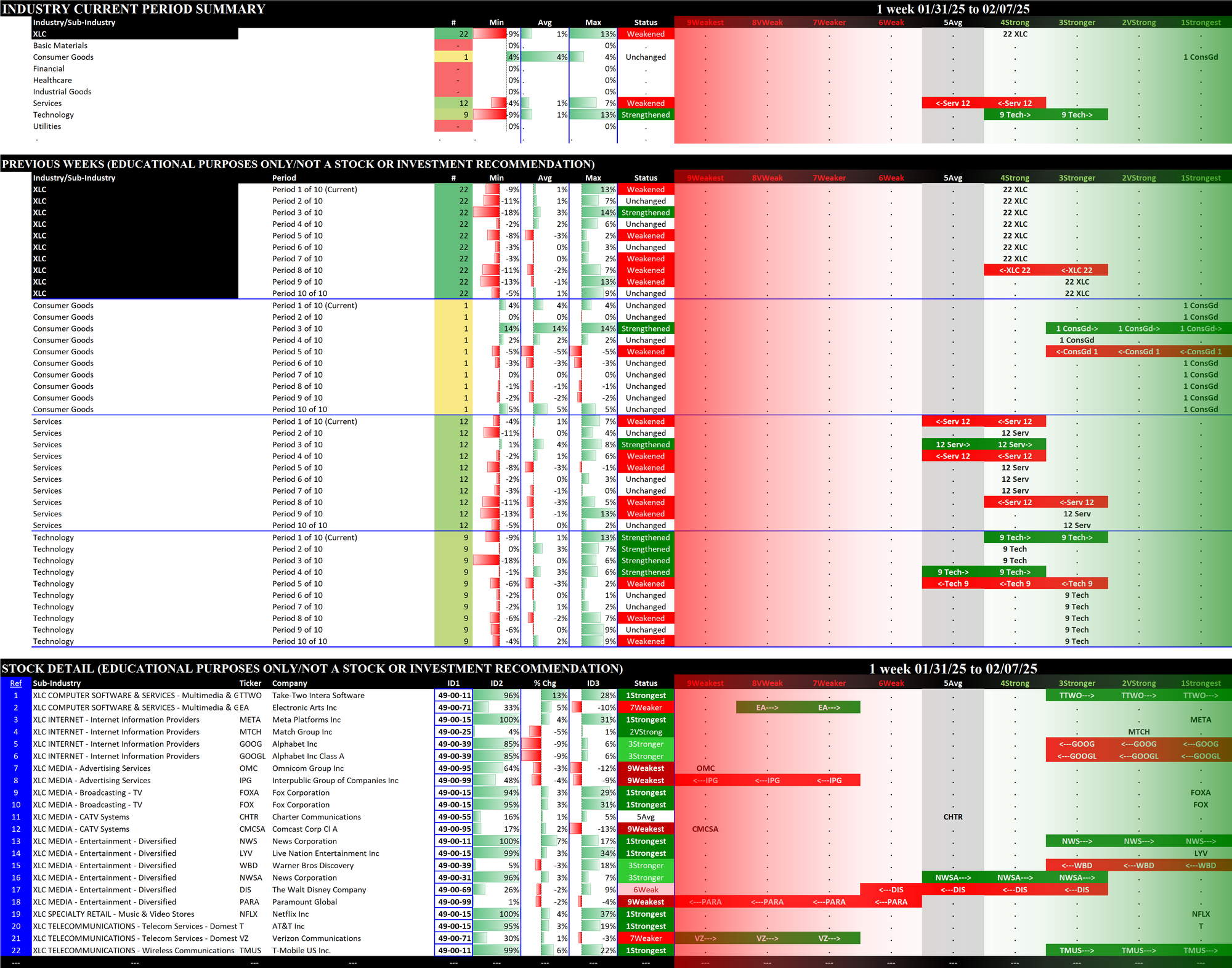 2.2 XLC Communication Services (22 stocks, small), Weakened at 4Strong = tied for BEST
