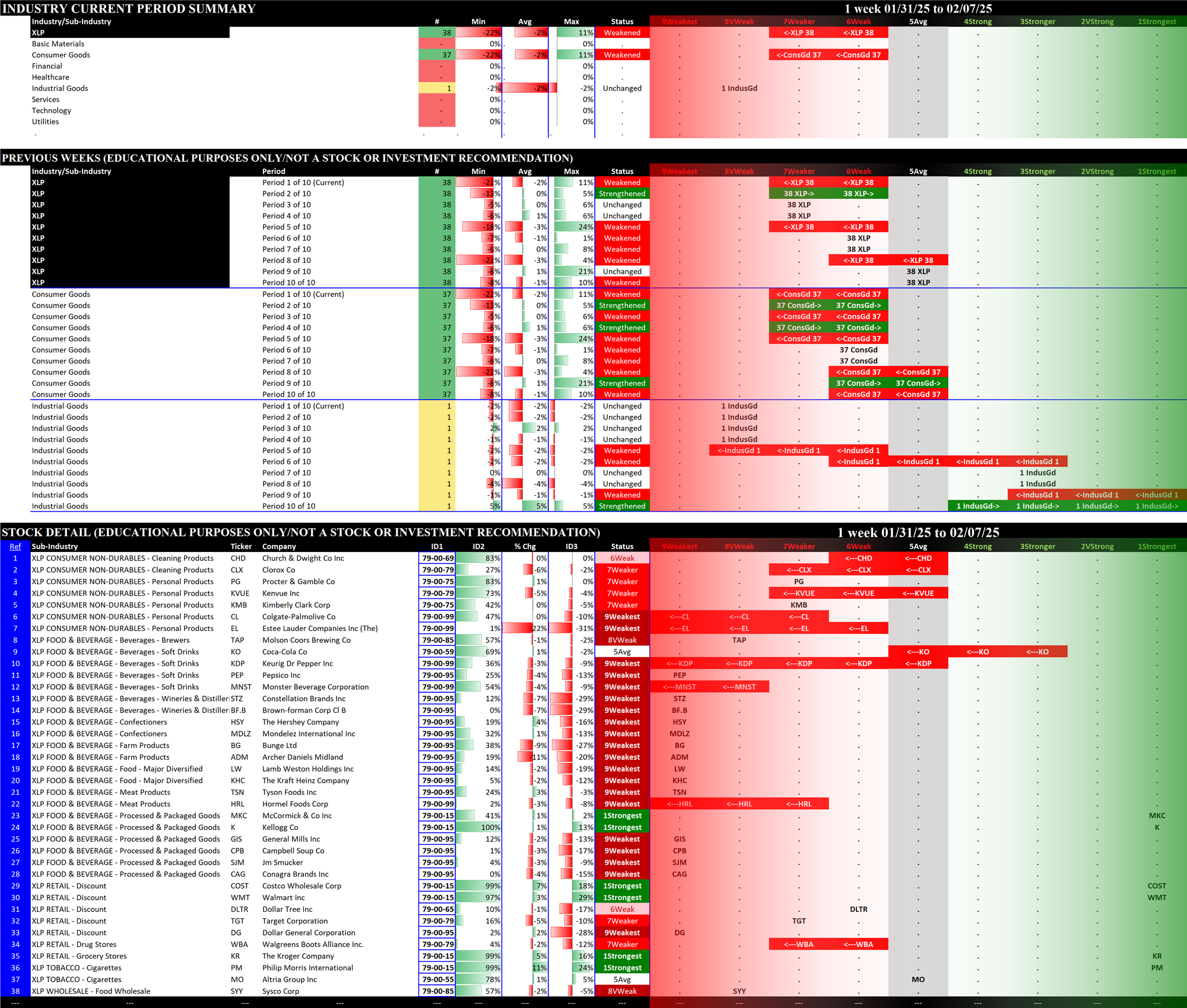 2.7 XLP Consumer Staples (38 stocks, mid-sized), WEAKENED RATING TO 7Weaker = WORST
