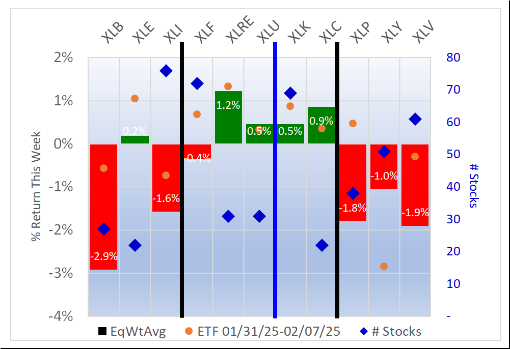 - XLK/Technology, 0.5% average for 69 stocks