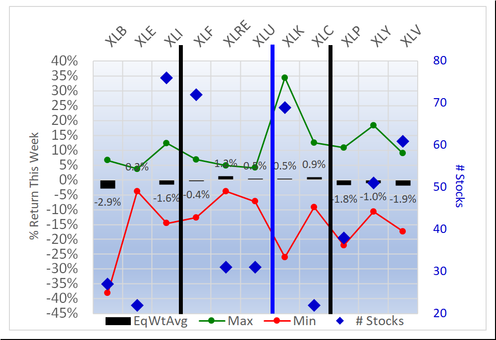 - XLV/Health Care, -1.9% average for 61 stocks