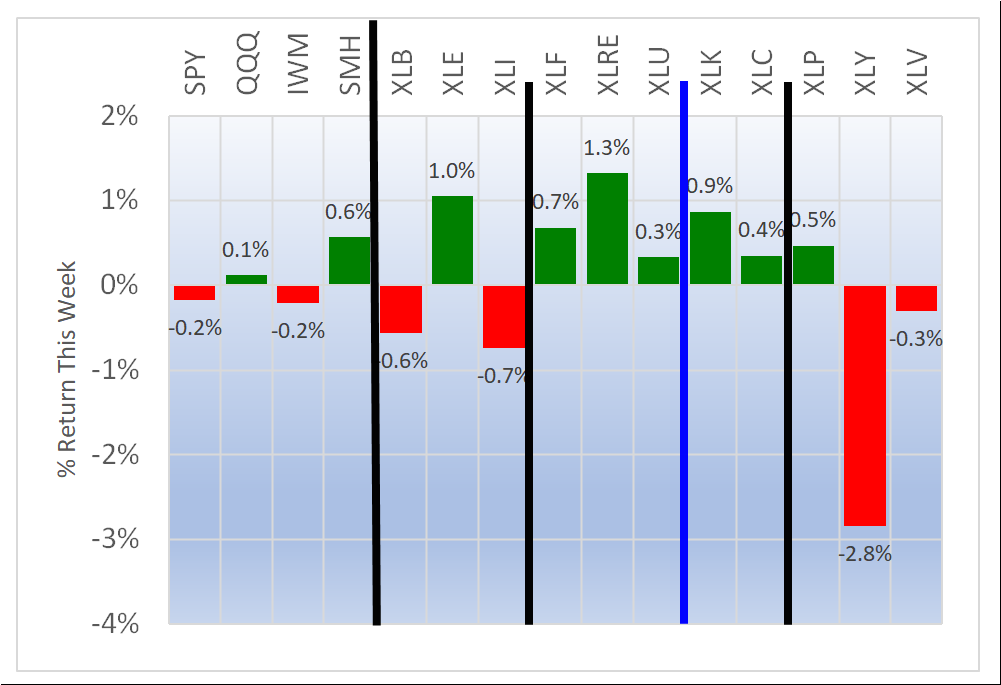 - Second row: interest rate-sensitive ETFs XLF/Financial, XLRE/Real Estate, and XLU/Utilities