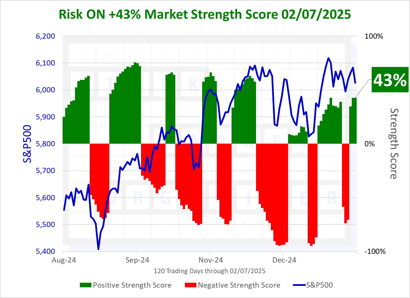 These results are combined with overall market environment readings - the Market Strength Score and the Sector Risk Gauge, which reflect "risk ON" as of Wednesday, February 05, 2025 - to discern appropriate portfolio exposure and risk/position management given prevailing market and sector conditions. Today the Market Strength Score is +43%, not yet near the extreme of -100%. This is not a prediction that it will go to the extreme of -100%, it is simply highlighting where the market is relative to a potential extreme.