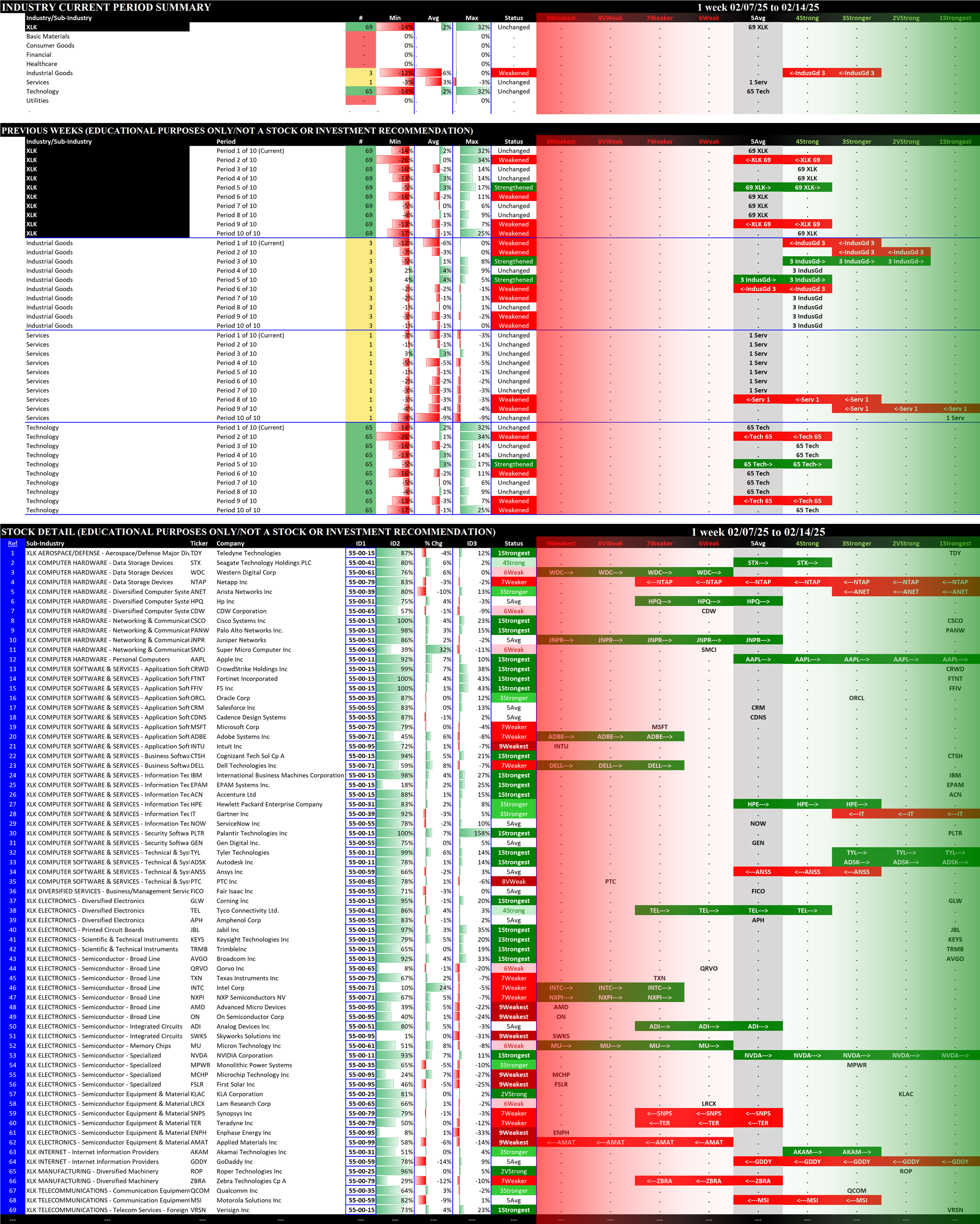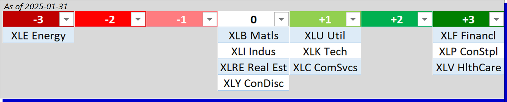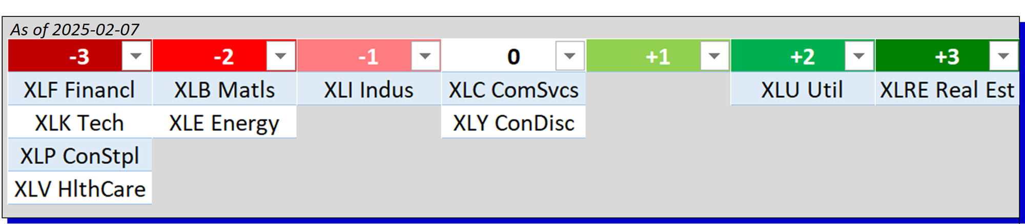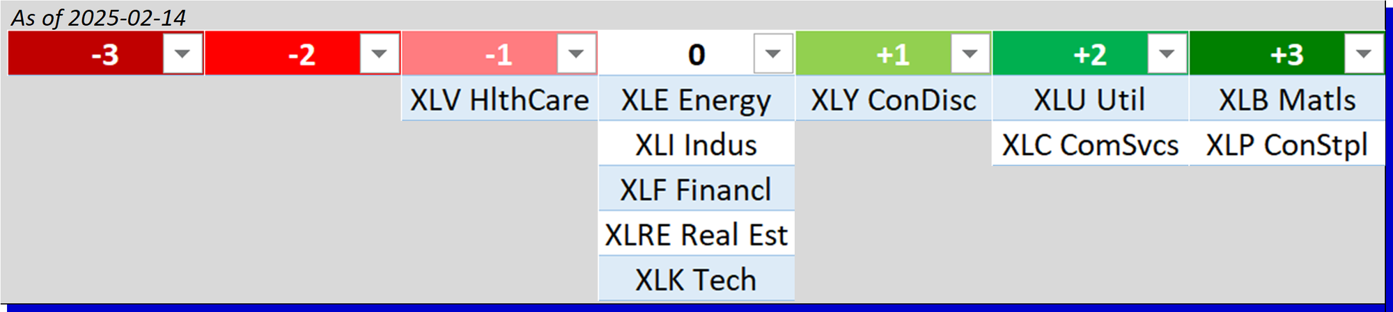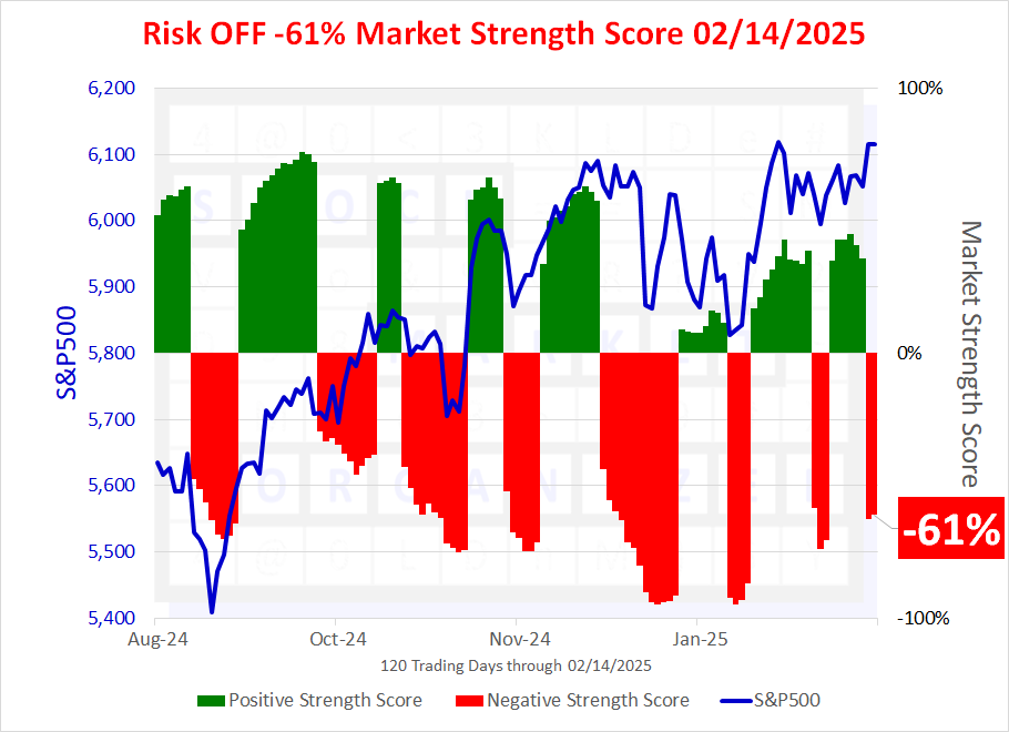 These results are combined with overall market environment readings - the Market Strength Score and the Sector Risk Gauge, which reflect "Risk Off" as of Thursday, February 13, 2025 - to discern appropriate portfolio exposure and risk/position management given prevailing market and sector conditions. Today the Market Strength Score is +61%, not yet near the extreme of -100%. This is not a prediction that it will go to the extreme of -100%, it is simply highlighting where the market is relative to a potential extreme.