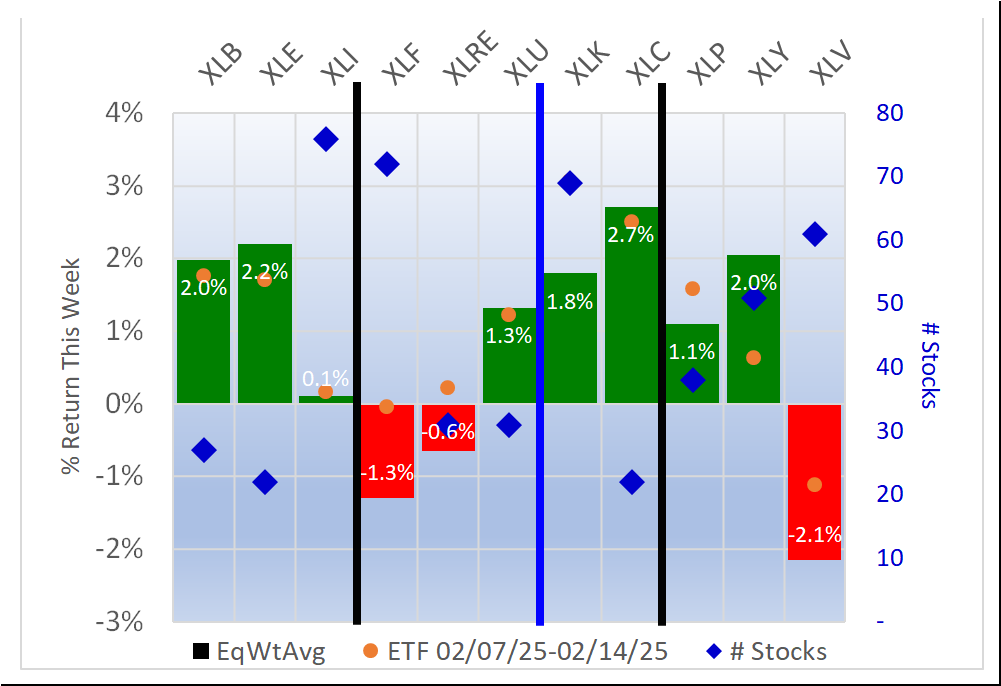 This week's returns for four key indexes are shown along with the actual returns for the 11 ETFs for the week ending Friday, February 14, 2025.