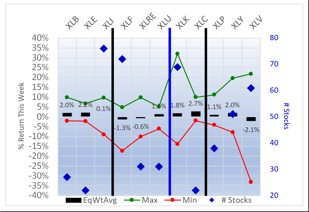 - XLY/Consumer Discretionary, 2.0% average for 51 stocks