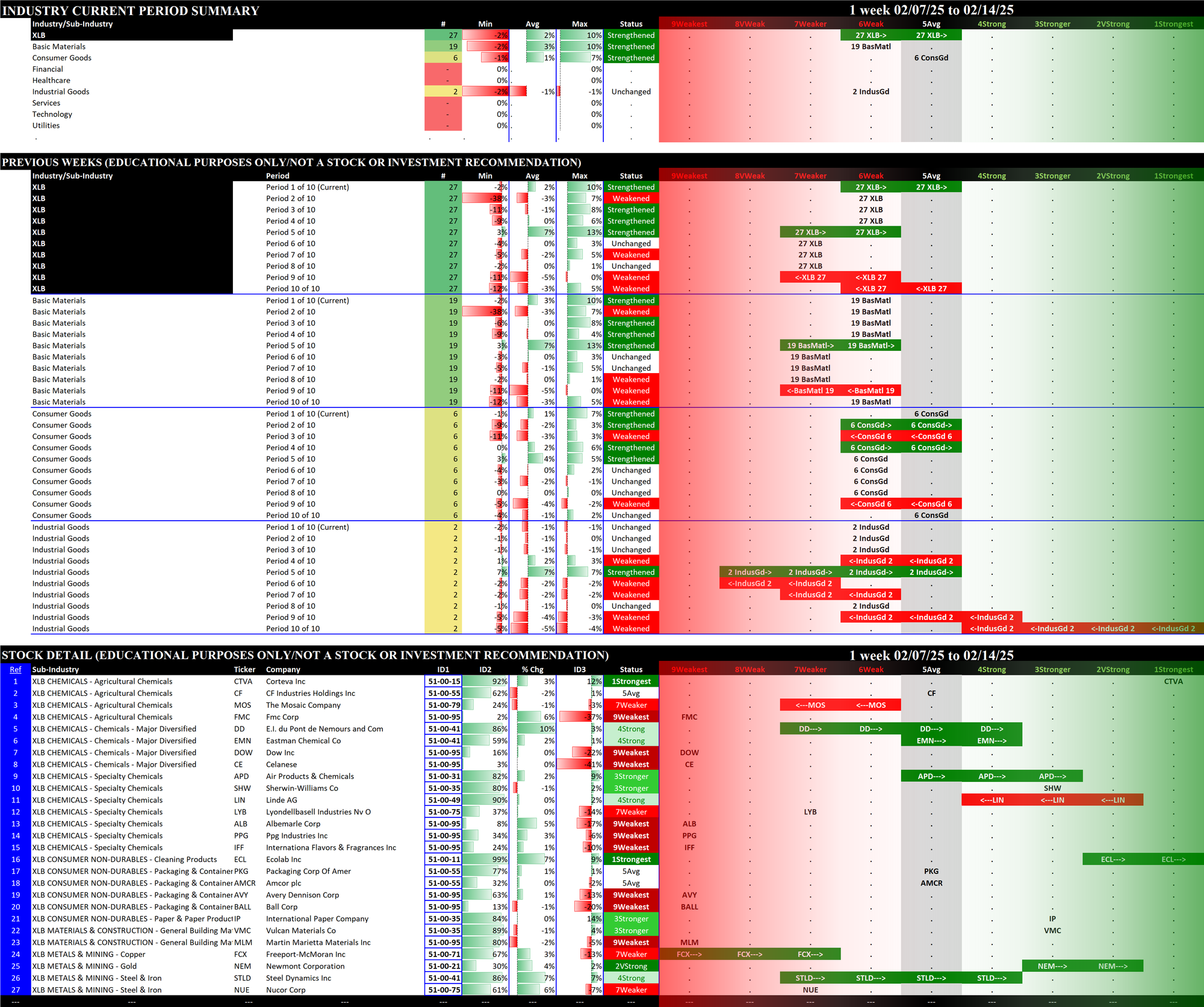 - The bottom section shows strengthening/weakening for the underlying ETF component stocks, and includes the listing of their Stock Market Organizer industries and sub-industries. These stocks are listed in order based on Sub-industry then strongest to weakest comparative stock strength rating. The Basic Materials XLB ETF includes both Newmont Corporation/NEM in the Gold sub-industry within the Metals & Mining industry and Dow Inc./DOW in the Specialty Chemicals sub-industry within the Chemicals industry.