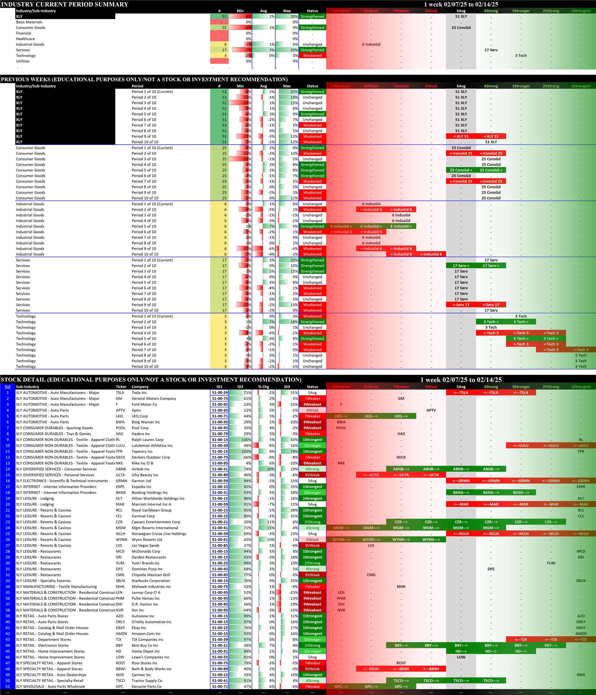- The middle section shows the previous 10 weeks' strengthening and weakening of the relevant sectors. For example, since the XLB has Basic Materials, Consumer Goods, and Industrial Goods stocks, these three sectors are shown in the middle section of the XLB detail. The XLF (Financial) has Financial, Services, and Tech stocks.