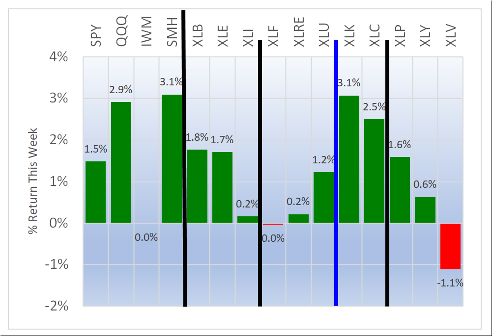 - Second row: interest rate-sensitive ETFs XLF/Financial, XLRE/Real Estate, and XLU/Utilities