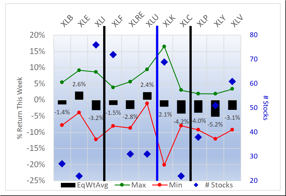 - XLP/Consumer Staples, -4.0% average for 38 stocks