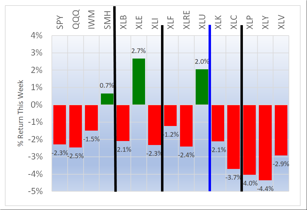 - Second row: interest rate-sensitive ETFs XLF/Financial, XLRE/Real Estate, and XLU/Utilities