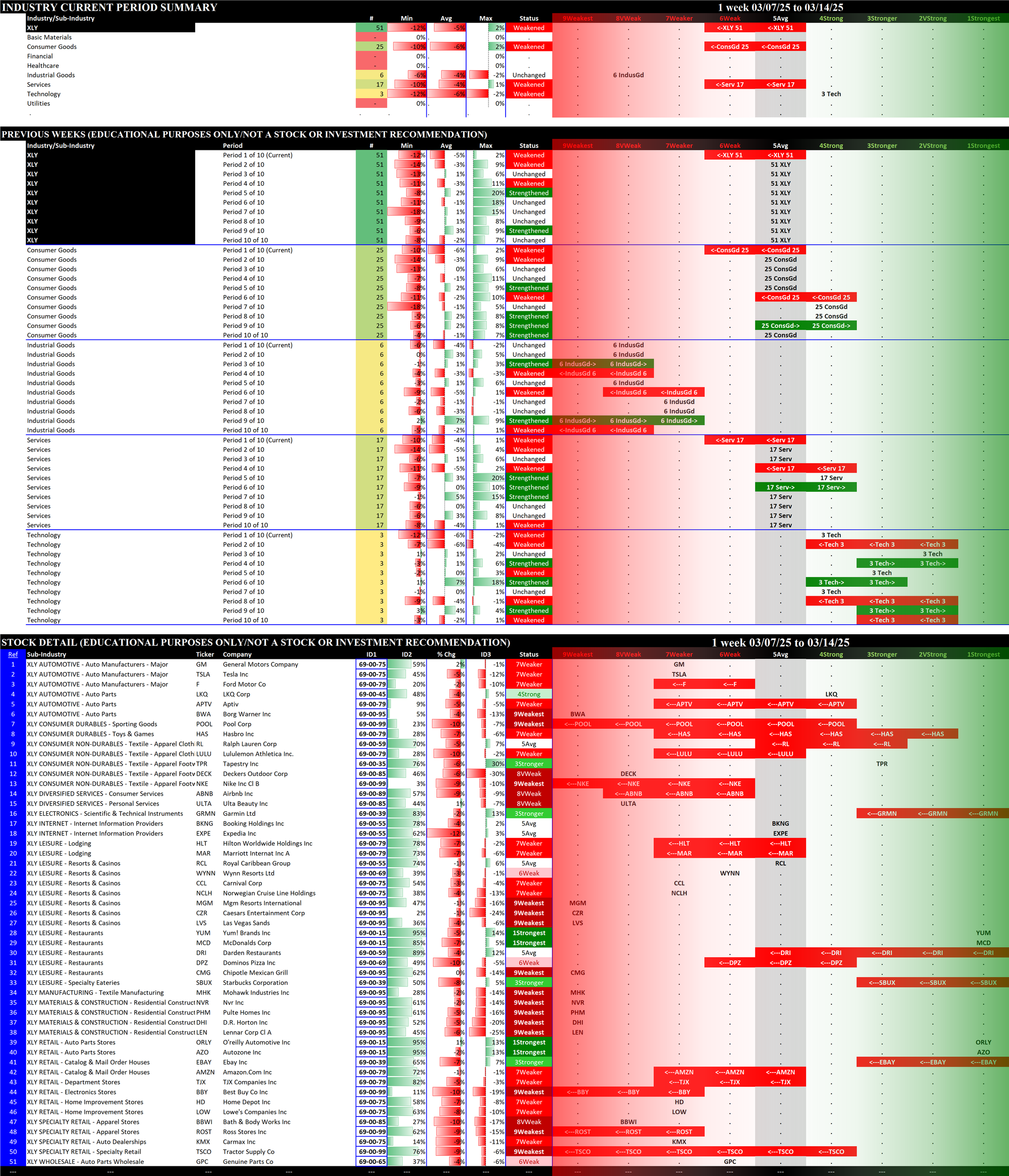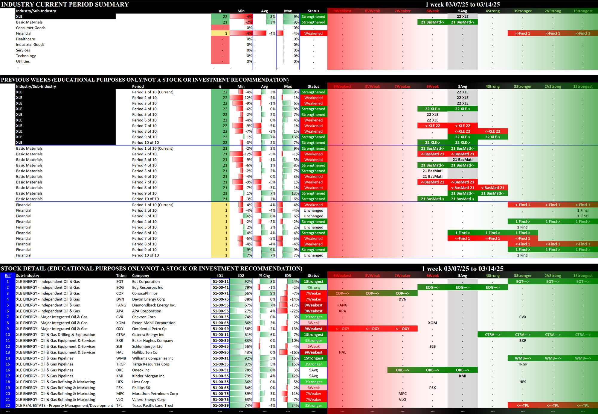 - The middle section shows the previous 10 weeks' strengthening and weakening of the relevant sectors. For example, since the XLB has Basic Materials, Consumer Goods, and Industrial Goods stocks, these three sectors are shown in the middle section of the XLB detail. The XLF (Financial) has Financial, Services, and Tech stocks.