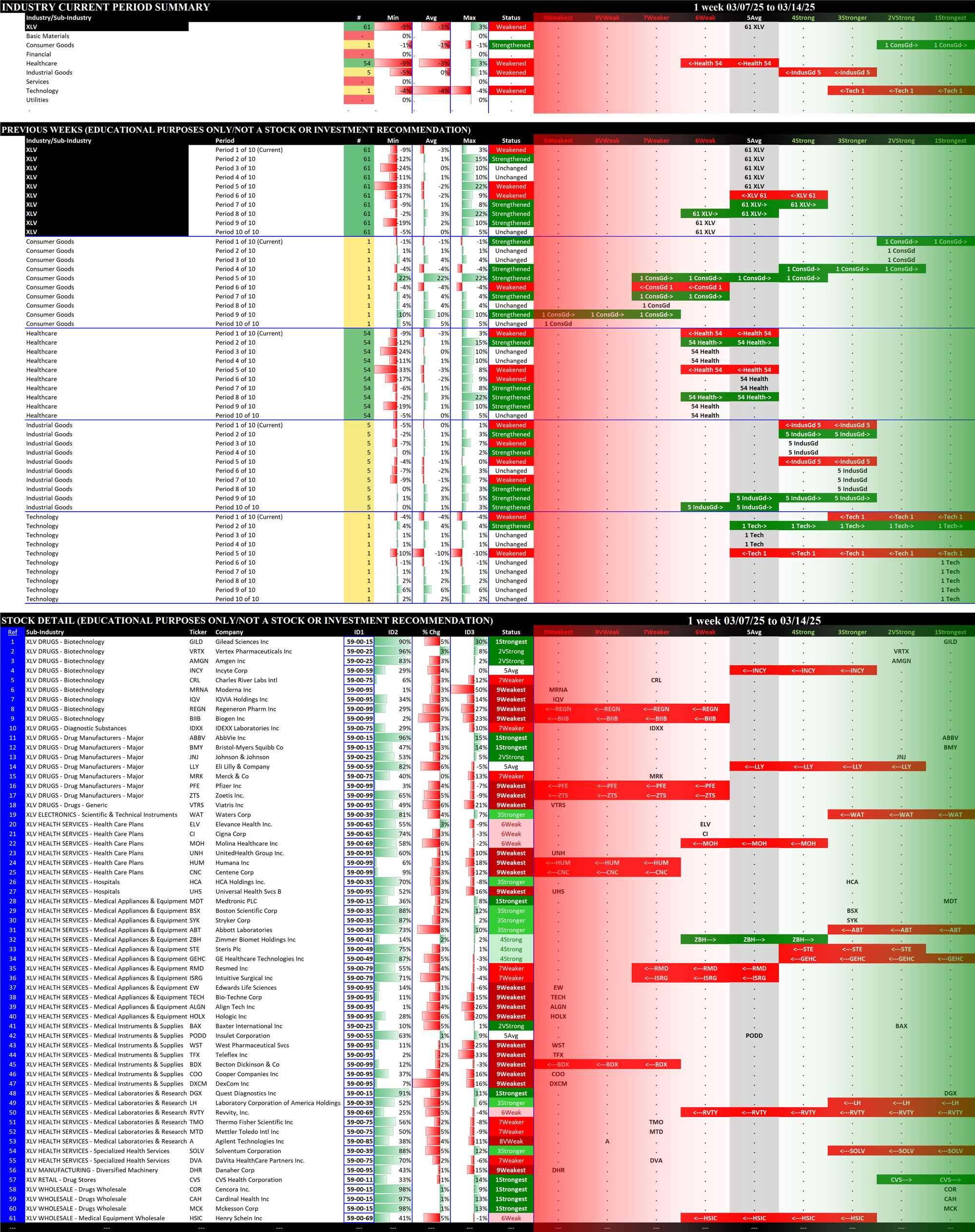 The downloadable PDF below lists all component stocks in order of first Strongest to Weakest ETF and second Strongest to Weakest Stock. The difference between this report and the 11 ETF stock listings above is this report consolidates all component stocks whereas the above listings are segregated by ETF.