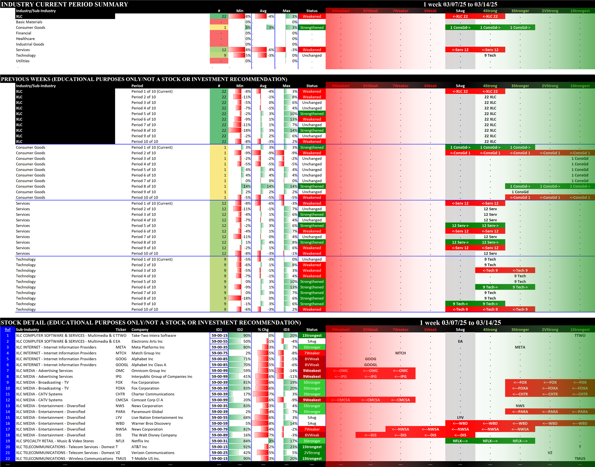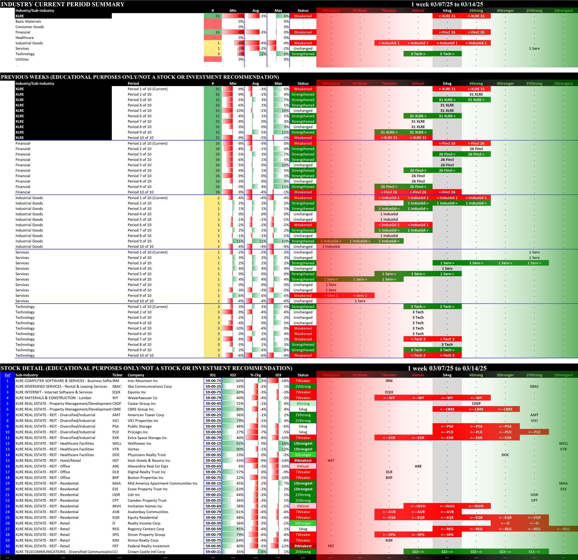 These results are combined with overall market environment readings - the Market Strength Score and the Sector Risk Gauge, which reflect "Risk On" as of Friday, March 14, 2025 - to discern appropriate portfolio exposure and risk/position management given prevailing market and sector conditions. Today the Market Strength Score is +6%, an early reading. This is not a prediction that it will go to the extreme of +100%, it is simply highlighting where the market is relative to a potential extreme.