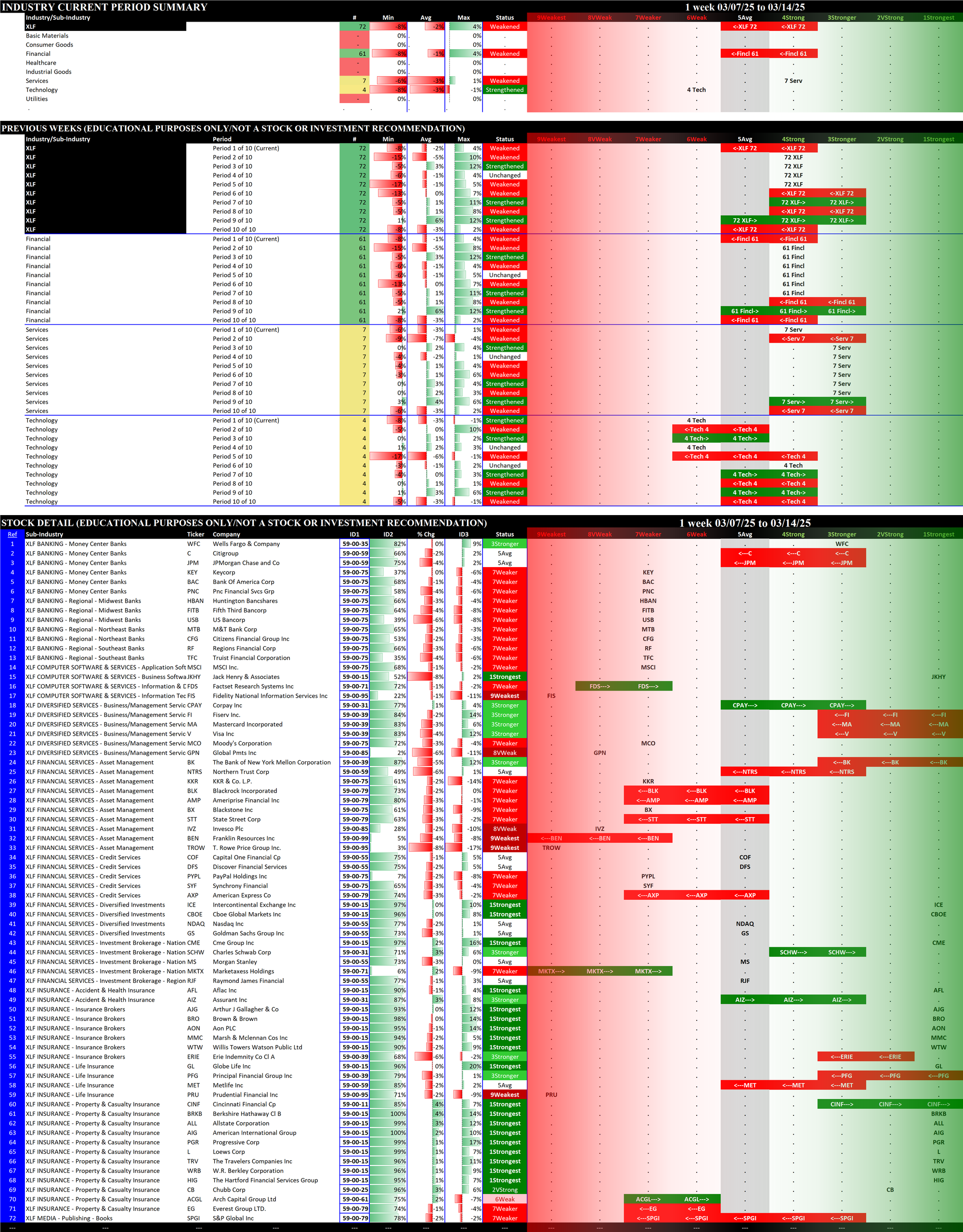 The following Stock Market Organizer strengthening/weakening analysis looks at the 11 SPDR ETFs and their underlying component stocks for the just-completed week, as follows: