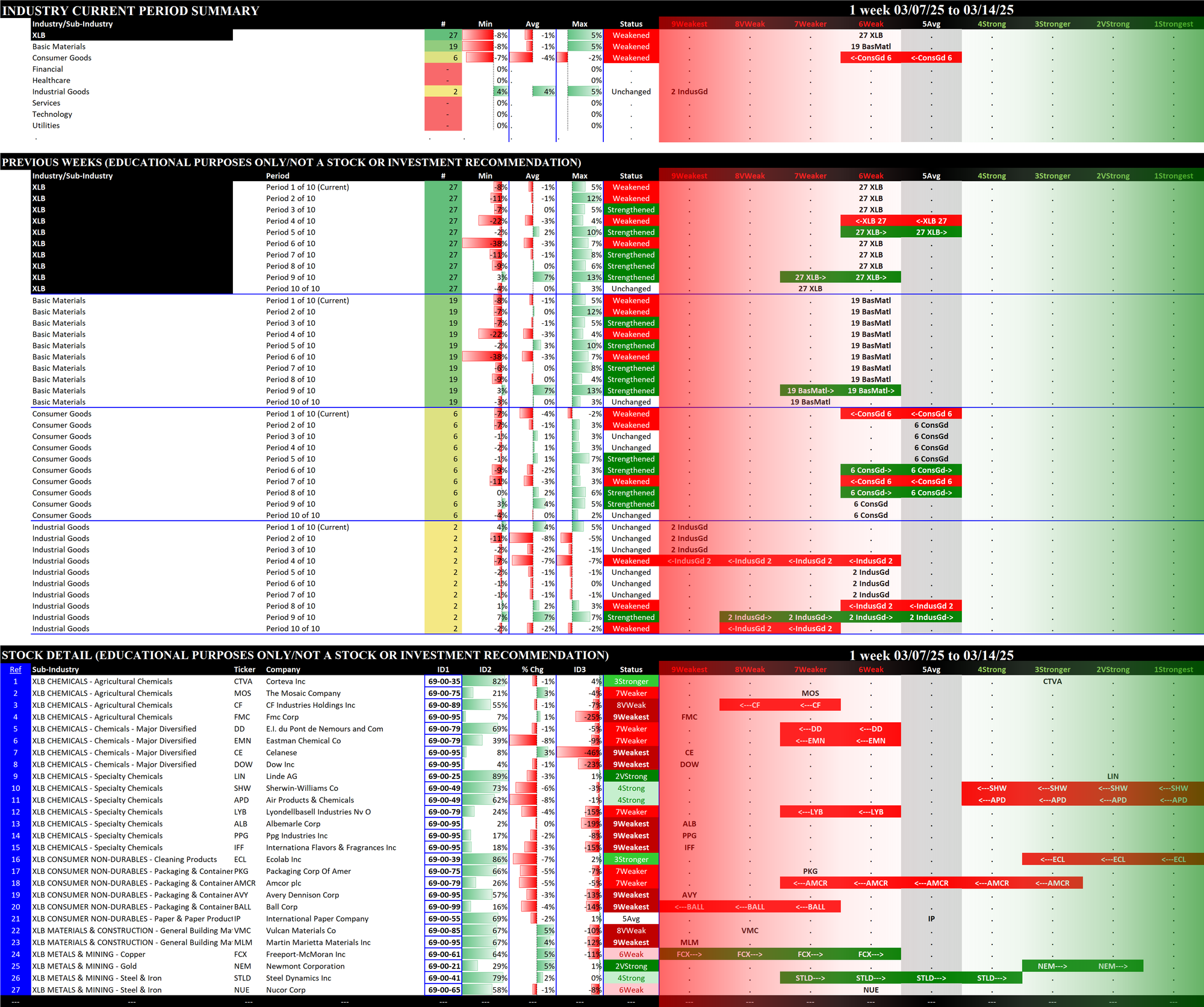 - The bottom section shows strengthening/weakening for the underlying ETF component stocks, and includes the listing of their Stock Market Organizer industries and sub-industries. These stocks are listed in order based on Sub-industry then strongest to weakest comparative stock strength rating. The Basic Materials XLB ETF includes both Newmont Corporation/NEM in the Gold sub-industry within the Metals & Mining industry and Dow Inc./DOW in the Specialty Chemicals sub-industry within the Chemicals industry.