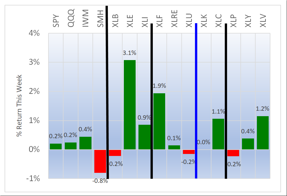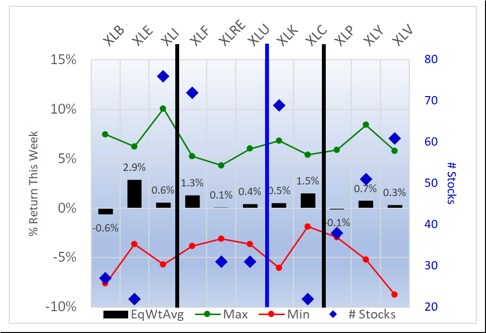 - XLE/Energy, 2.9% average for 22 stocks
