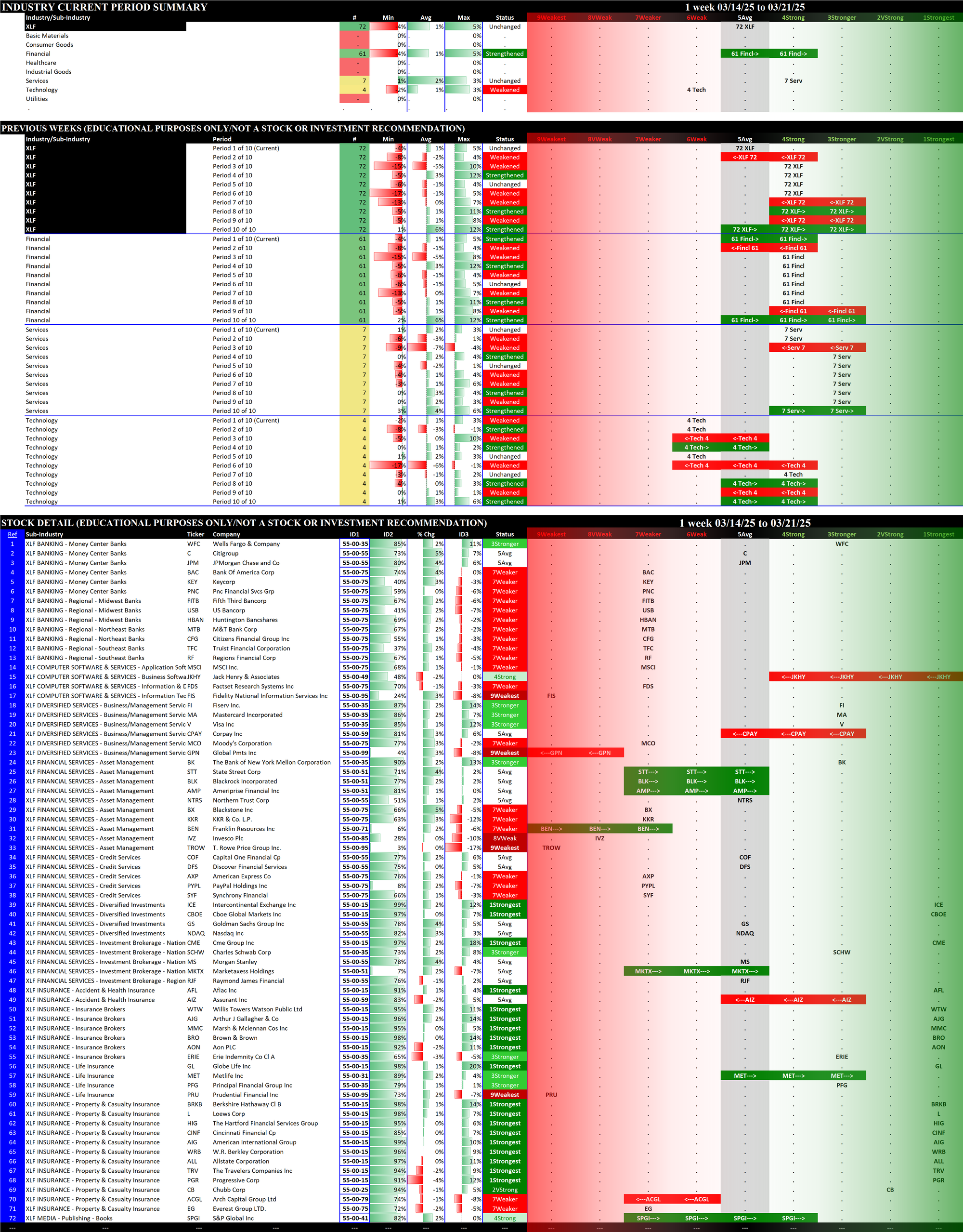 Below are 10-week historical strength rating summaries of the ETFs, sorted by week - each grouping shows one week for all 11 ETFs in newest-to-oldest format. This reveals the weekly strengthening/weakening path of all the ETFs.