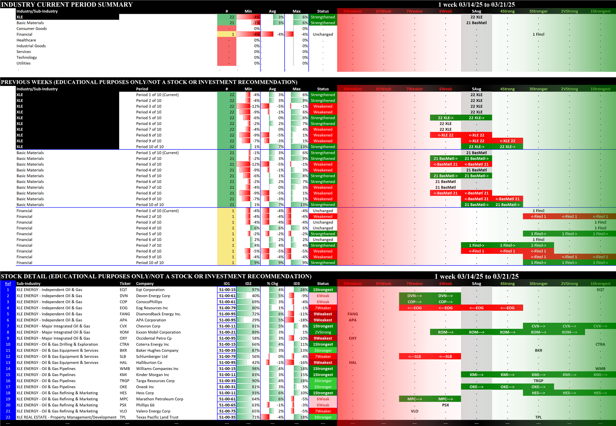 - The middle section shows the previous 10 weeks' strengthening and weakening of the relevant sectors. For example, since the XLB has Basic Materials, Consumer Goods, and Industrial Goods stocks, these three sectors are shown in the middle section of the XLB detail. The XLF (Financial) has Financial, Services, and Tech stocks.