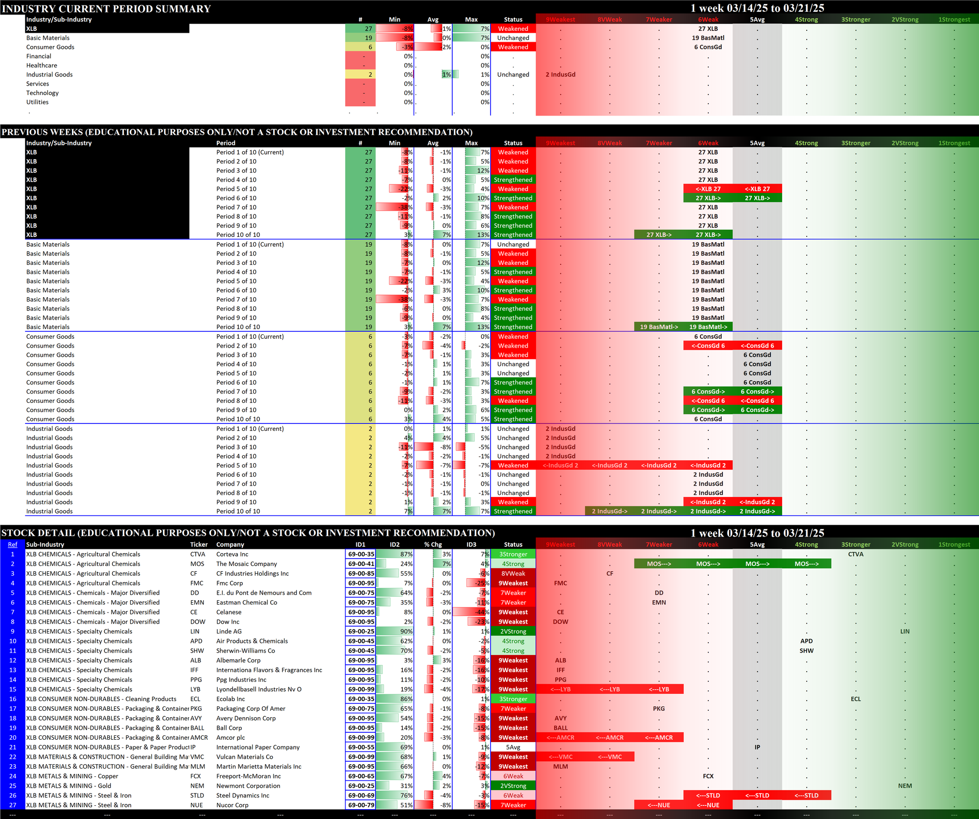 - The bottom section shows strengthening/weakening for the underlying ETF component stocks, and includes the listing of their Stock Market Organizer industries and sub-industries. These stocks are listed in order based on Sub-industry then strongest to weakest comparative stock strength rating. The Basic Materials XLB ETF includes both Newmont Corporation/NEM in the Gold sub-industry within the Metals & Mining industry and Dow Inc./DOW in the Specialty Chemicals sub-industry within the Chemicals industry.
