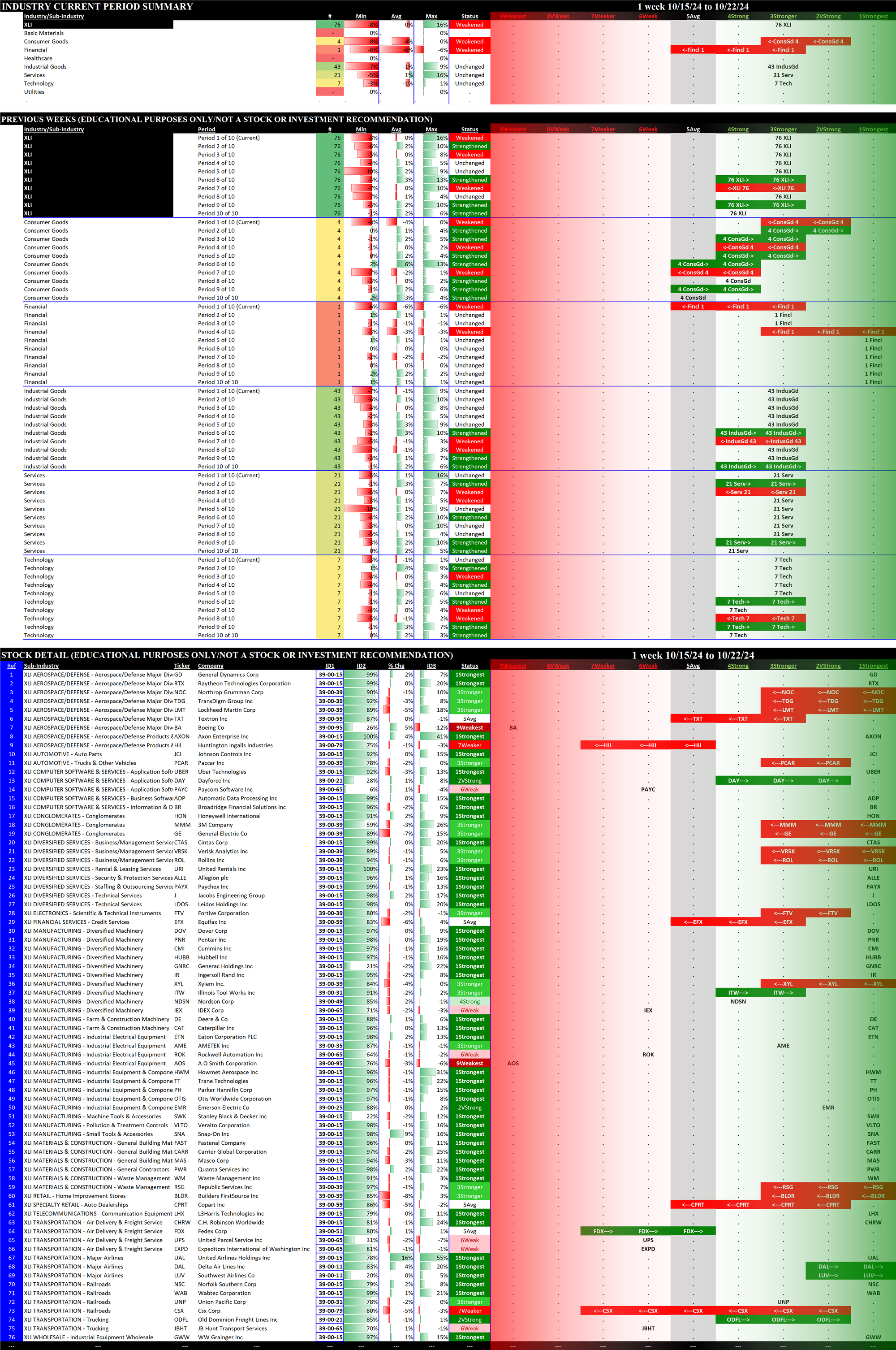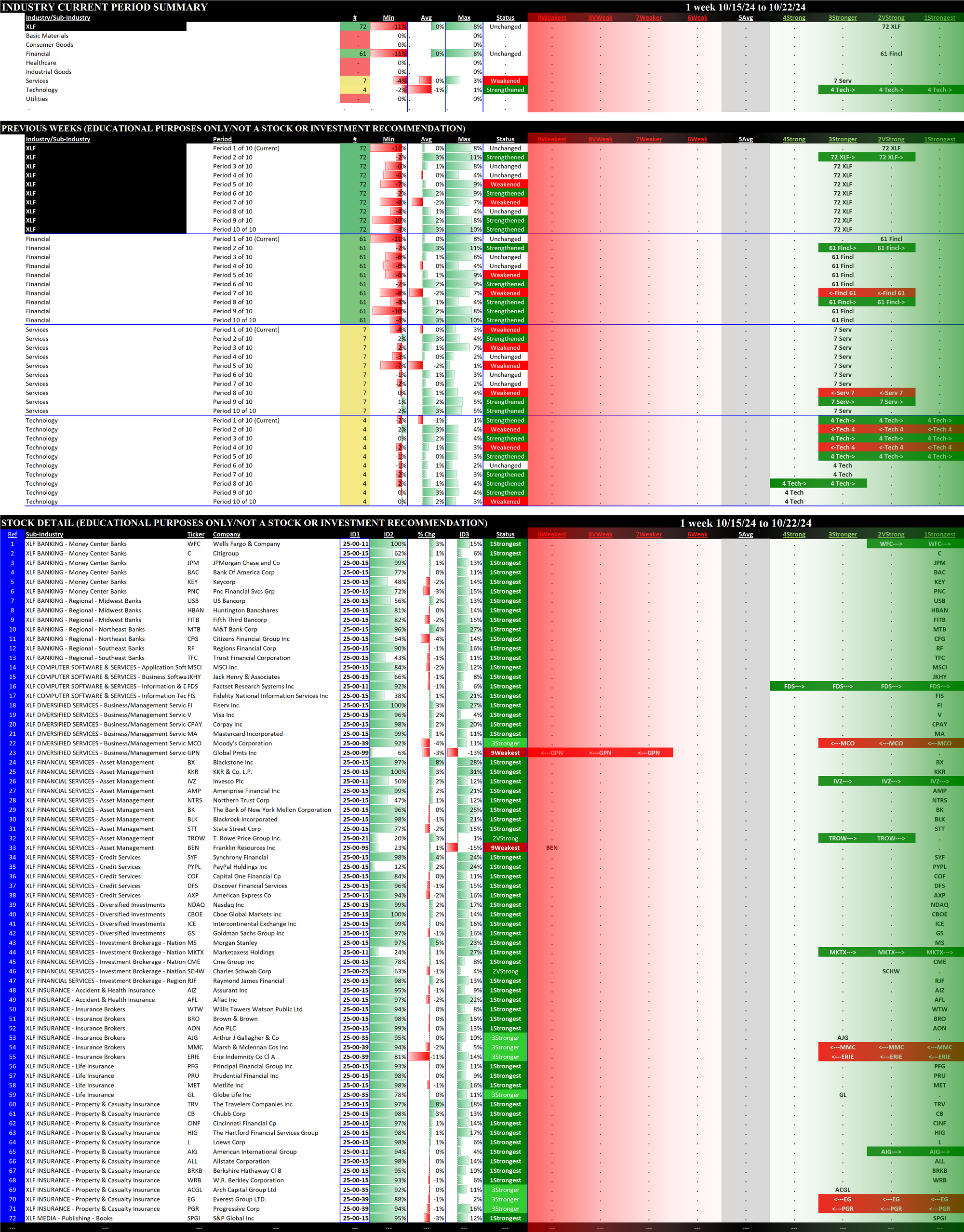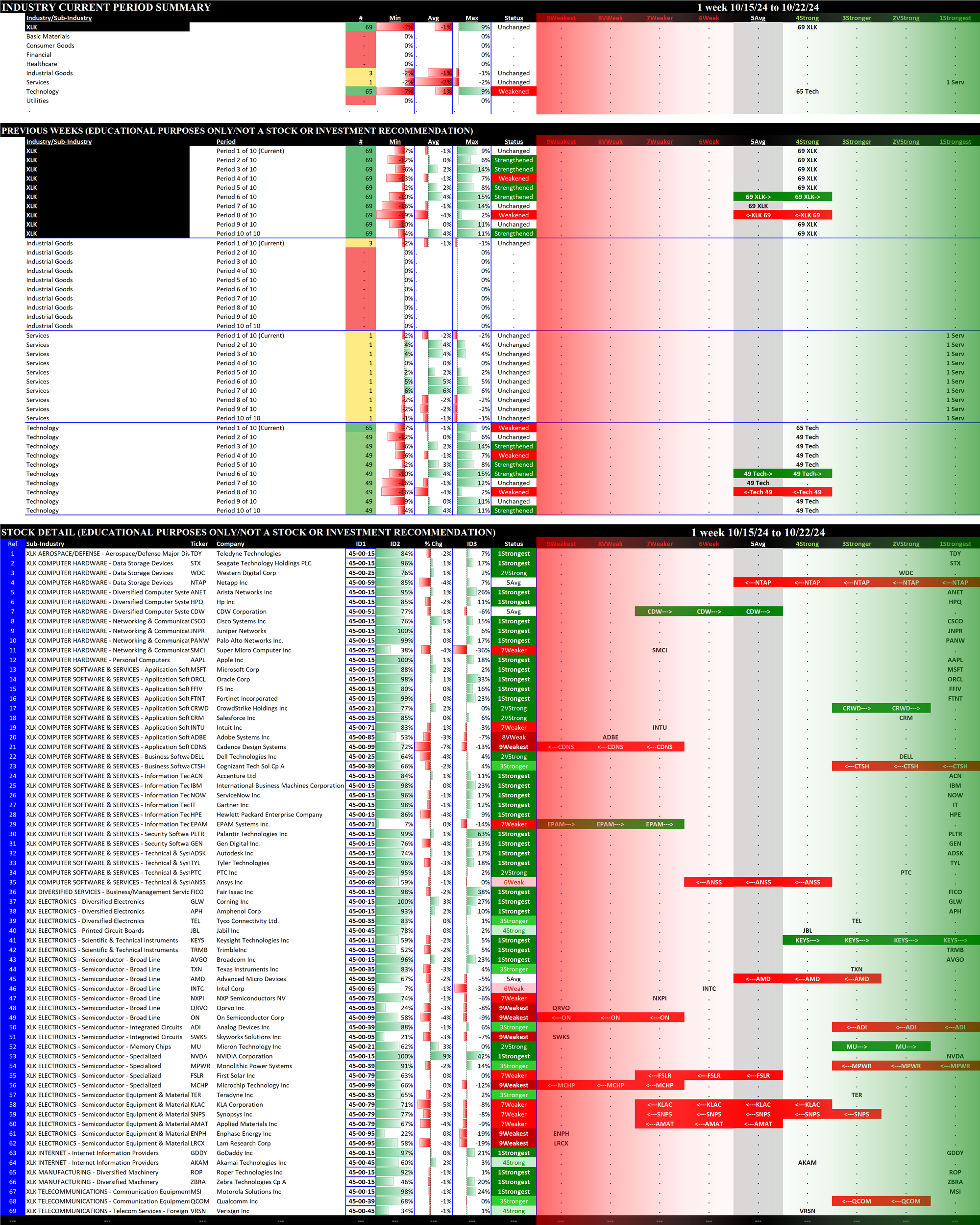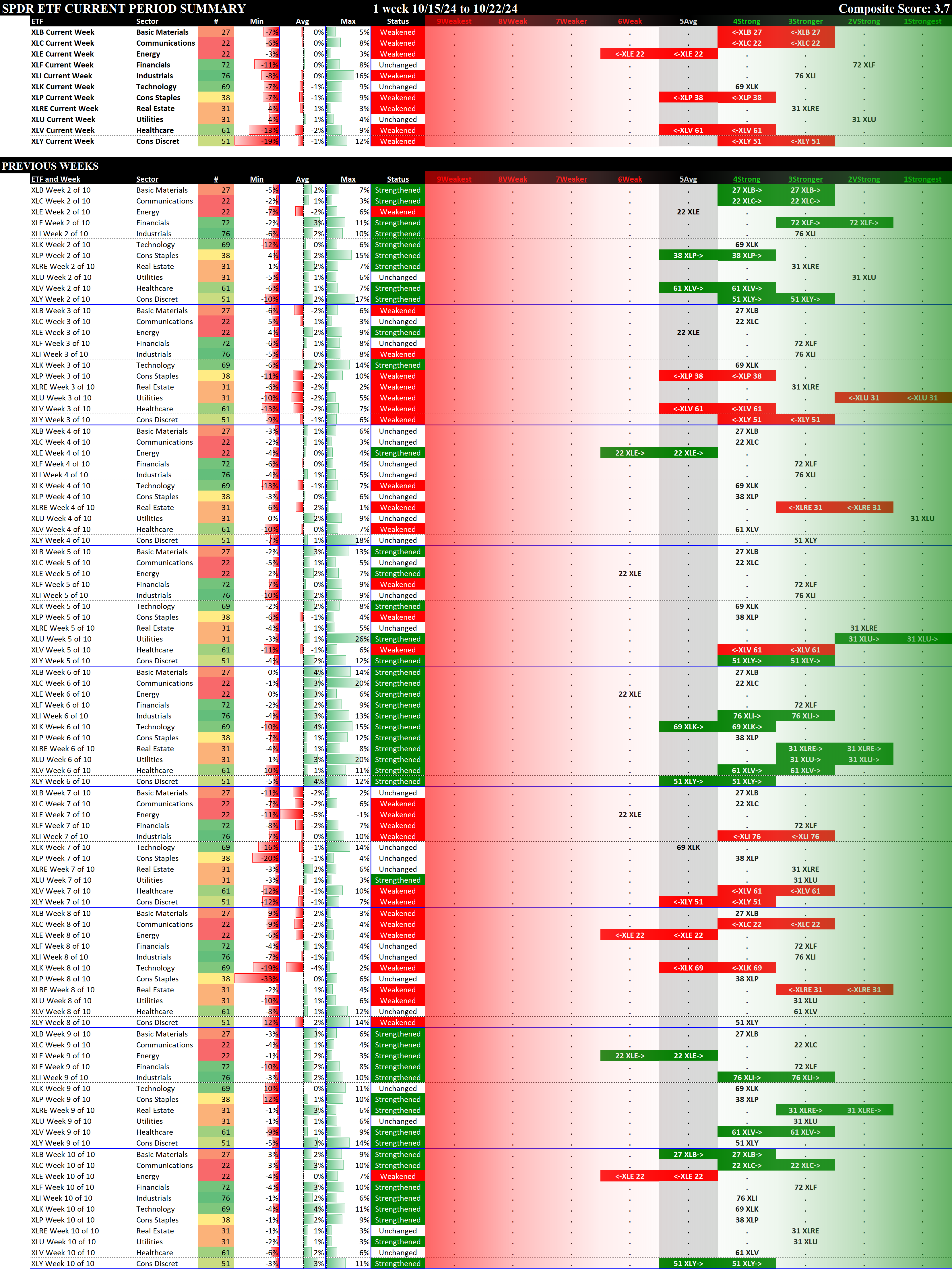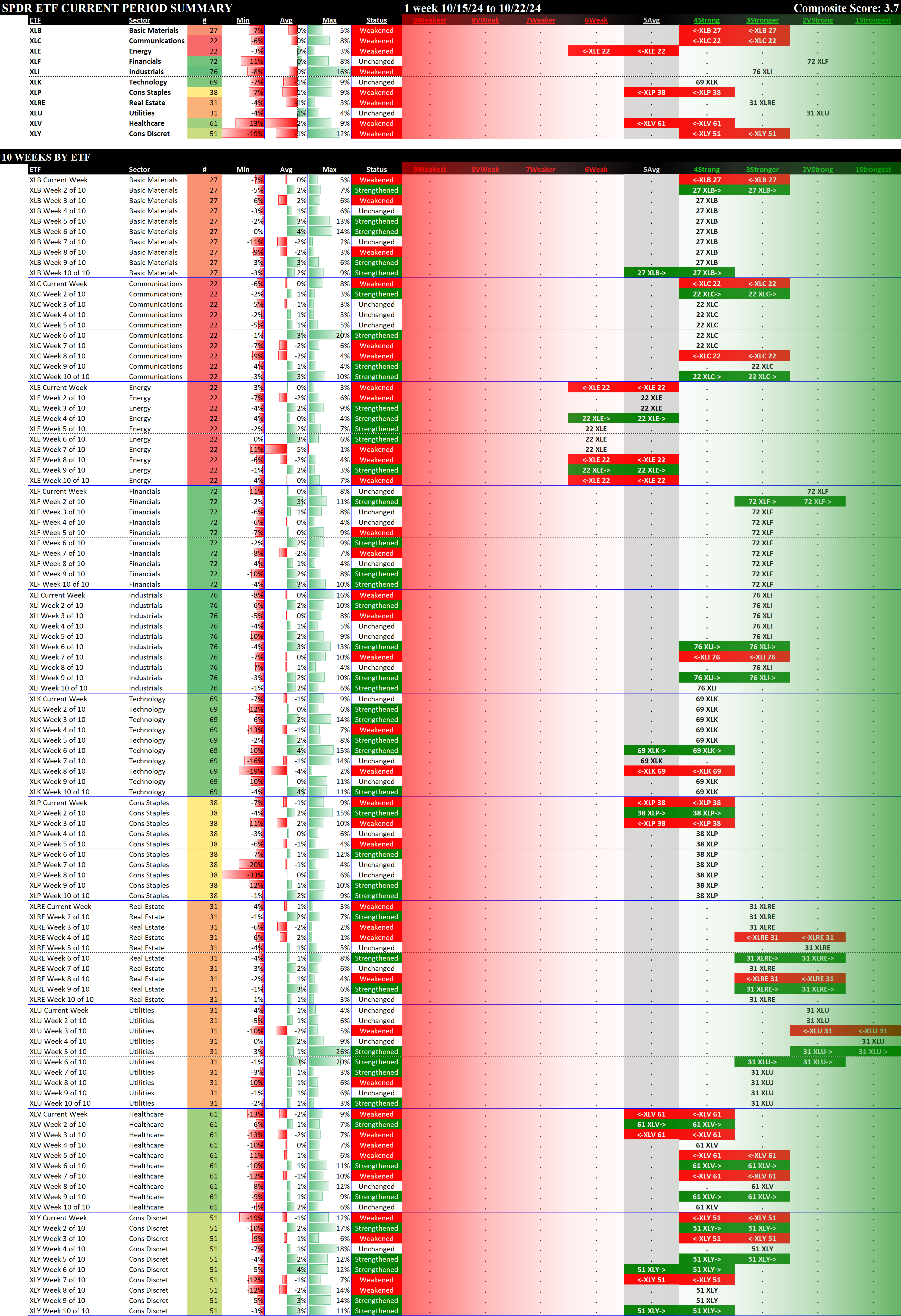 The following Stock Market Organizer strengthening/weakening analysis looks at the 11 SPDR ETFs and their underlying component stocks for the week ending Tuesday 2024-10-22, as follows: