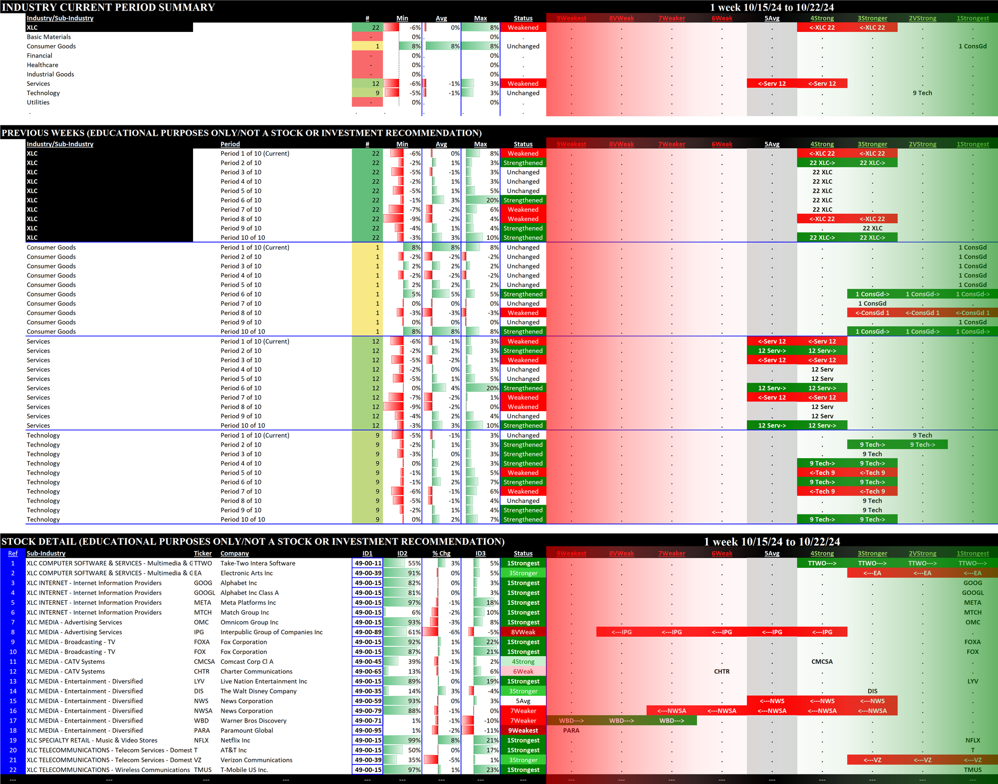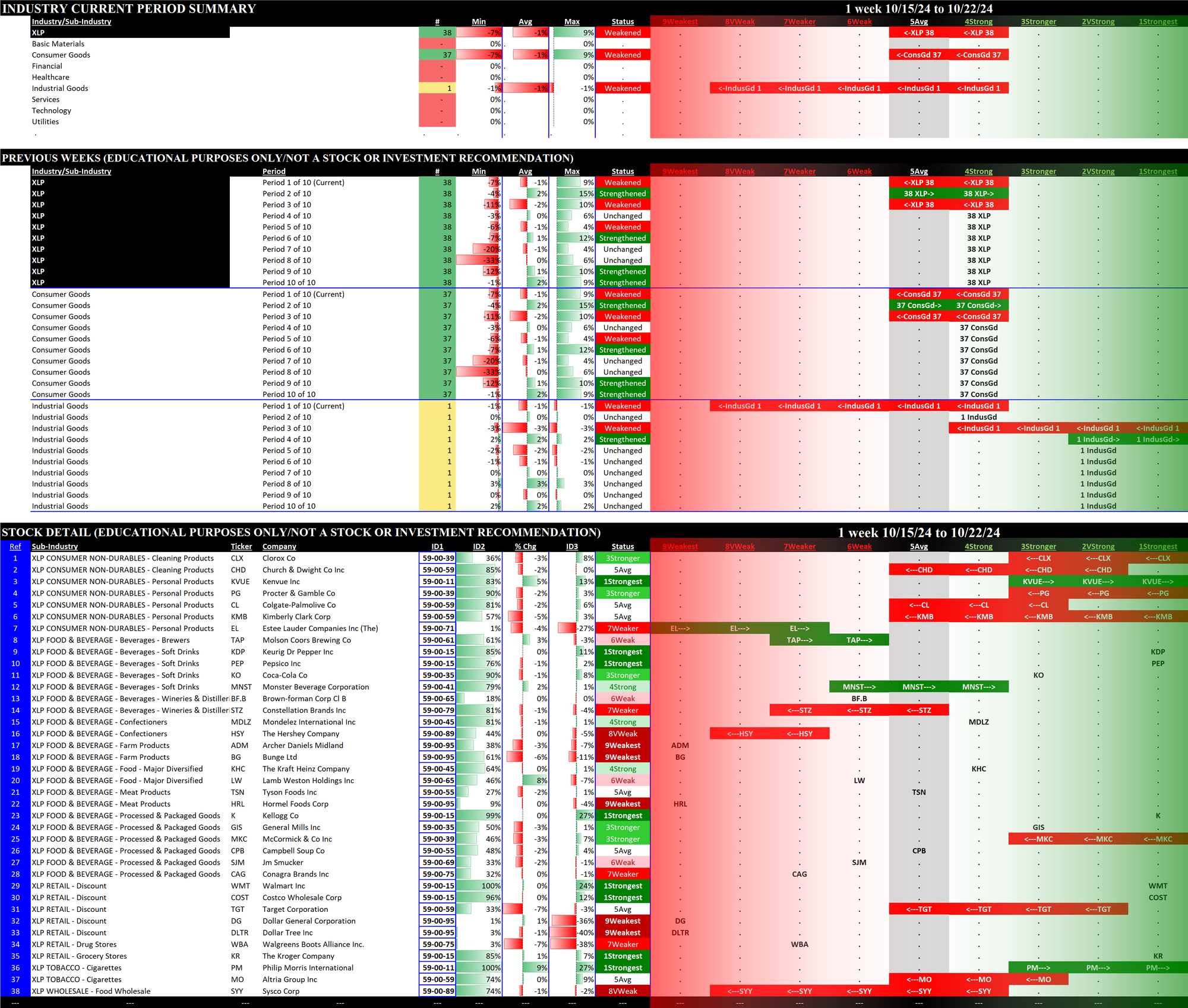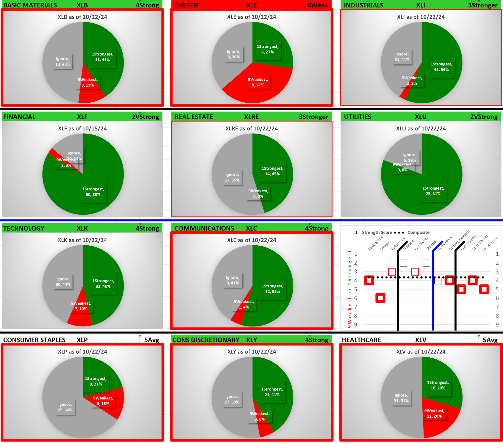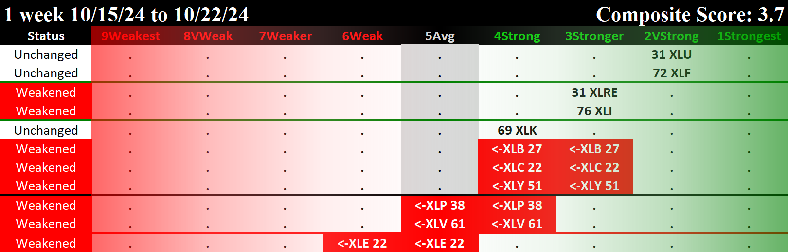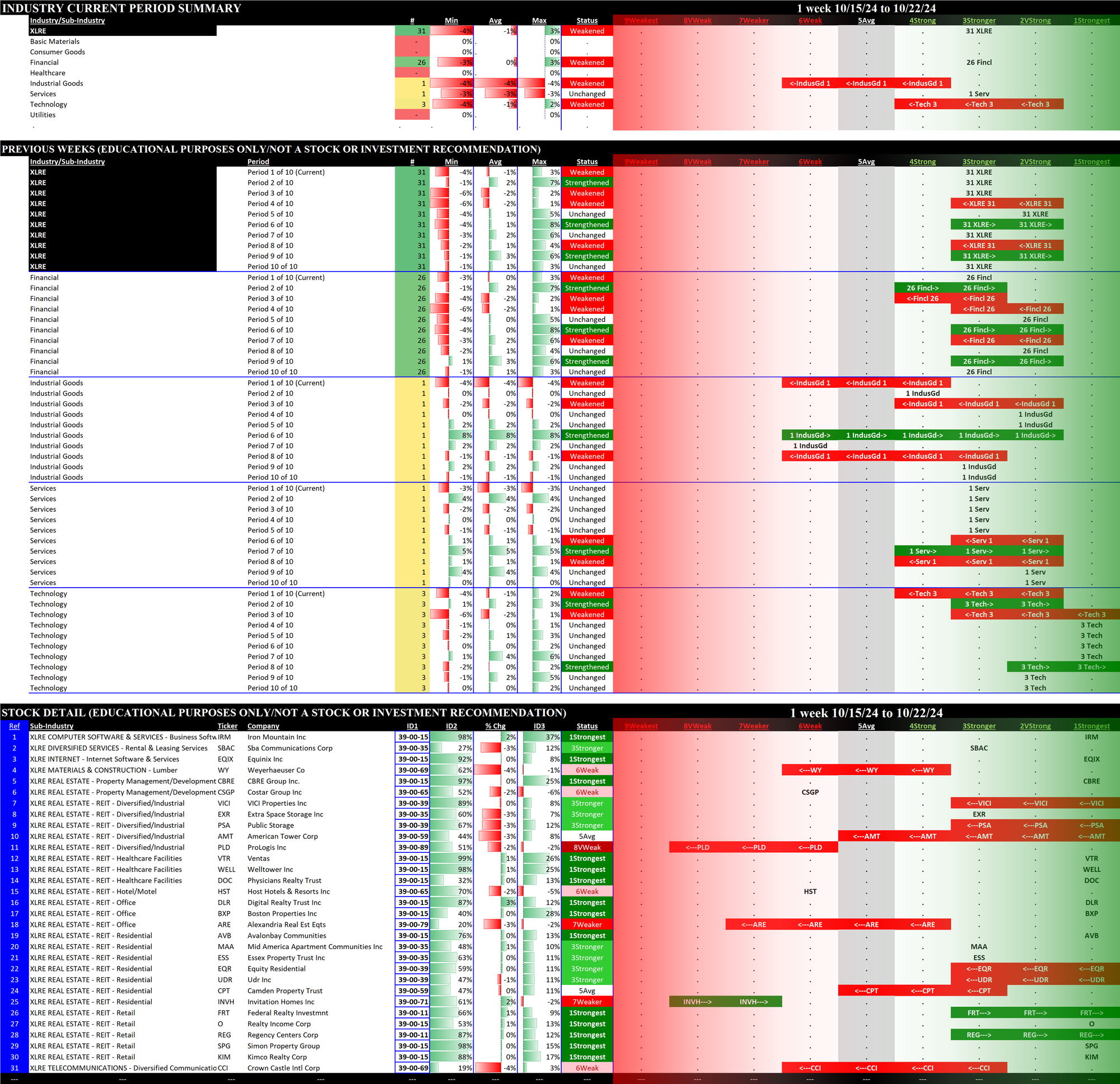 The following Stock Market Organizer strengthening/weakening analysis looks at the 11 SPDR ETFs and their underlying component stocks for the week ending Tuesday 2024-10-22, as follows: