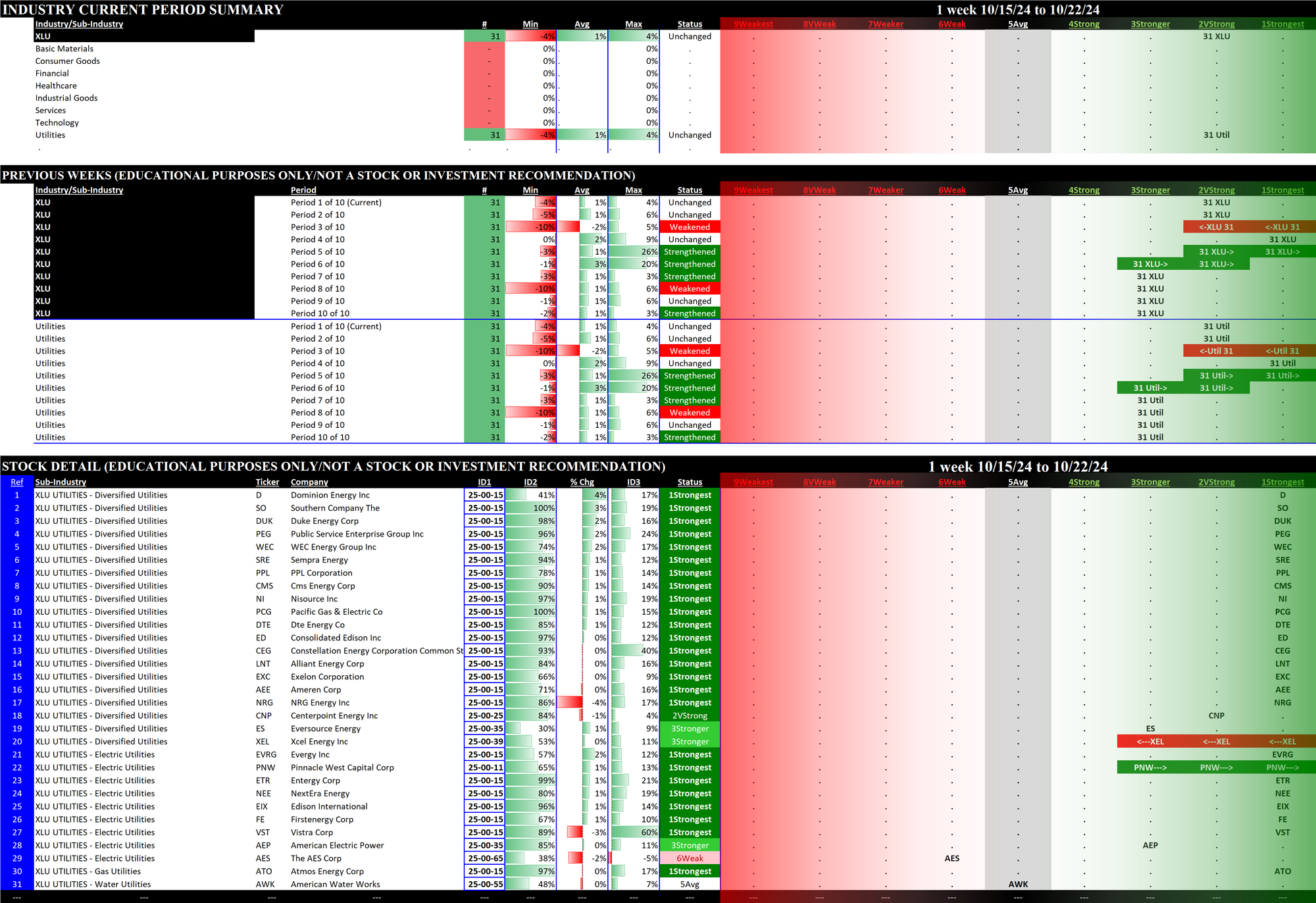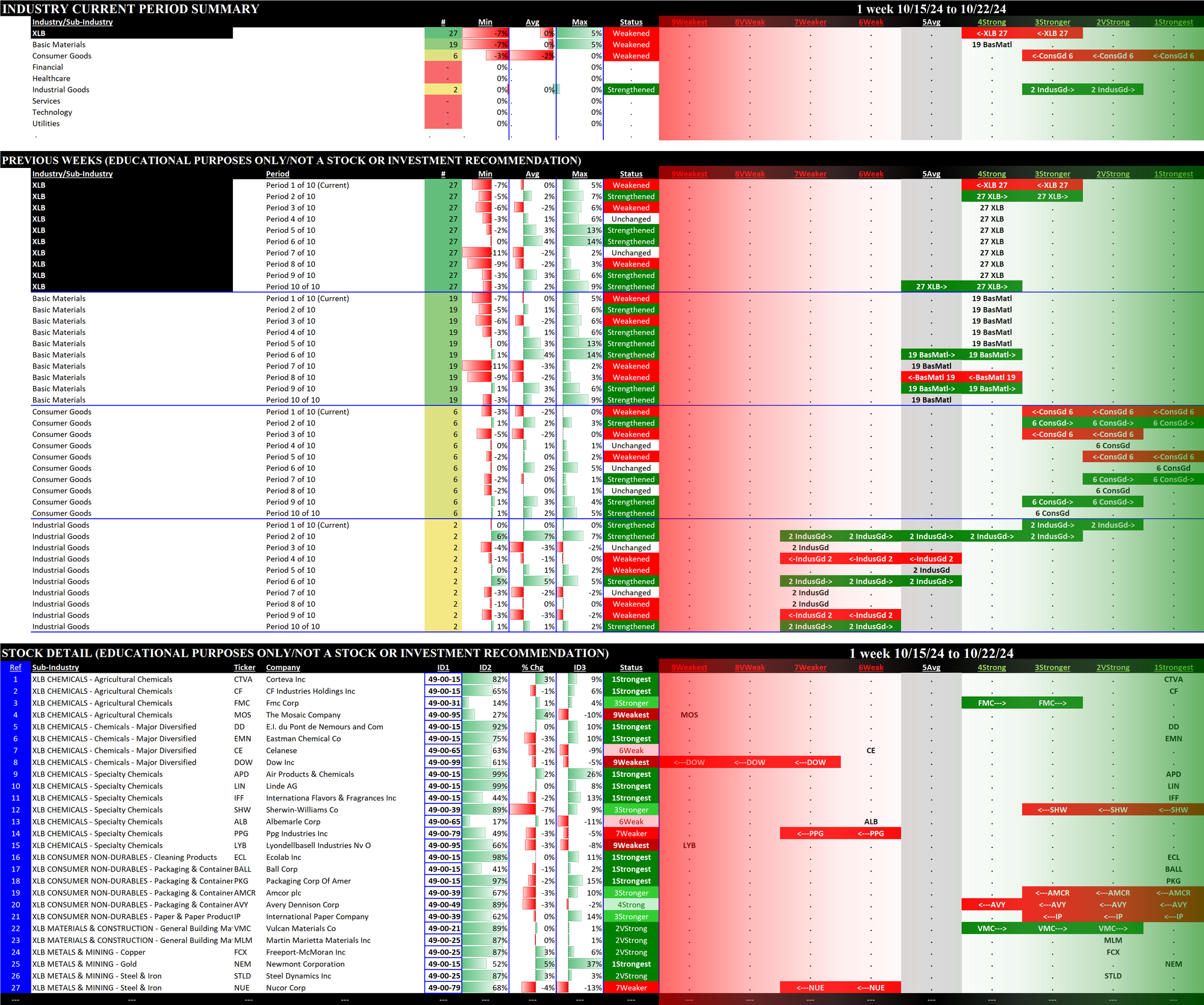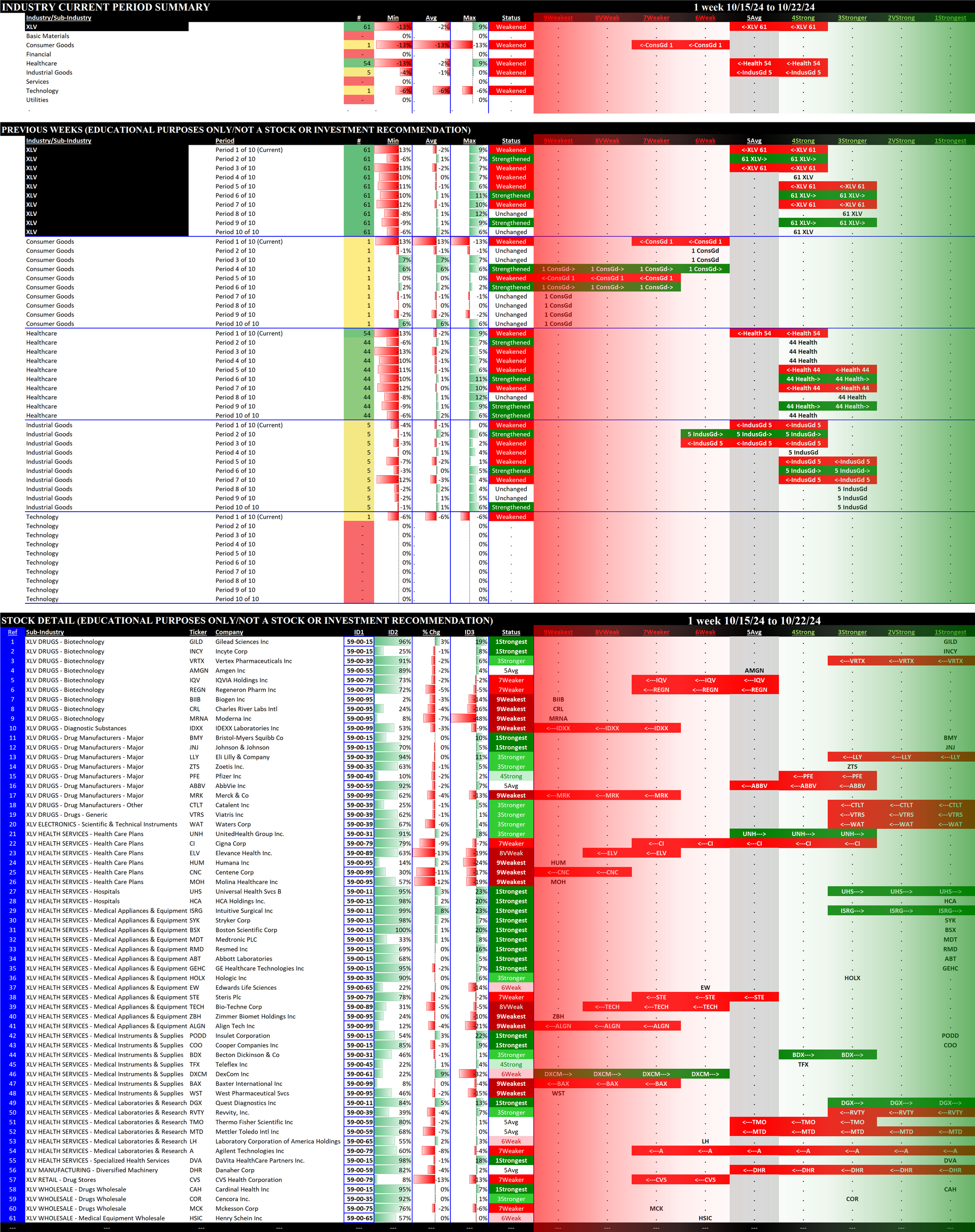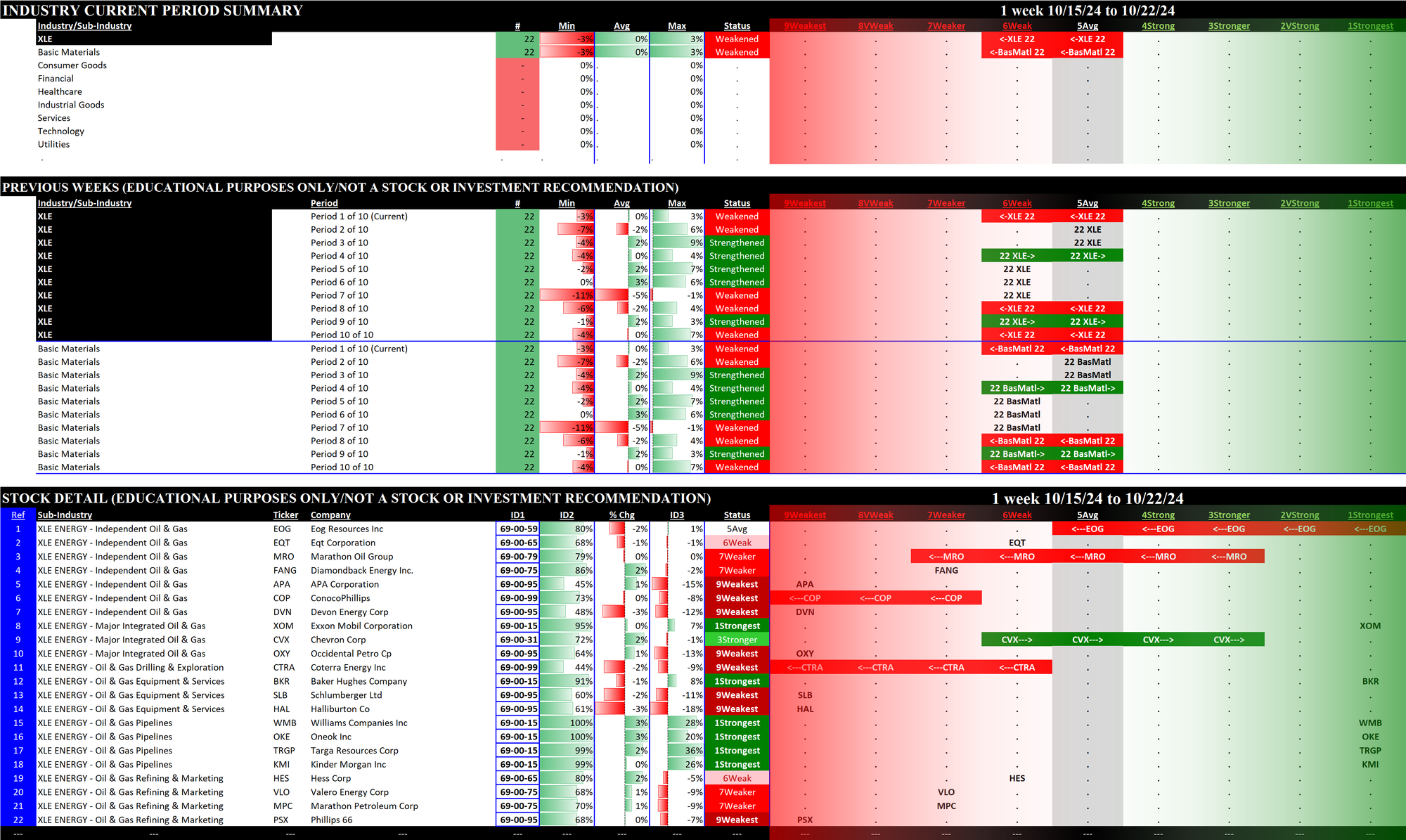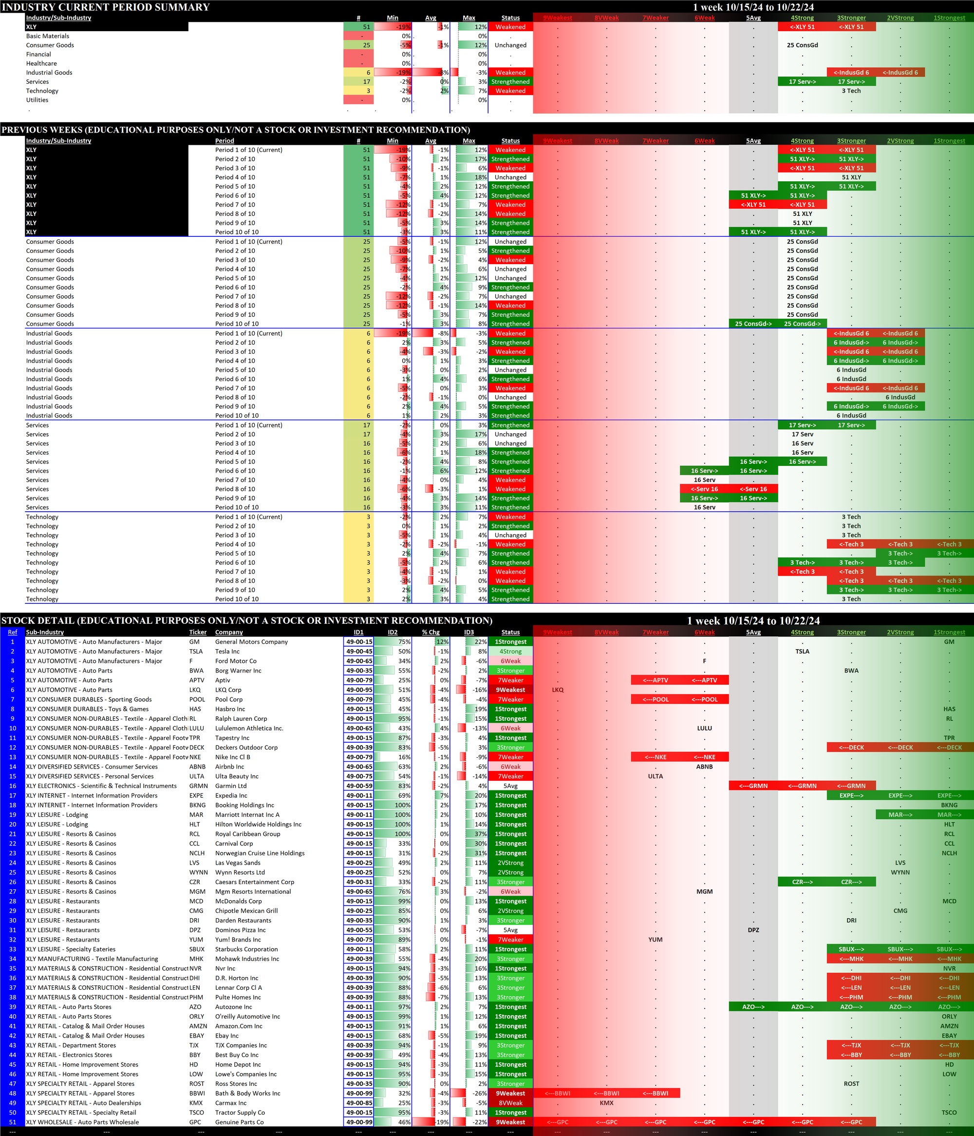 The following Stock Market Organizer strengthening/weakening analysis looks at the 11 SPDR ETFs and their underlying component stocks for the week ending Tuesday 2024-10-22, as follows:
