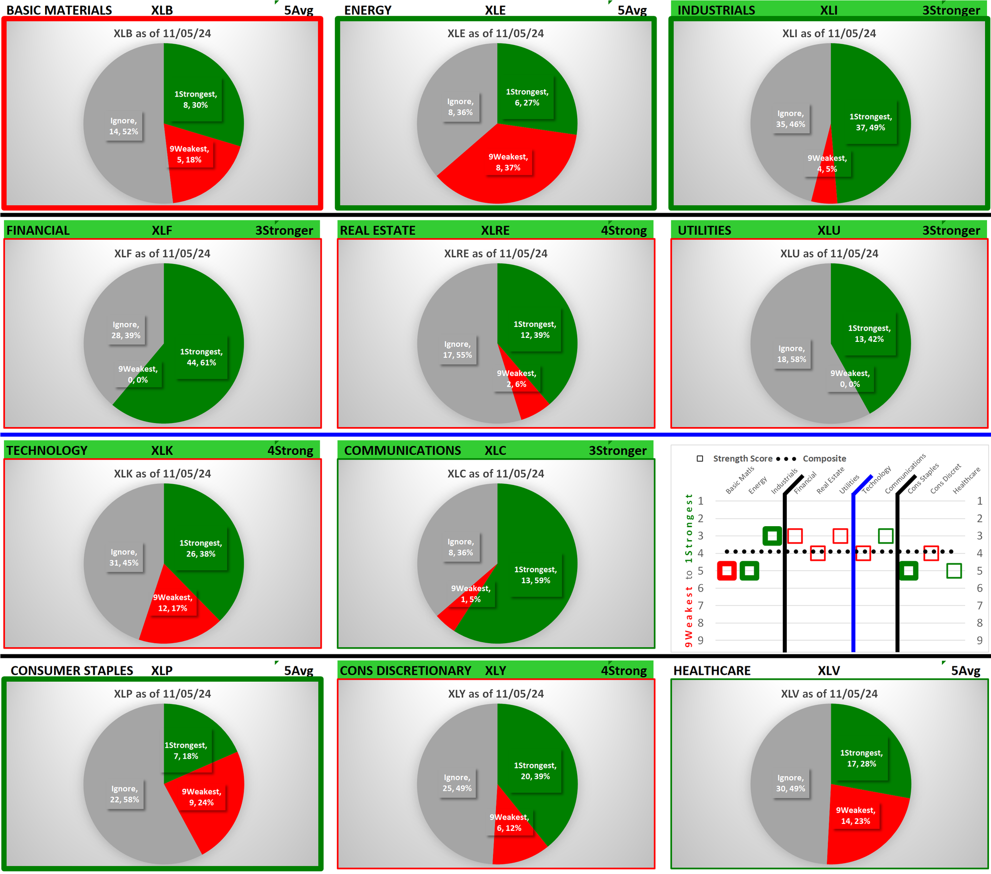 The 11 sector ETFs are bunched between 3Strong and 5Average. No sectors are below average.