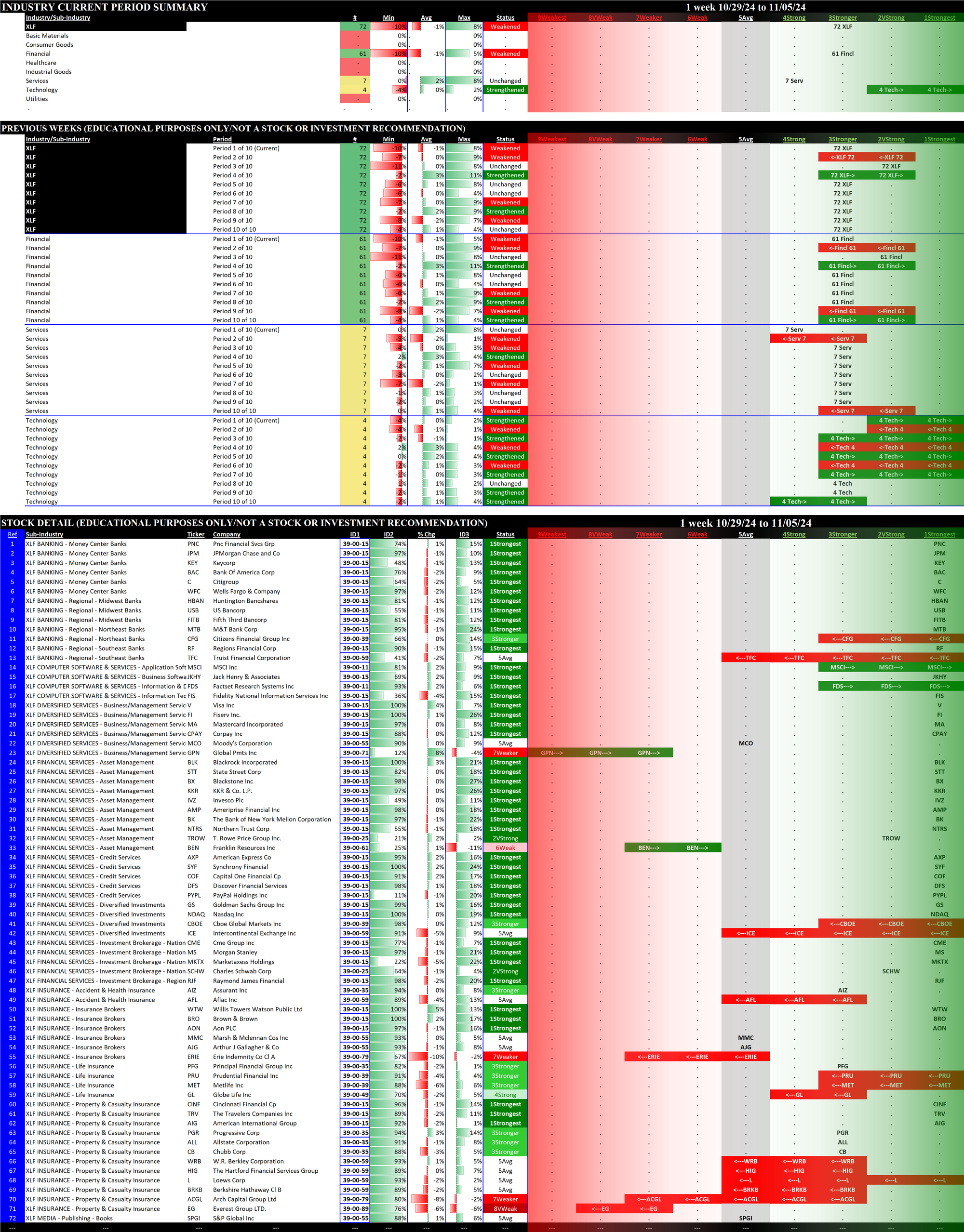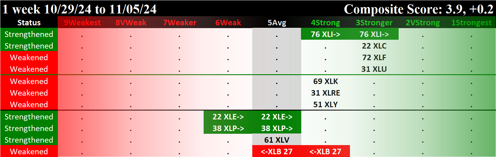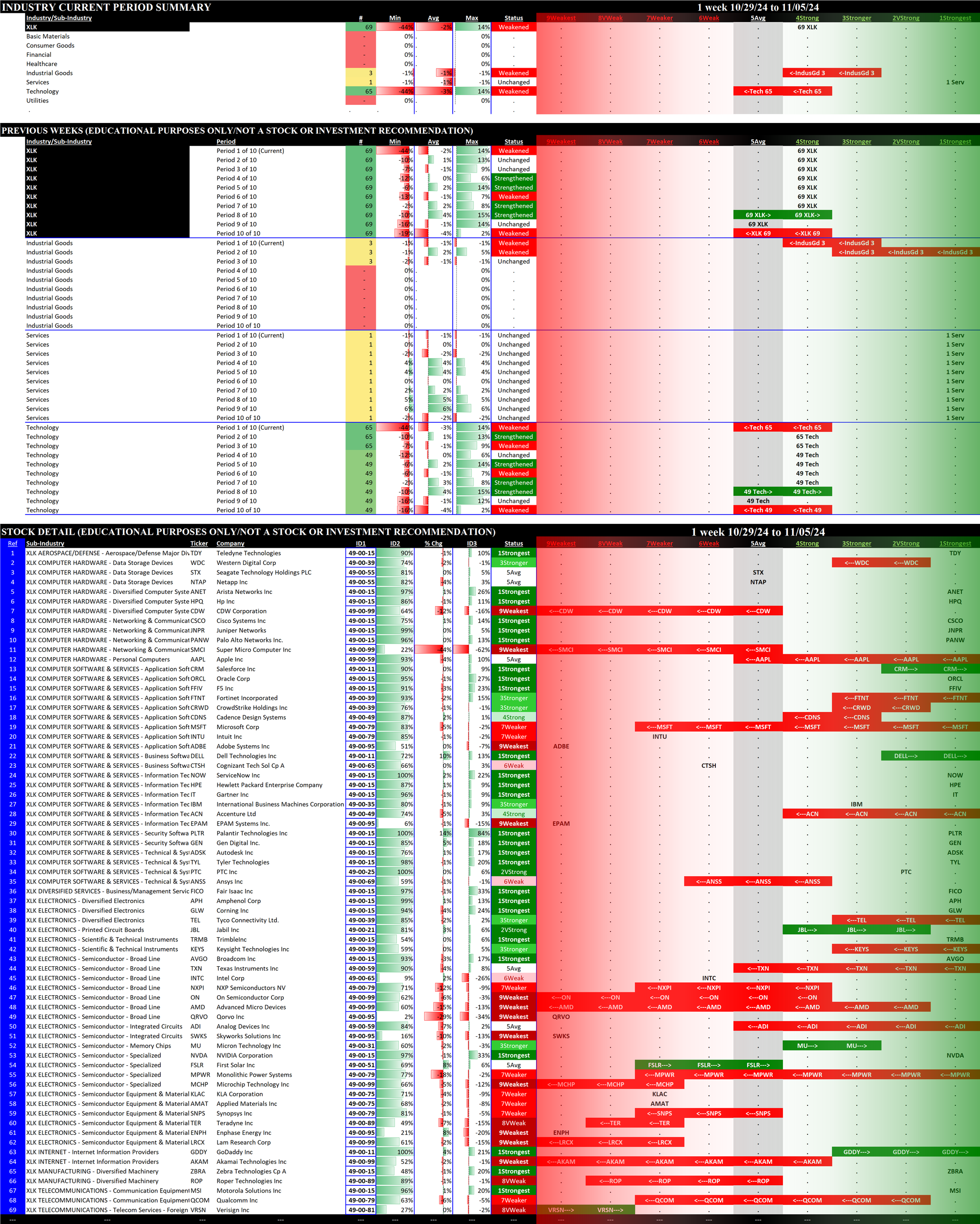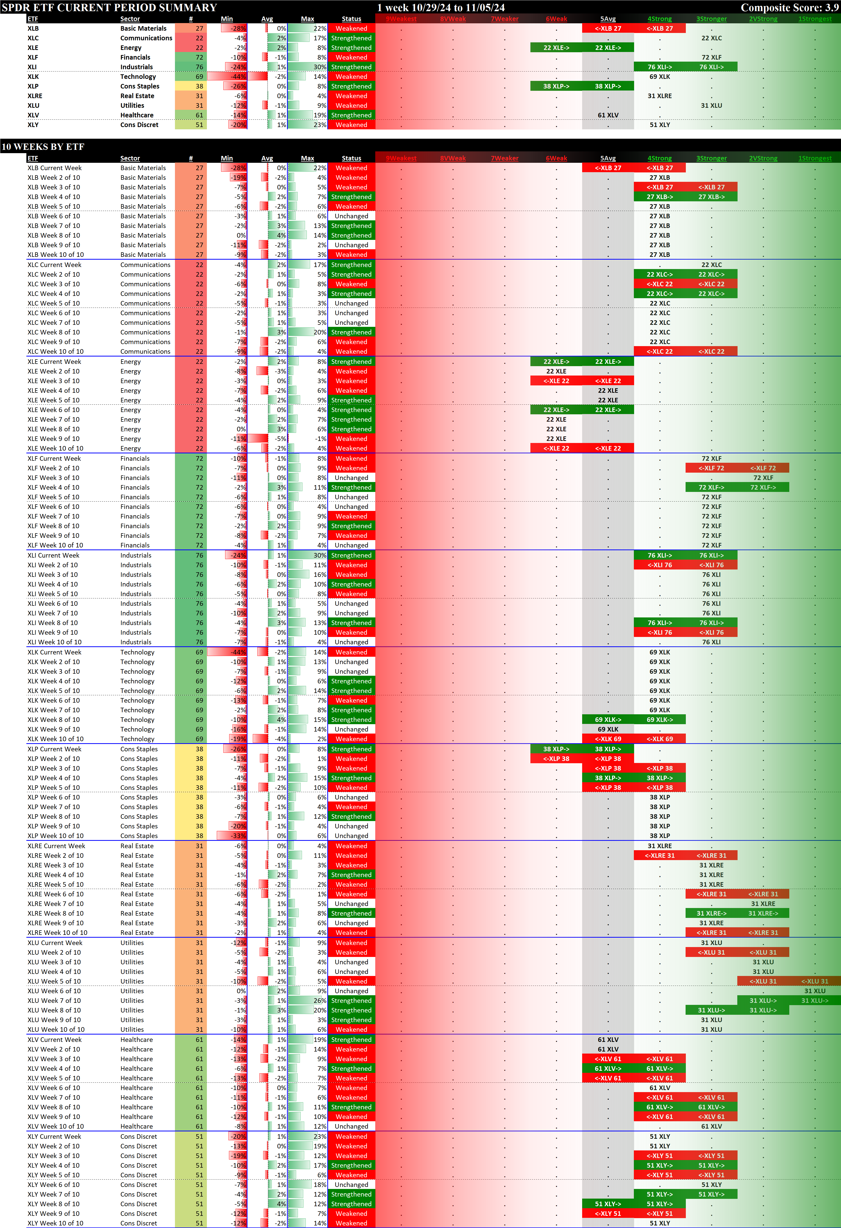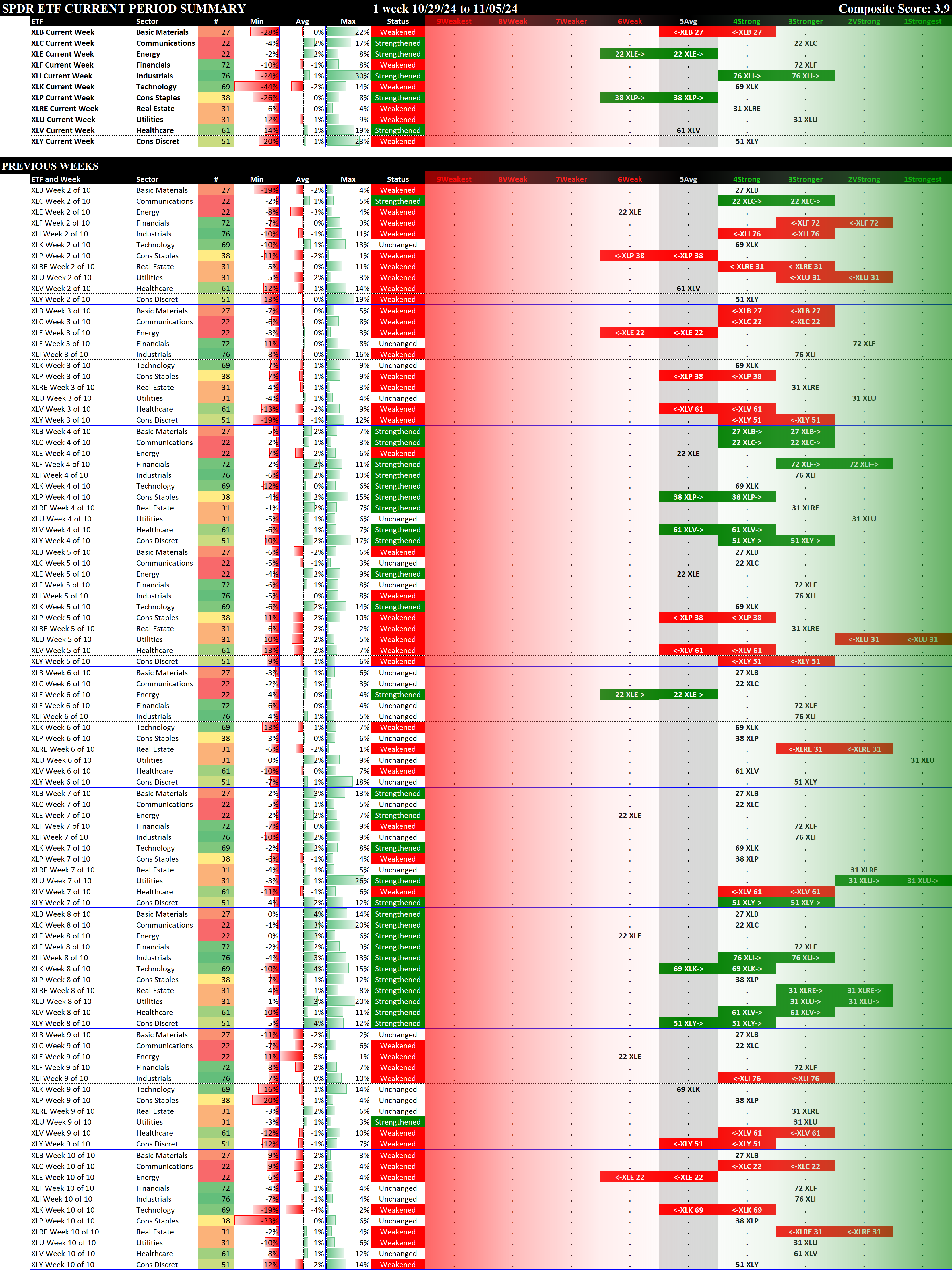 The following Stock Market Organizer strengthening/weakening analysis looks at the 11 SPDR ETFs and their underlying component stocks for the week ending Tuesday 2024-11-05, as follows: