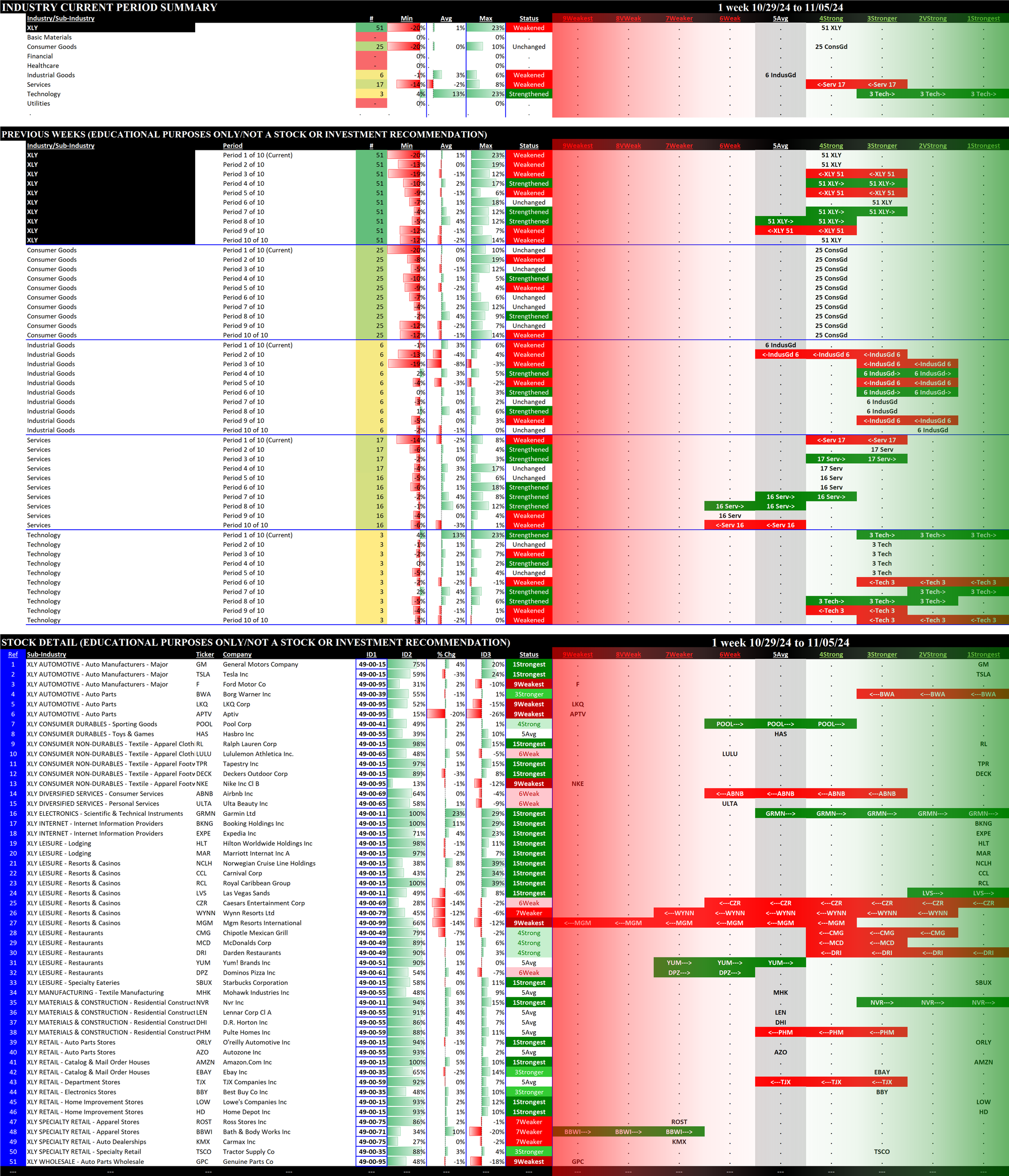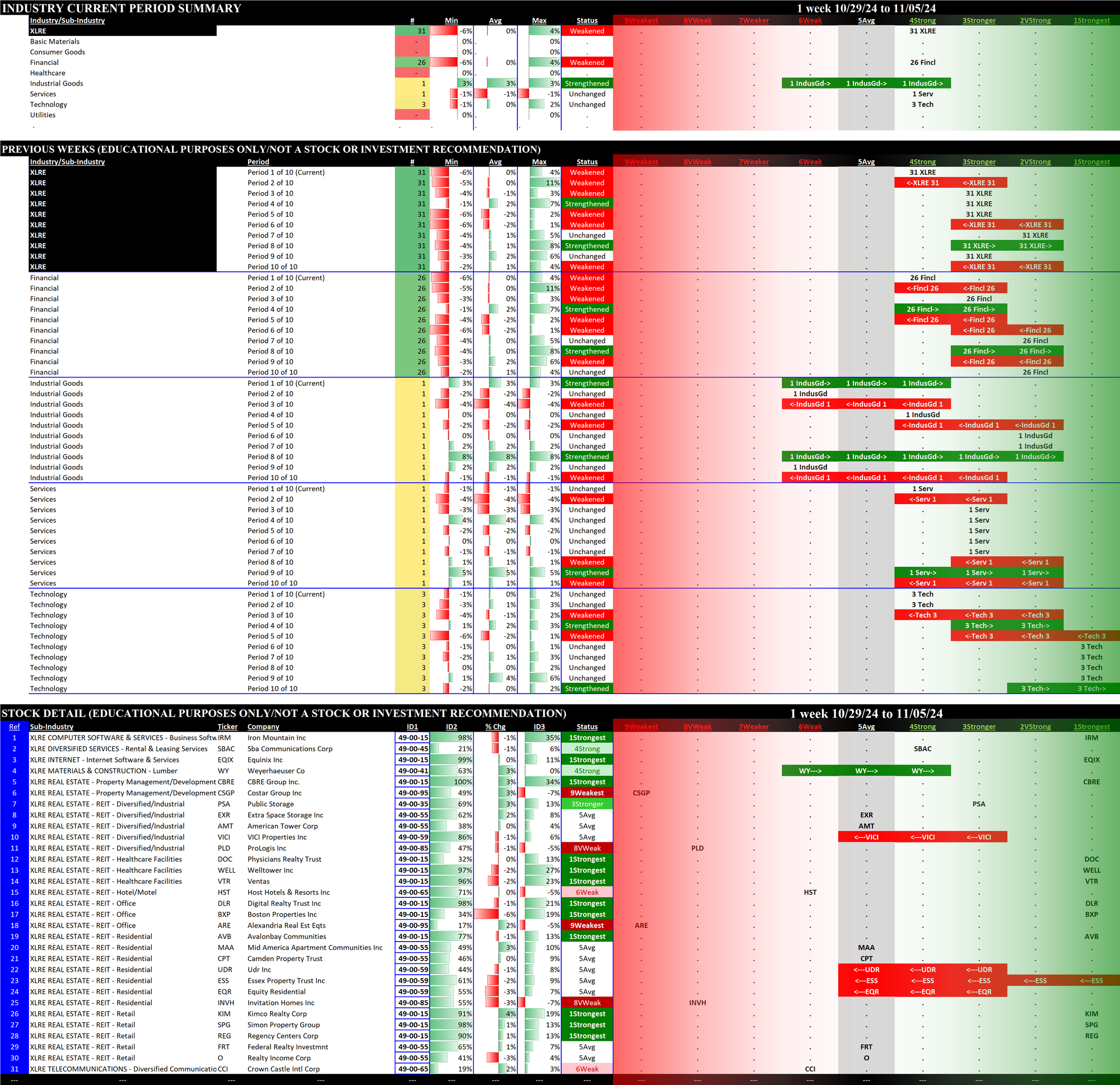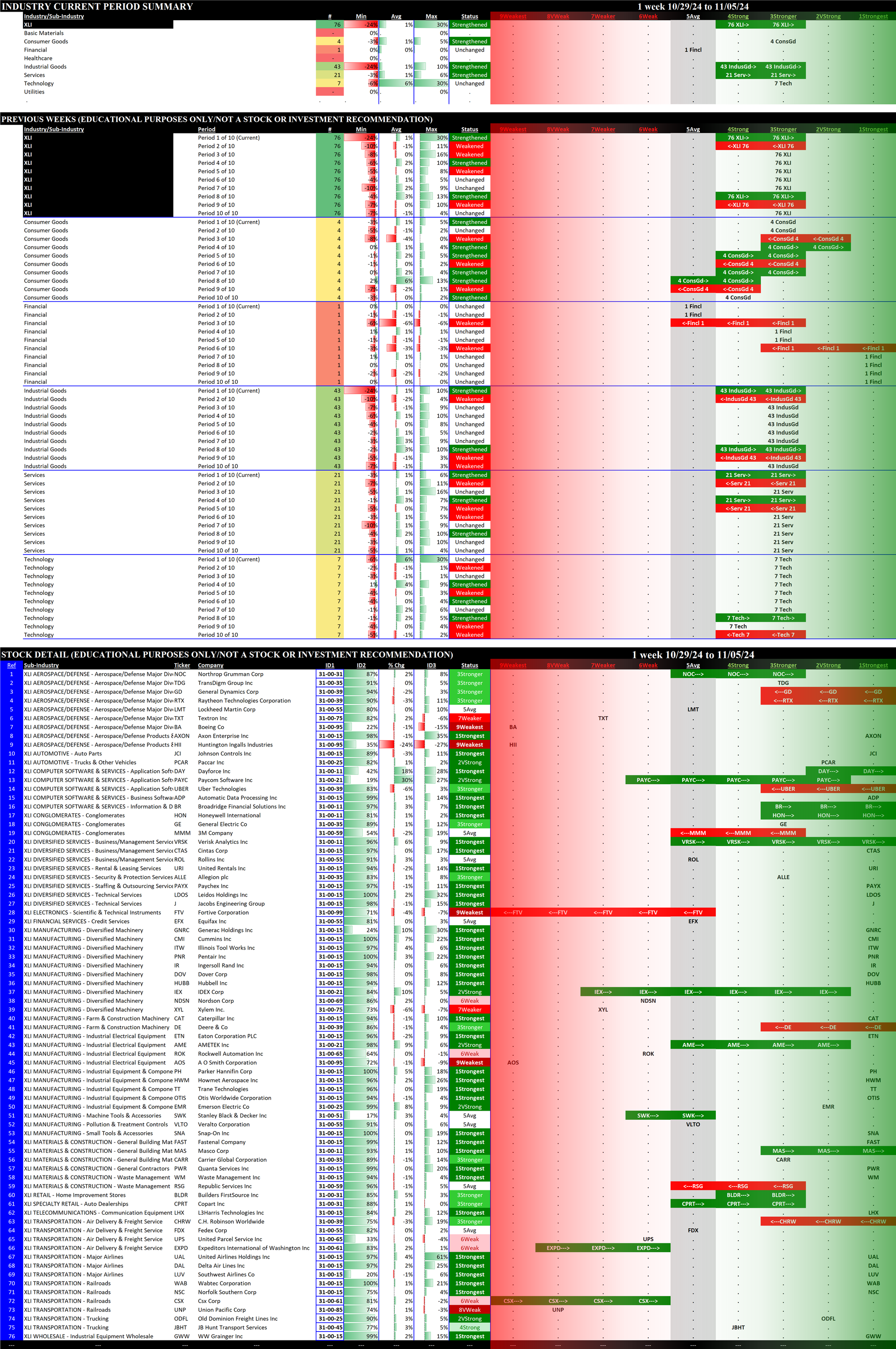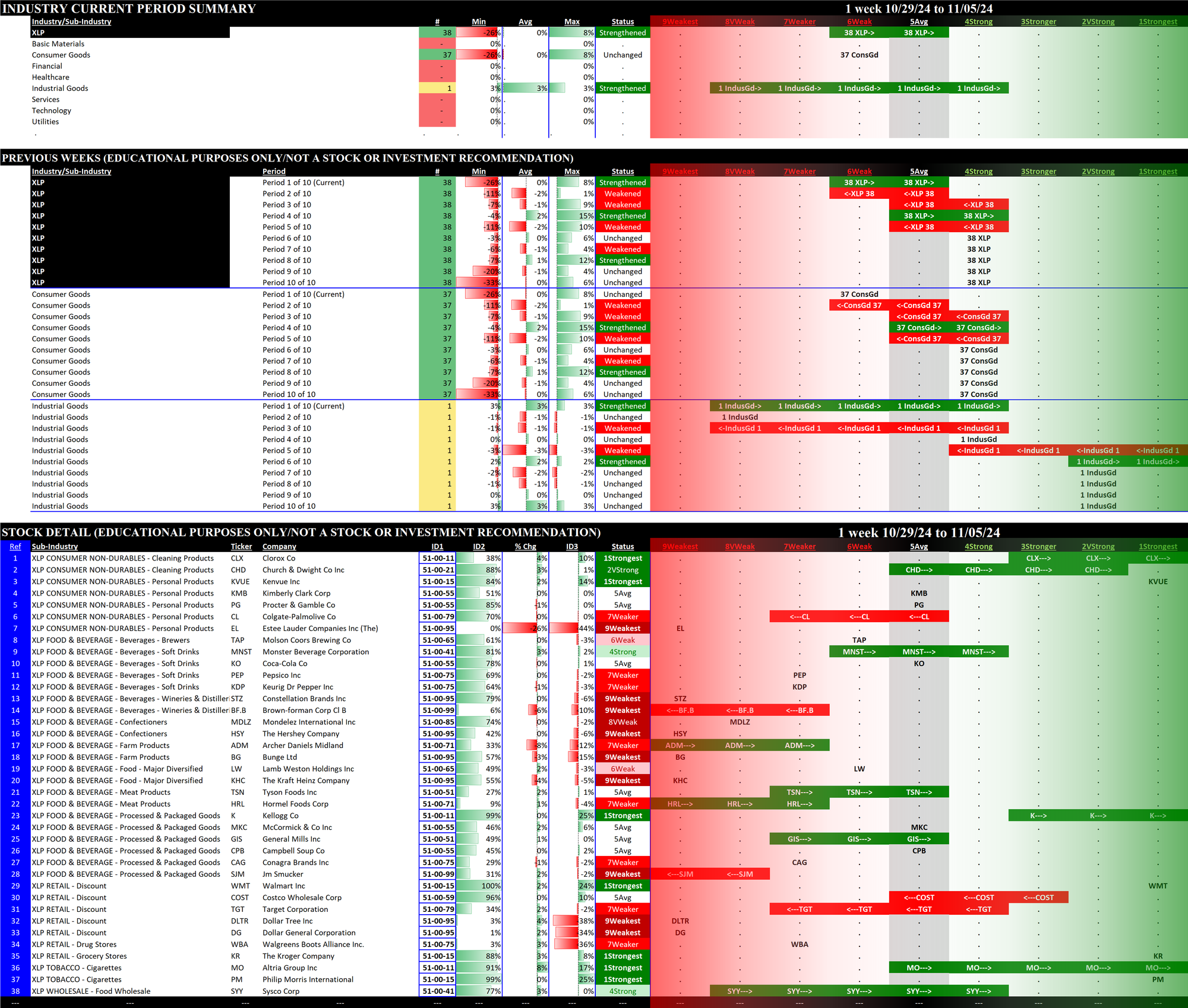 The following Stock Market Organizer strengthening/weakening analysis looks at the 11 SPDR ETFs and their underlying component stocks for the week ending Tuesday 2024-11-05, as follows: