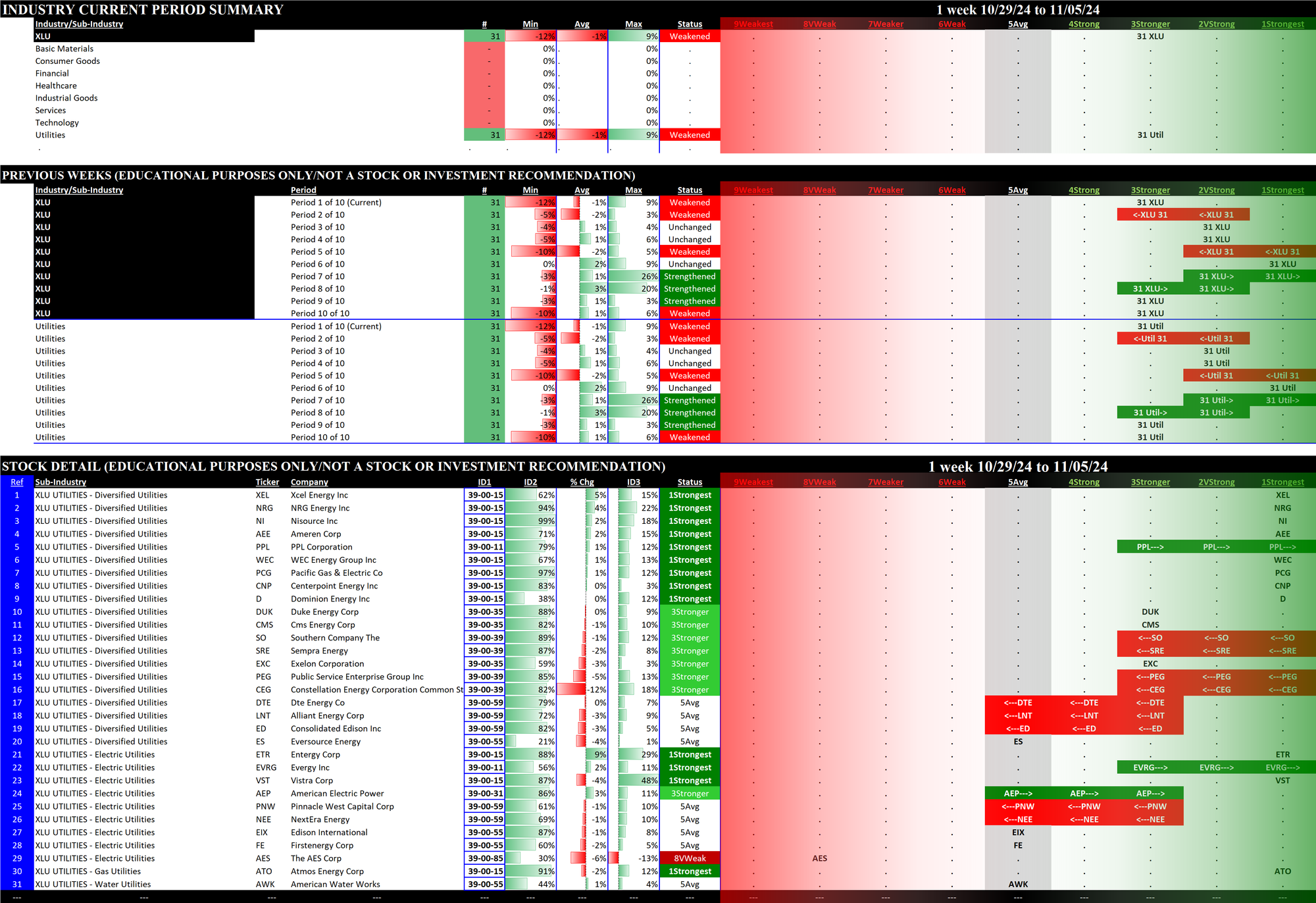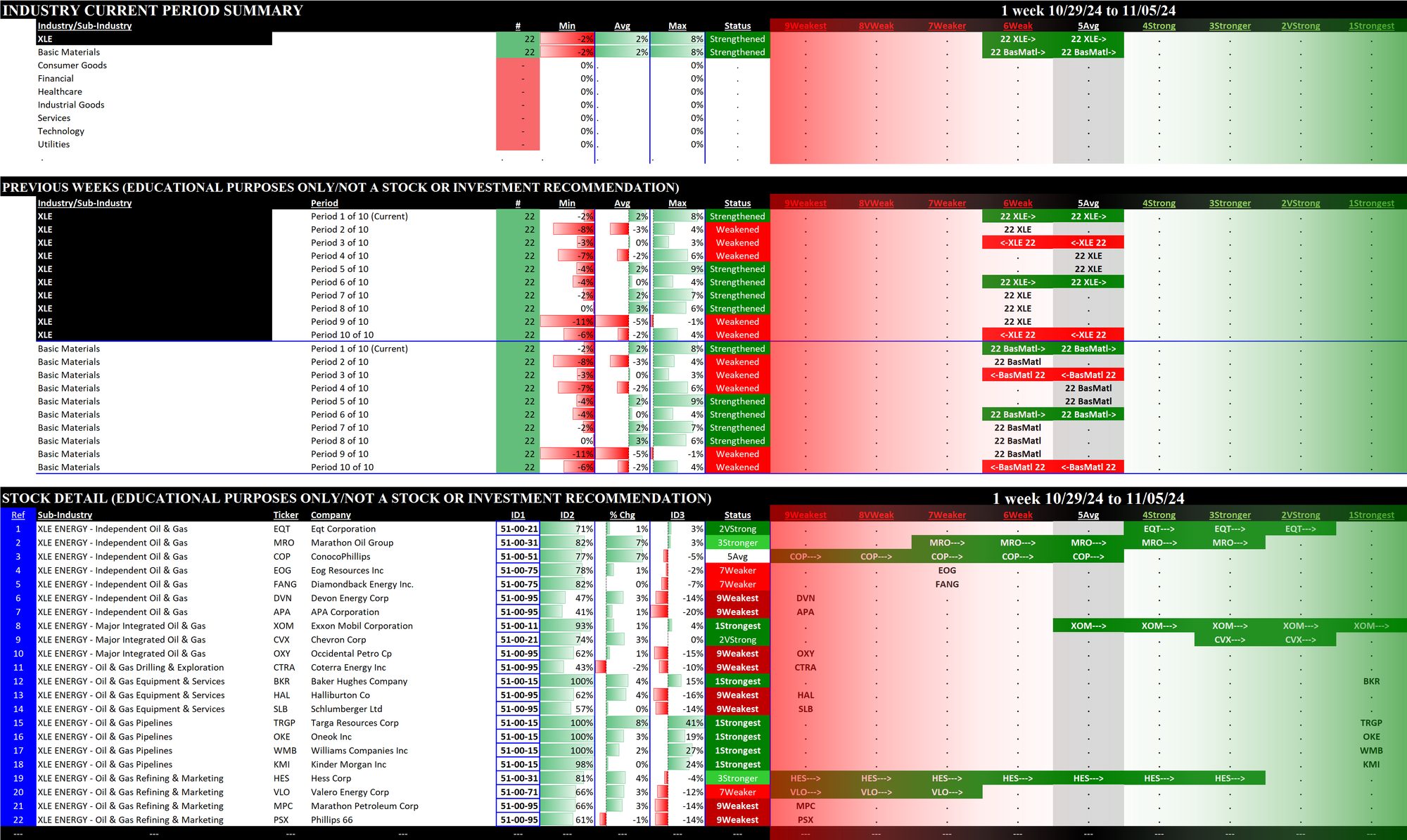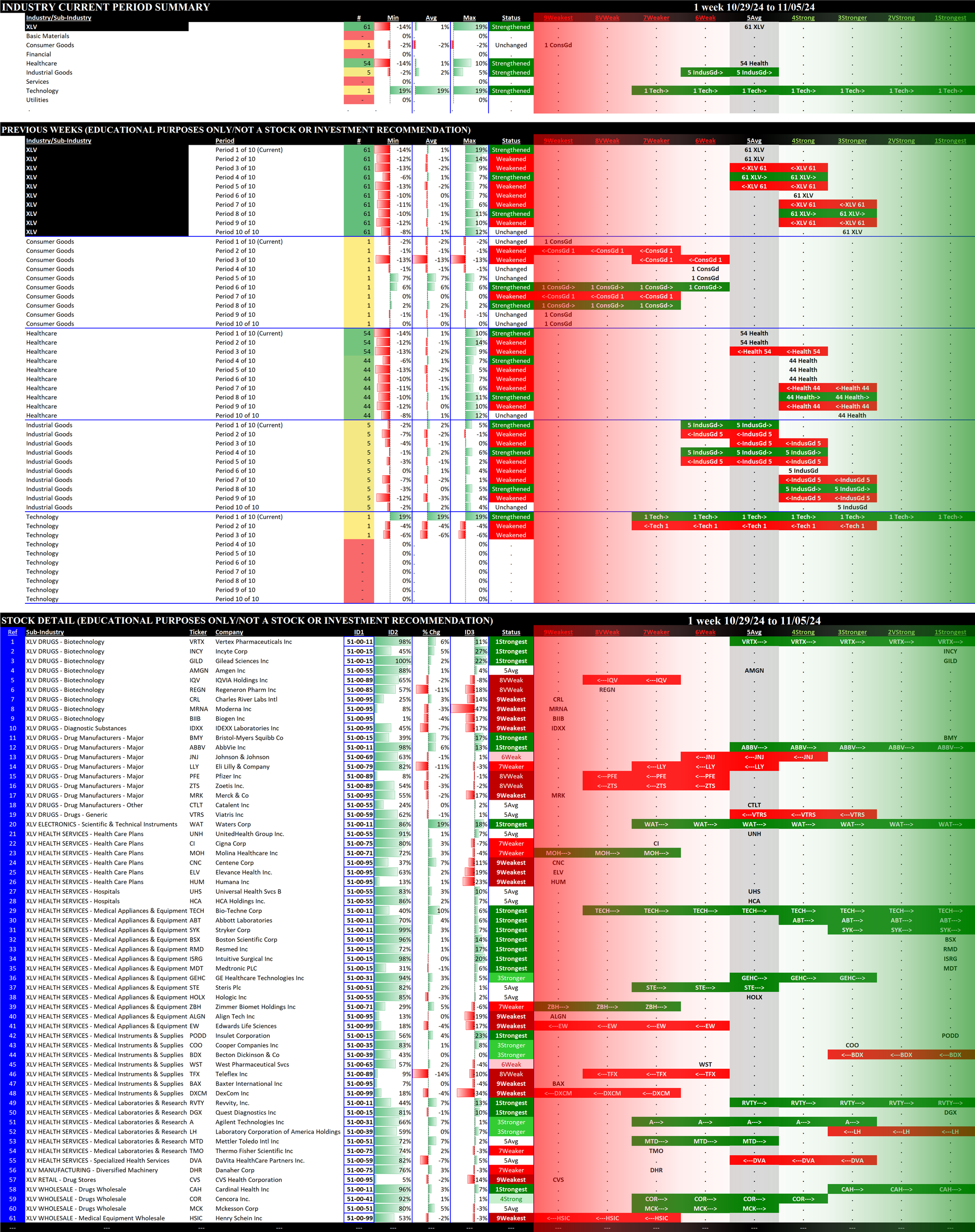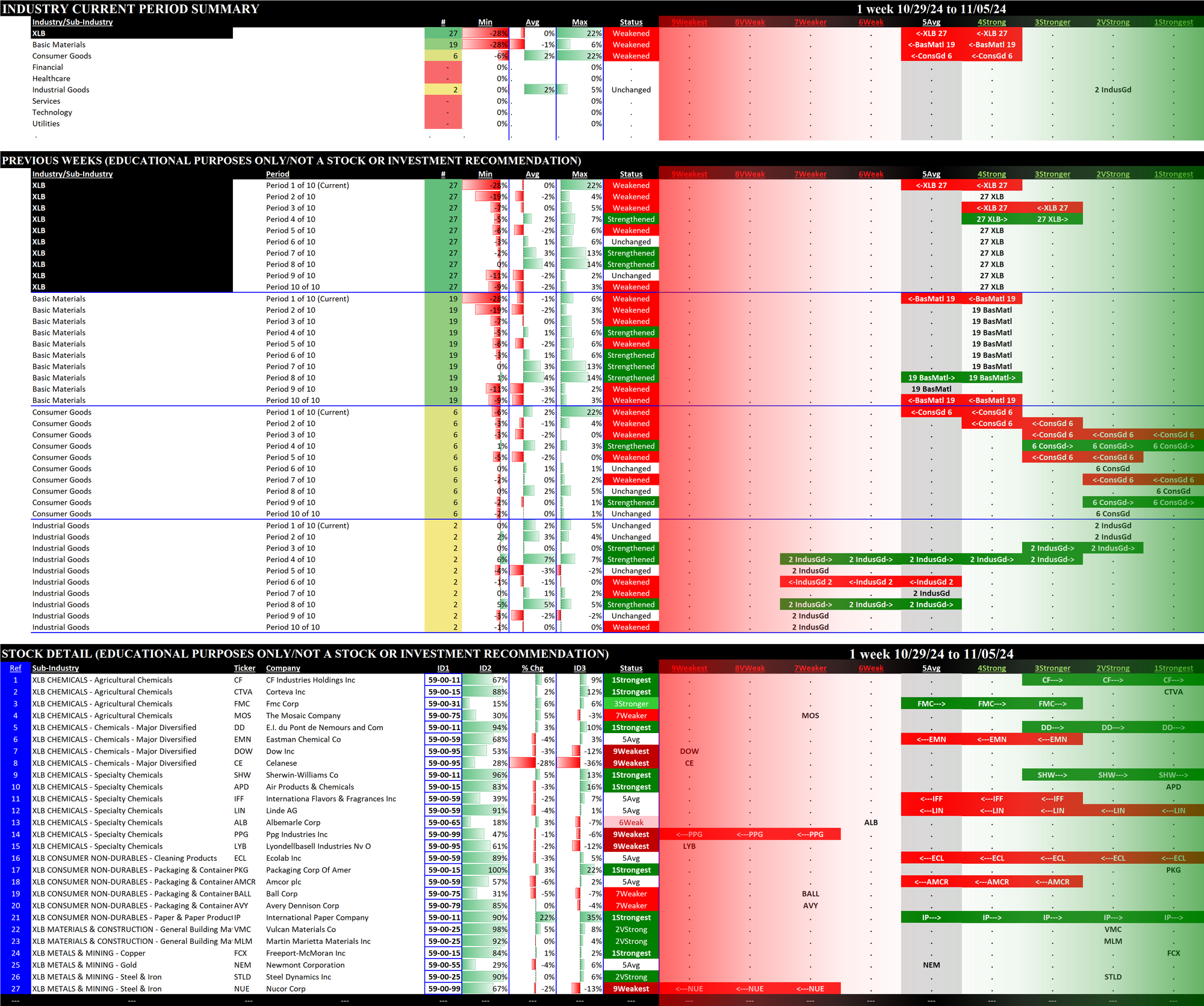 The following Stock Market Organizer strengthening/weakening analysis looks at the 11 SPDR ETFs and their underlying component stocks for the week ending Tuesday 2024-11-05, as follows: