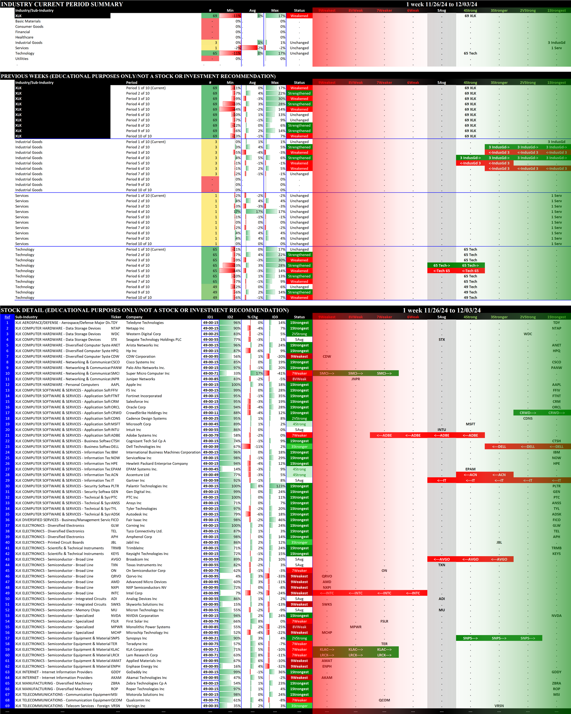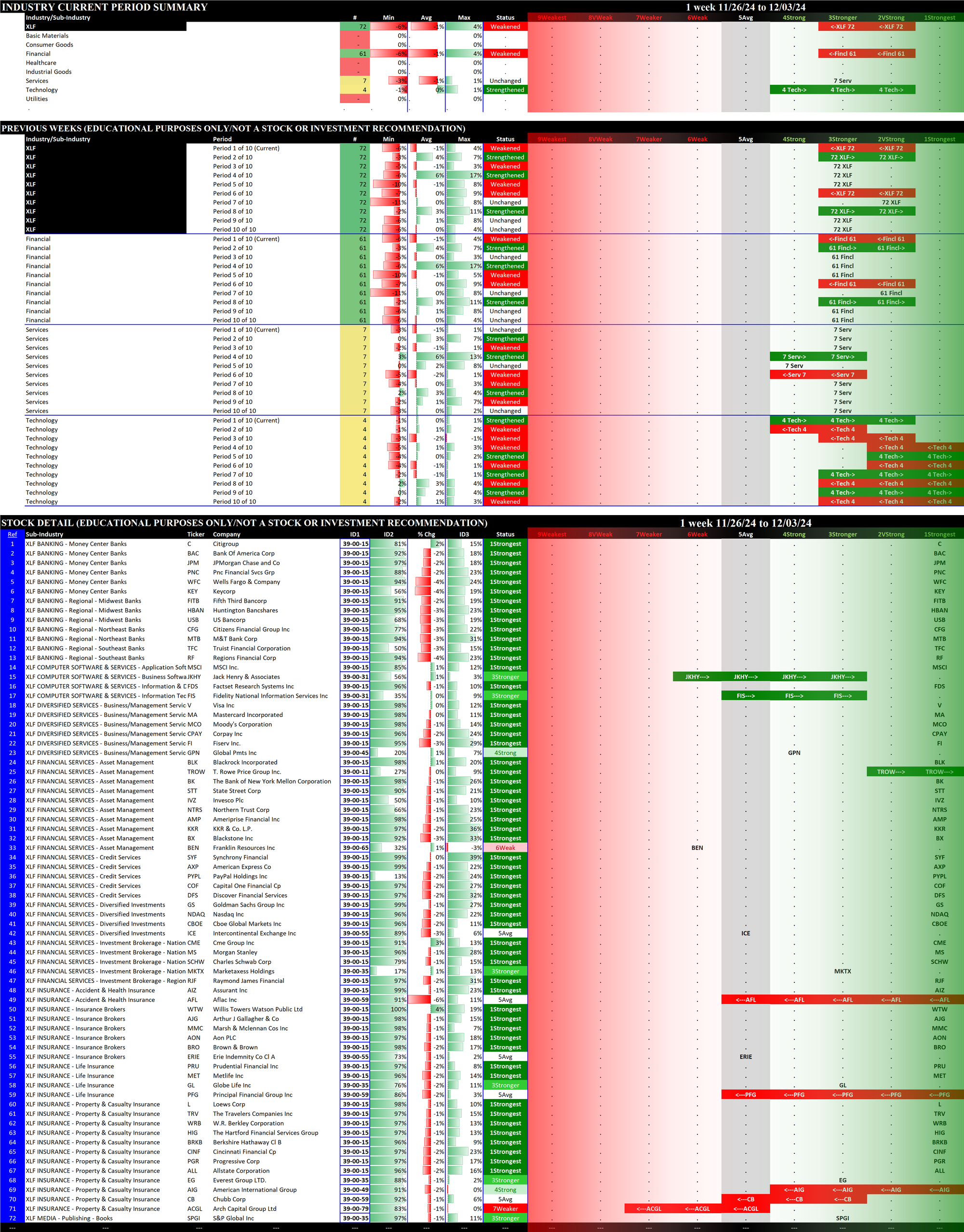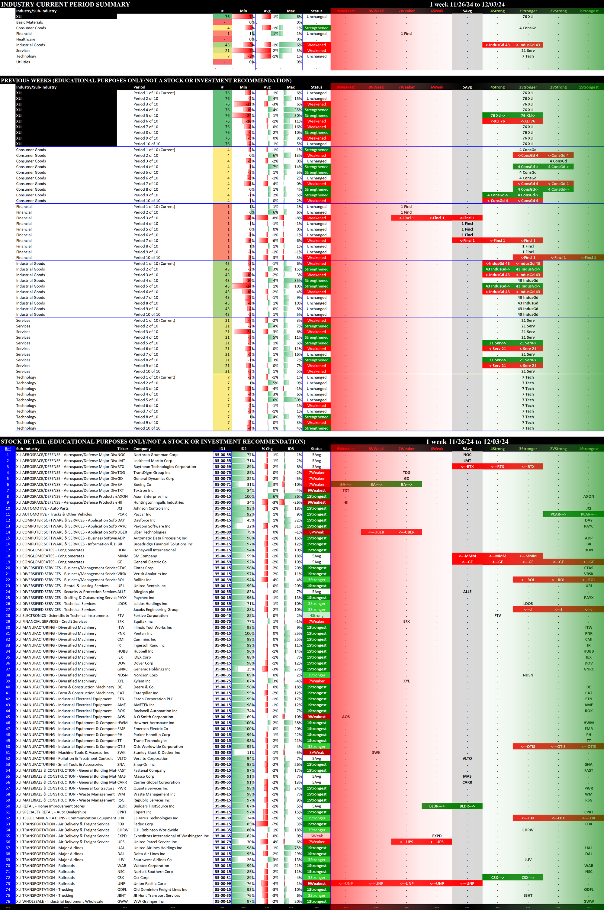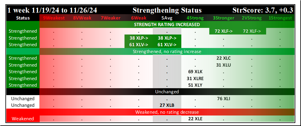 The following Stock Market Organizer strengthening/weakening analysis looks at the 11 SPDR ETFs and their underlying component stocks for the week ending Tuesday 2024-12-03, as follows: