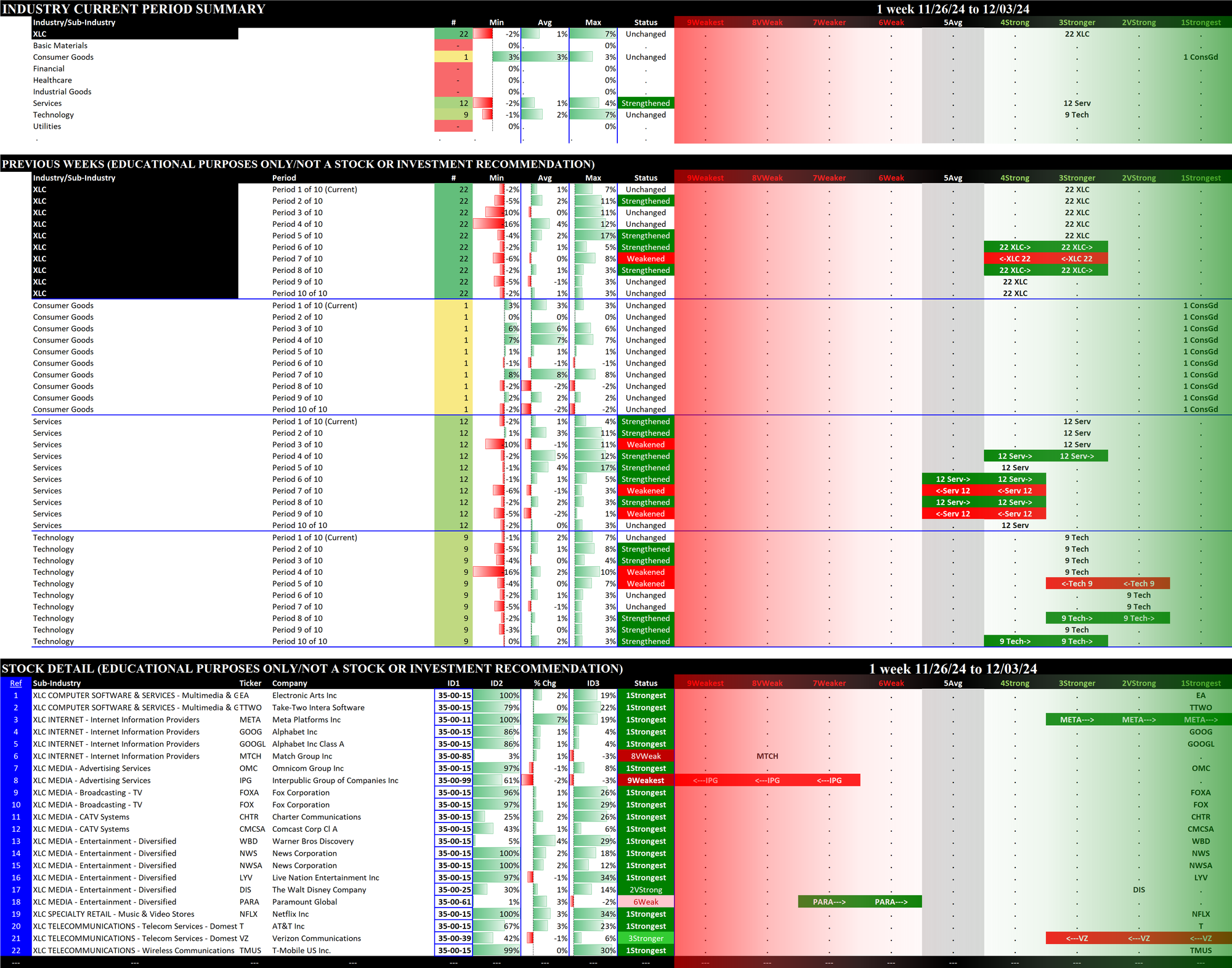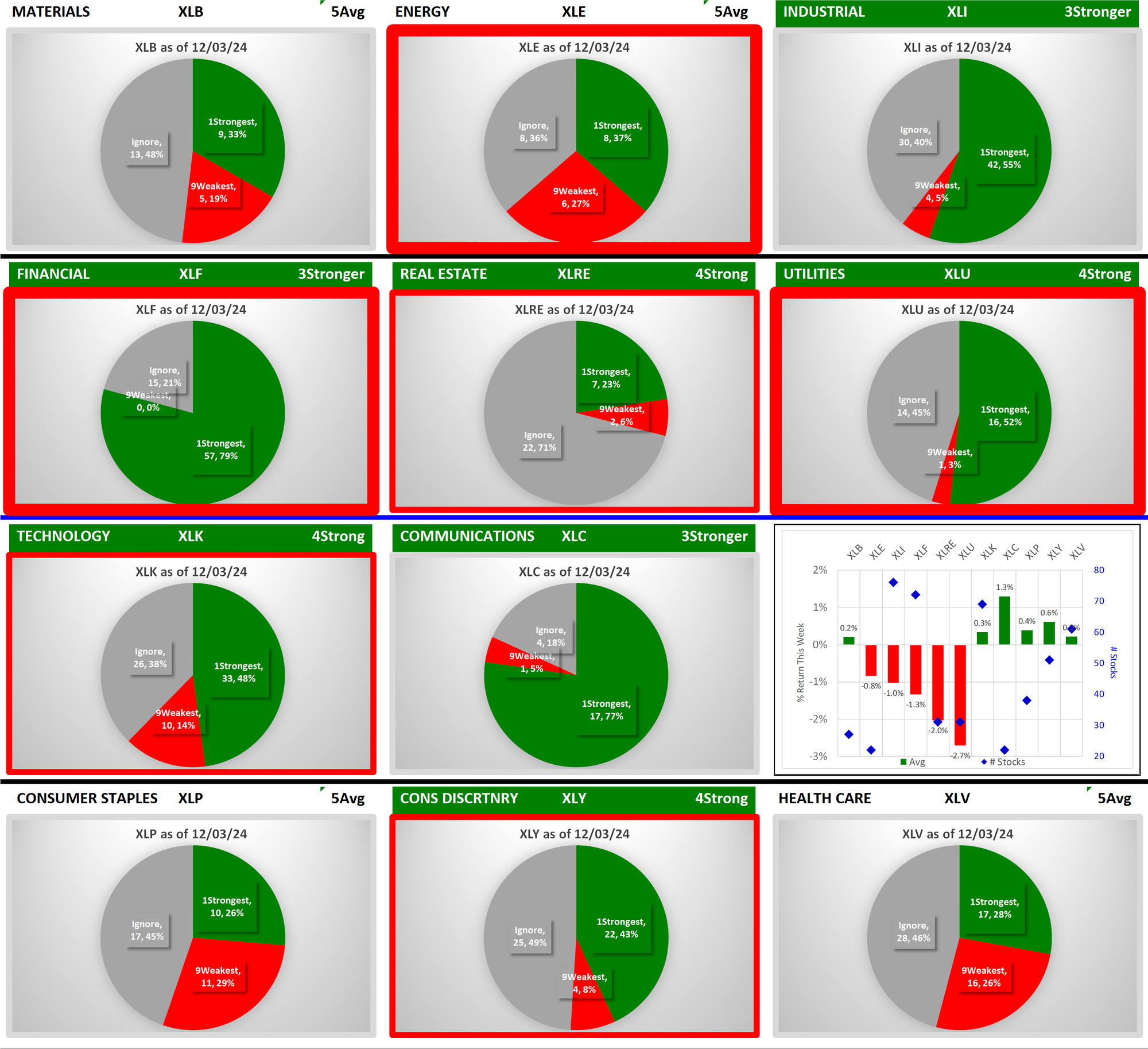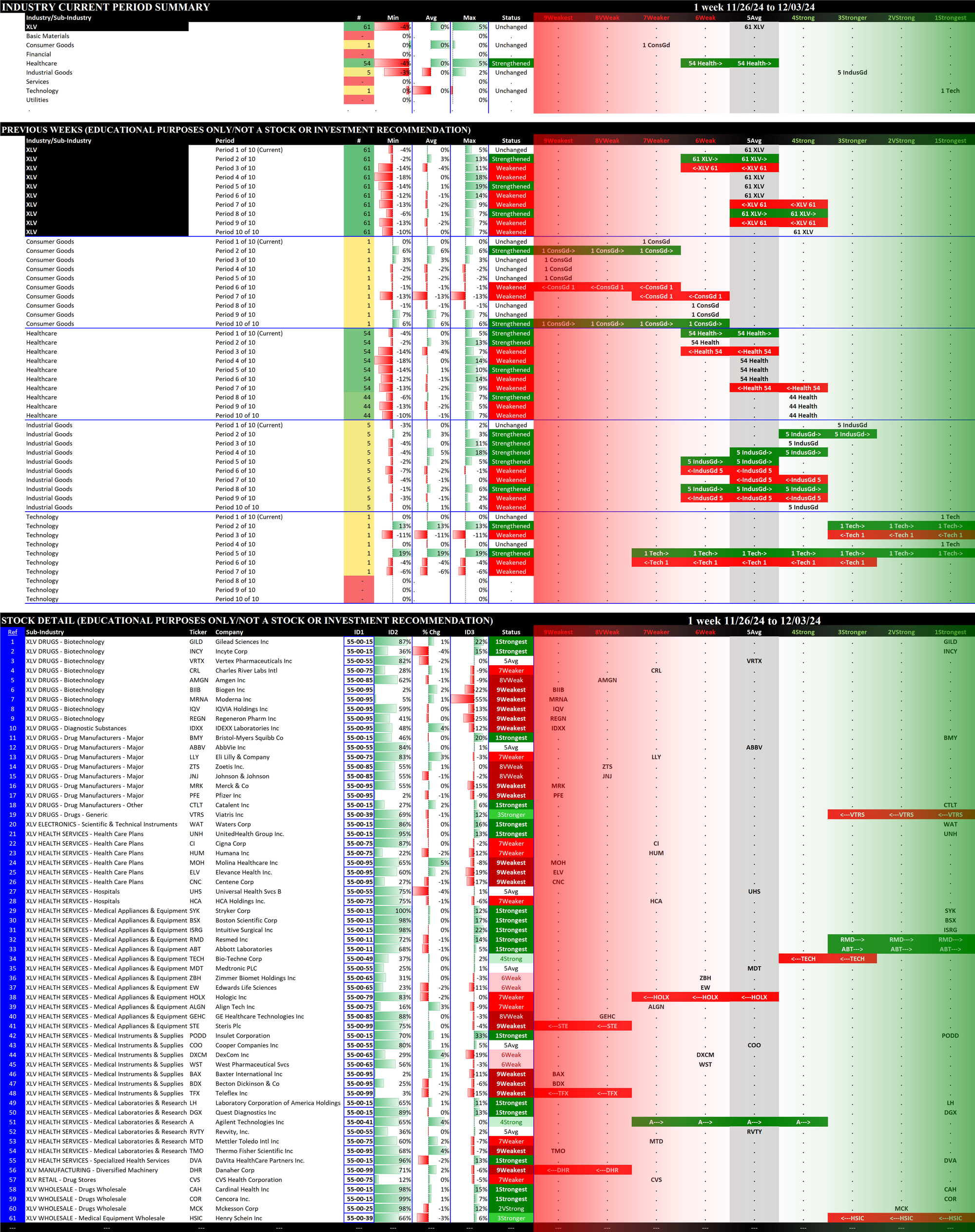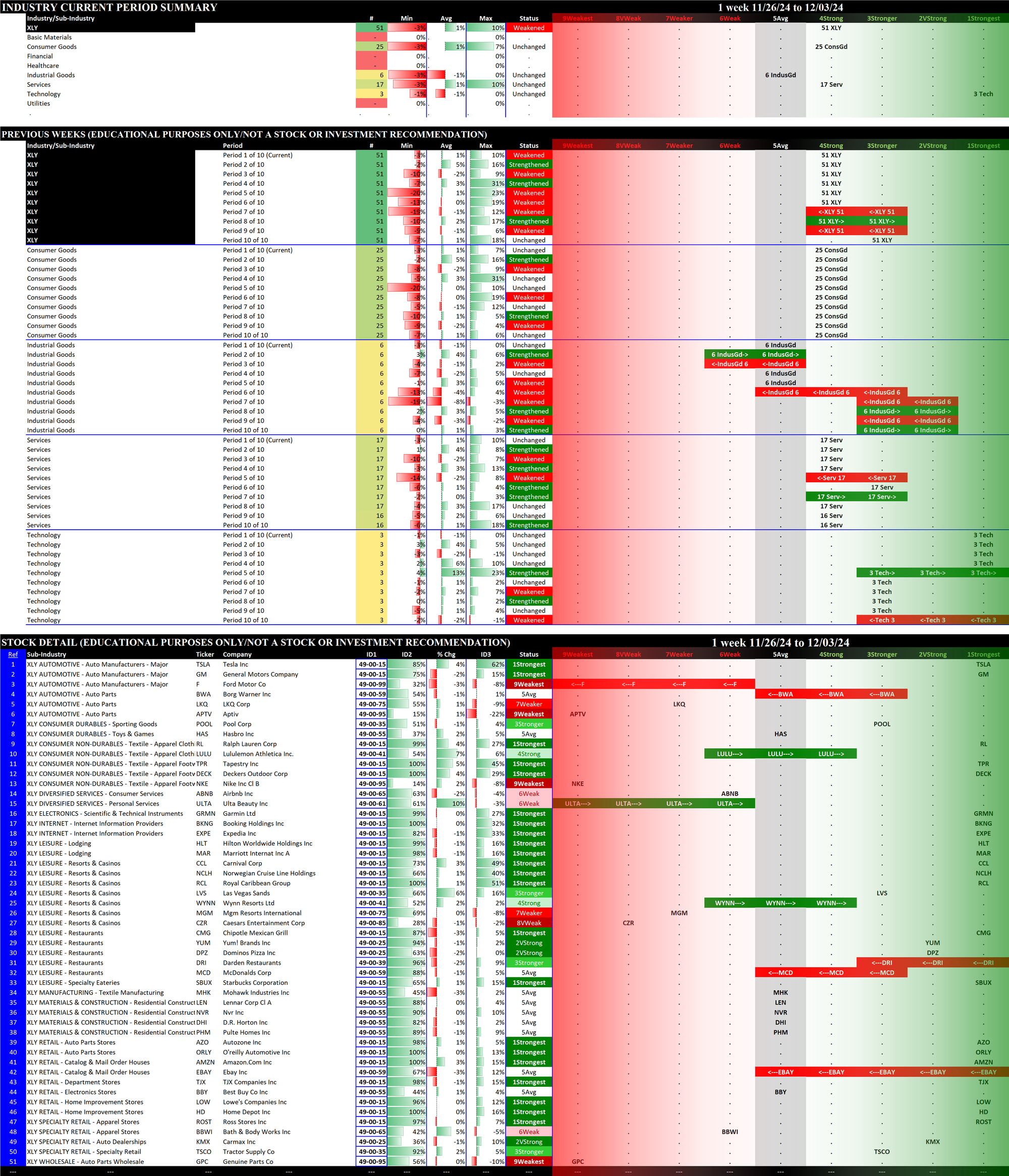 The following Stock Market Organizer strengthening/weakening analysis looks at the 11 SPDR ETFs and their underlying component stocks for the week ending Tuesday 2024-12-03, as follows: