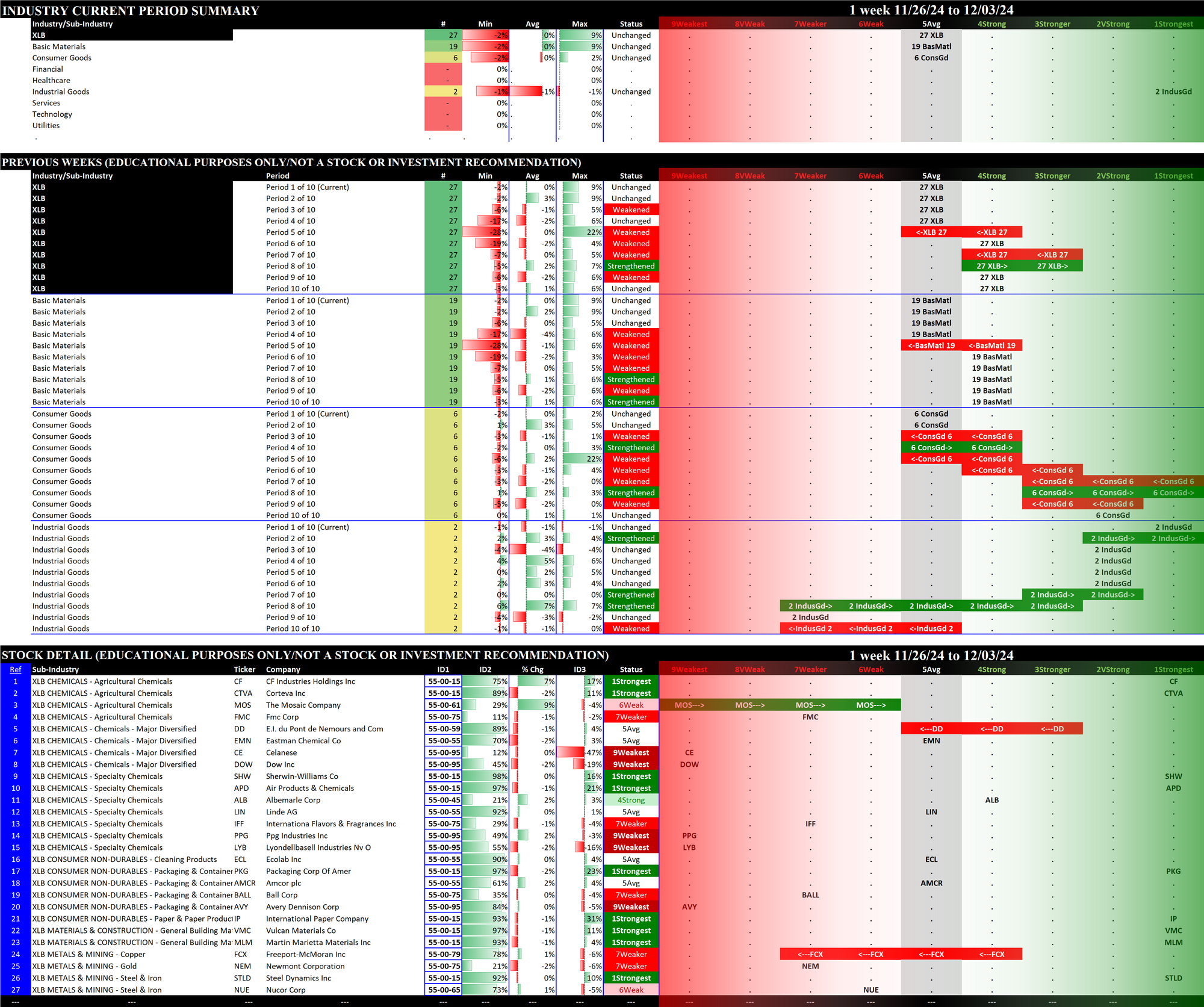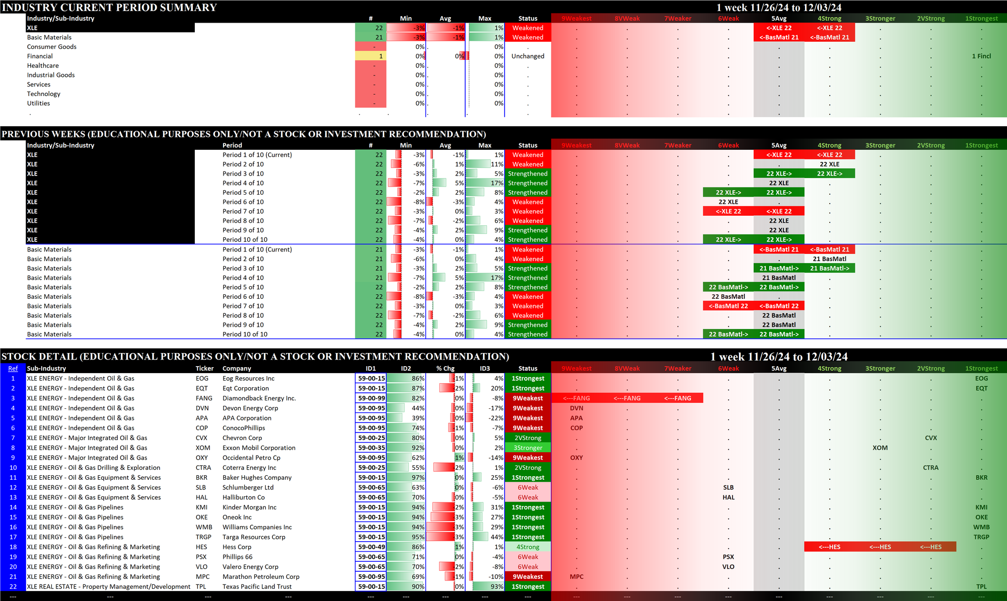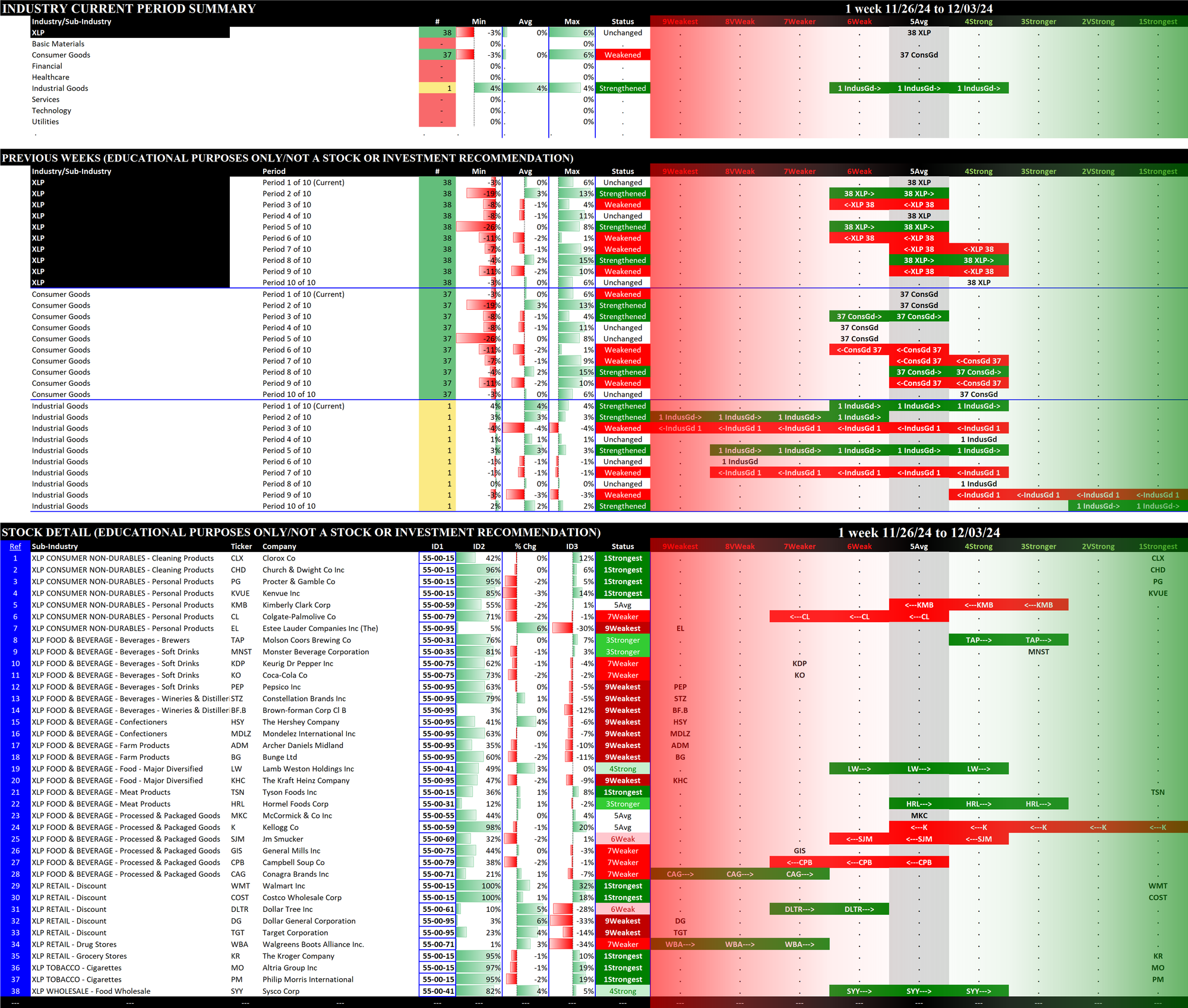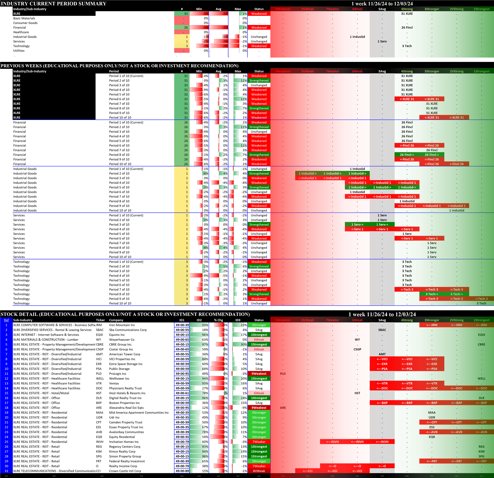 The following Stock Market Organizer strengthening/weakening analysis looks at the 11 SPDR ETFs and their underlying component stocks for the week ending Tuesday 2024-12-03, as follows: