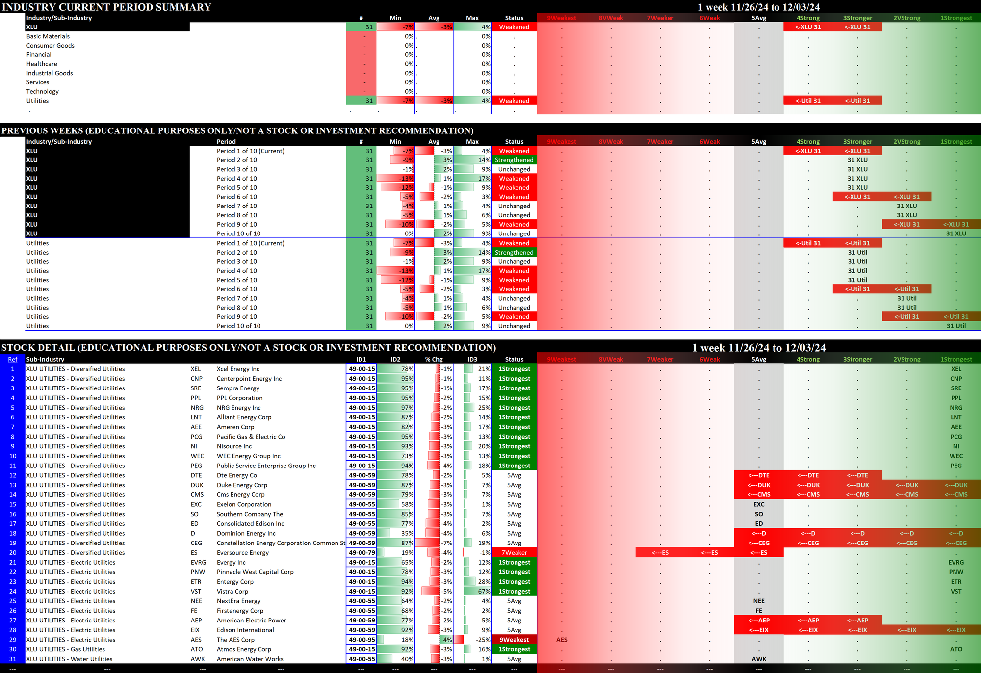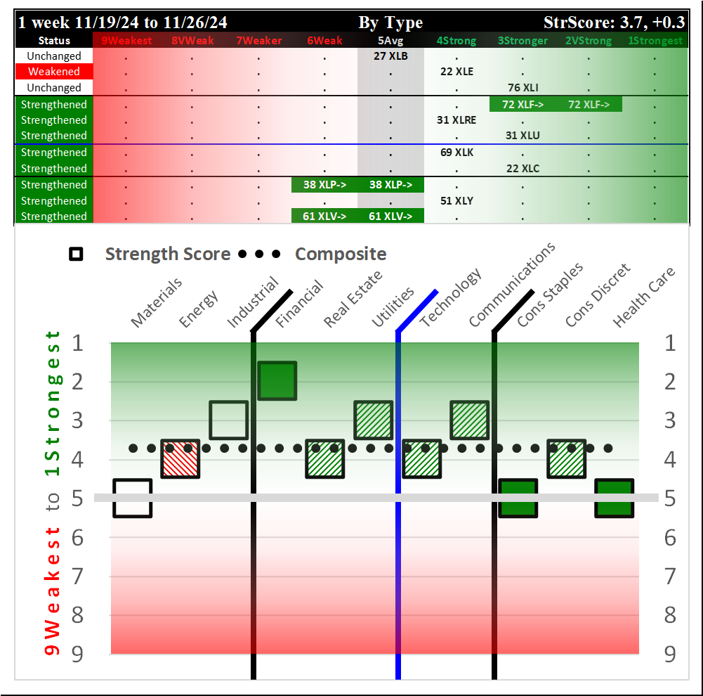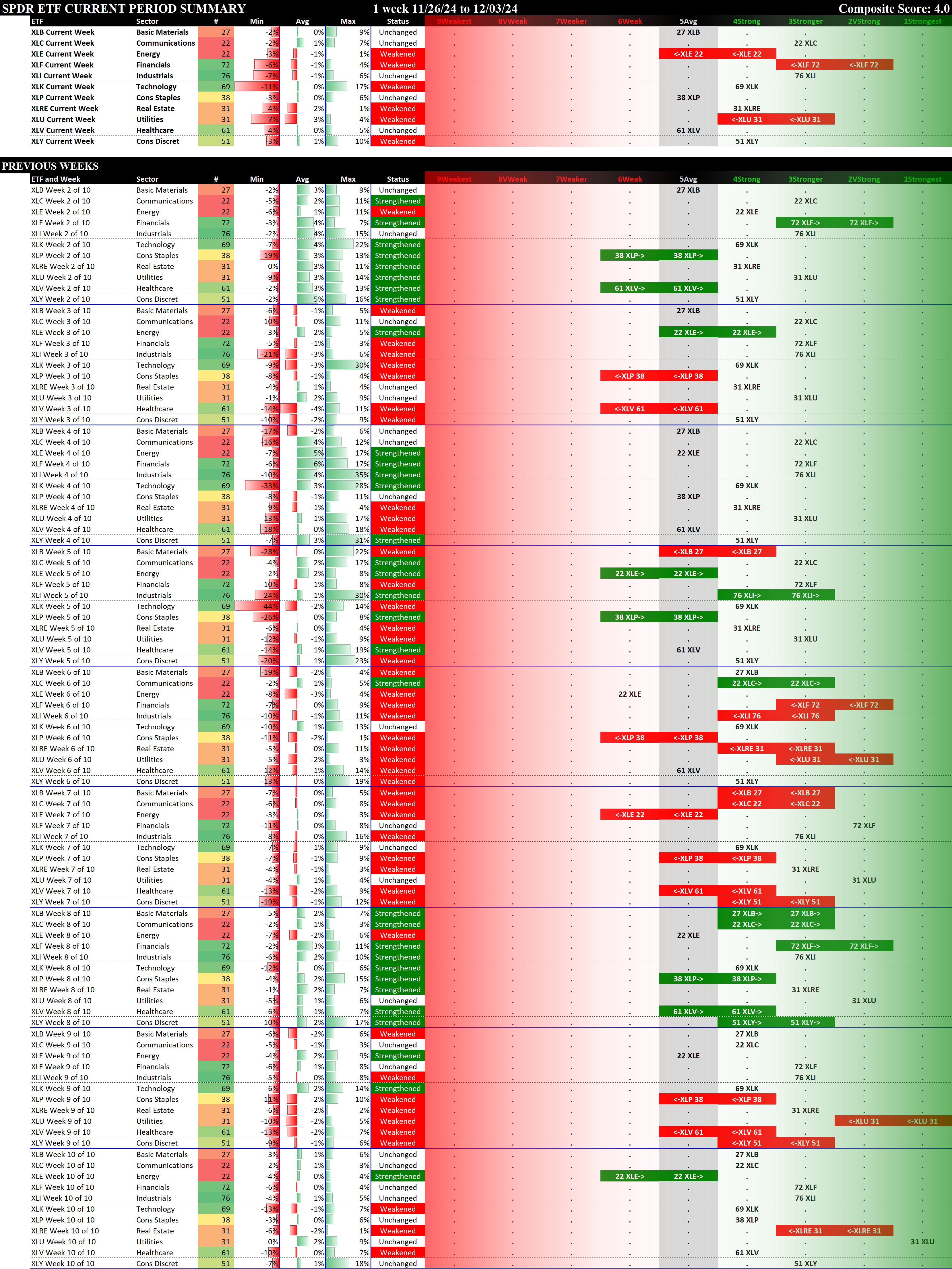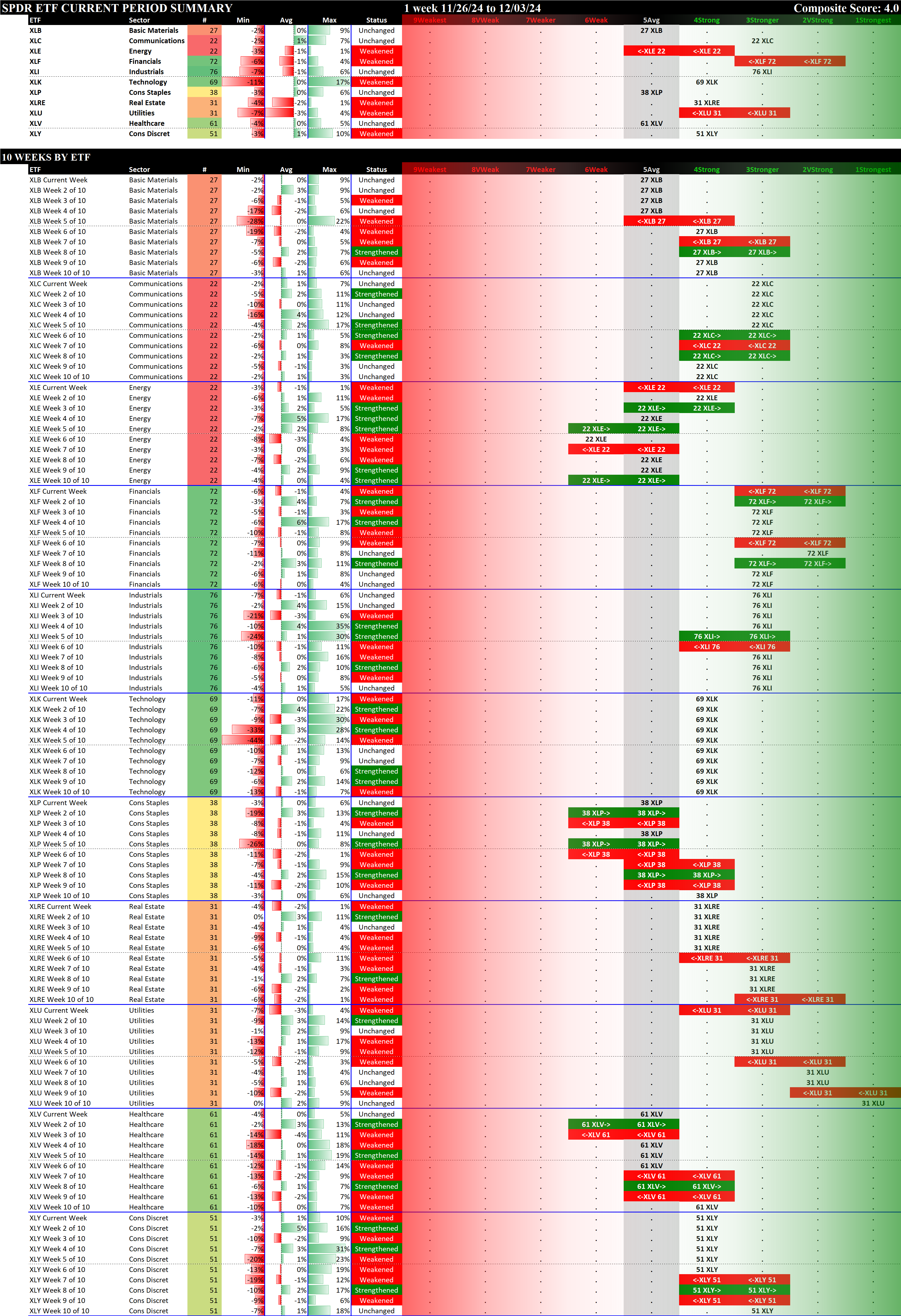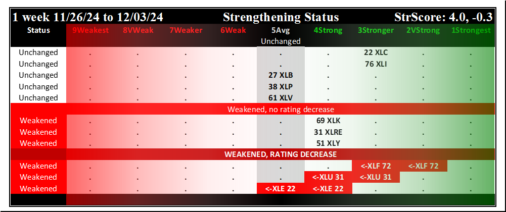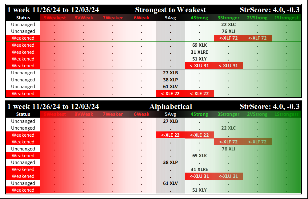 SMO Exclusive: SPDR Sector ETFs Strength Report Tuesday 2024-12-03 Weakened -0.3 to 4.0 Strength Score
