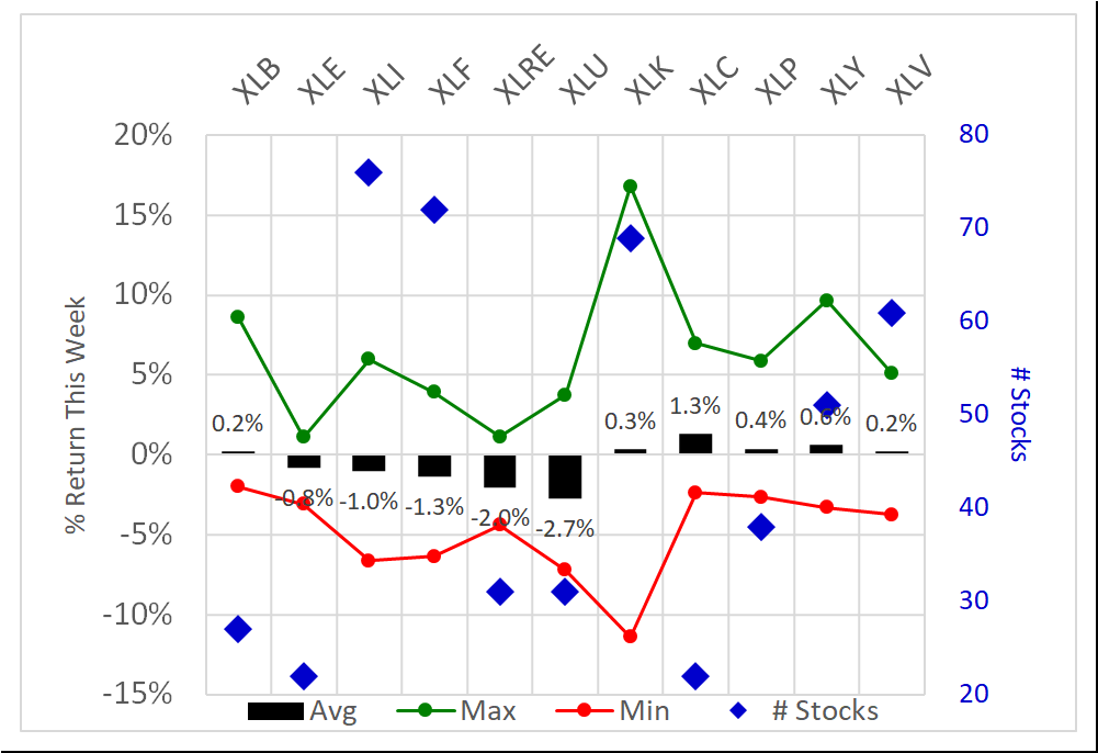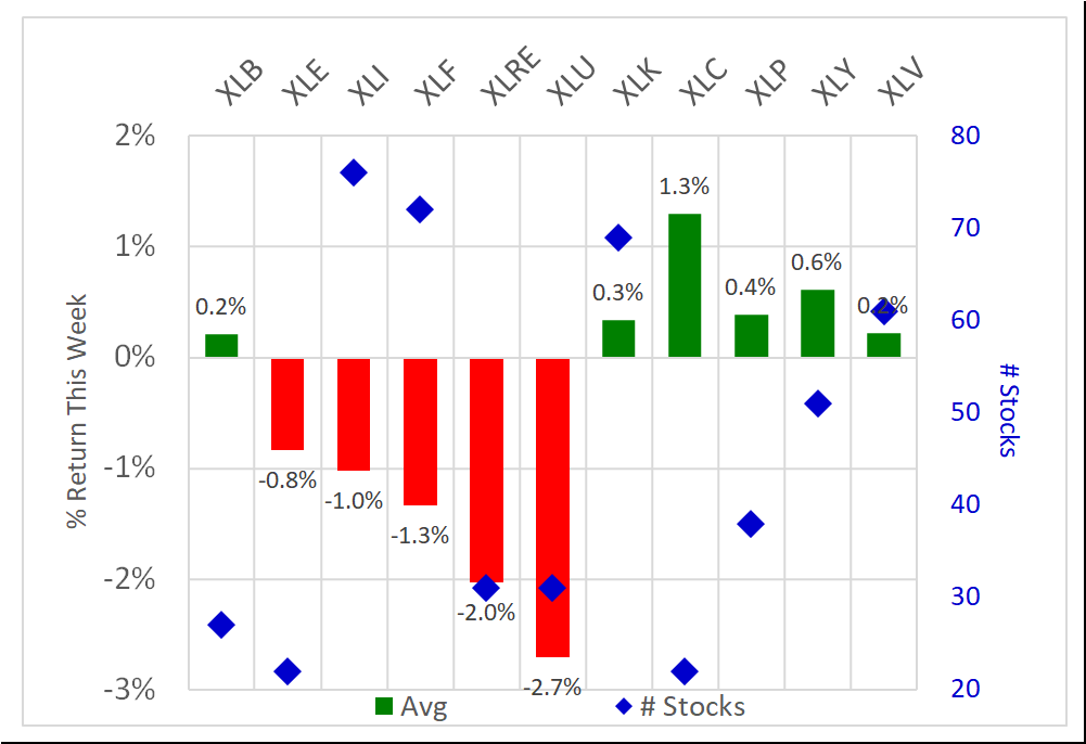 6 of 11 positive returns for the week, though the average returns of the two weakest sectors (XLU/Utilities and XLRE/Real Estate at -2.7% and -2.0%) outstripped to the downside the largest average positive return (XLC/Communications, +1.3%).
