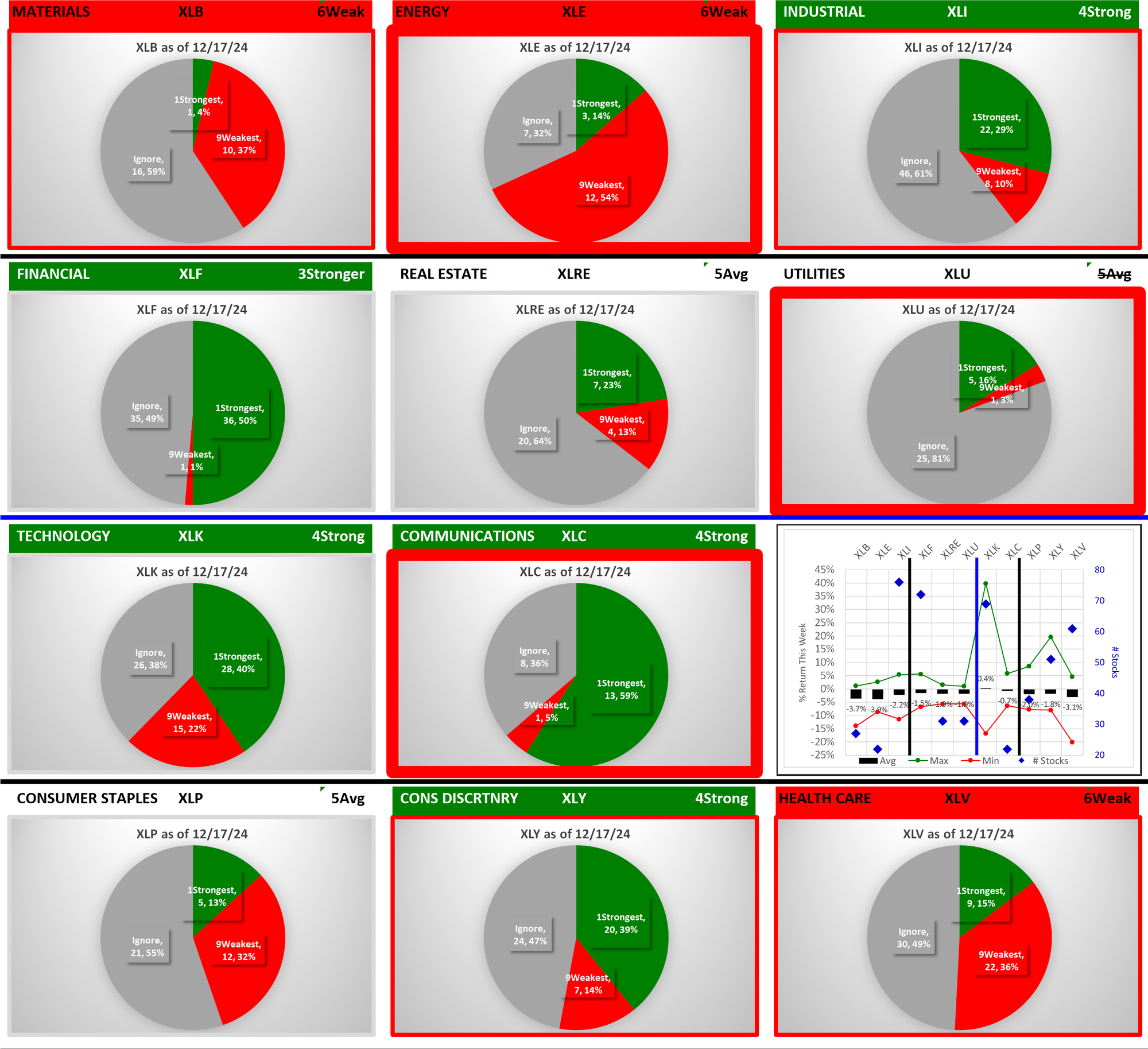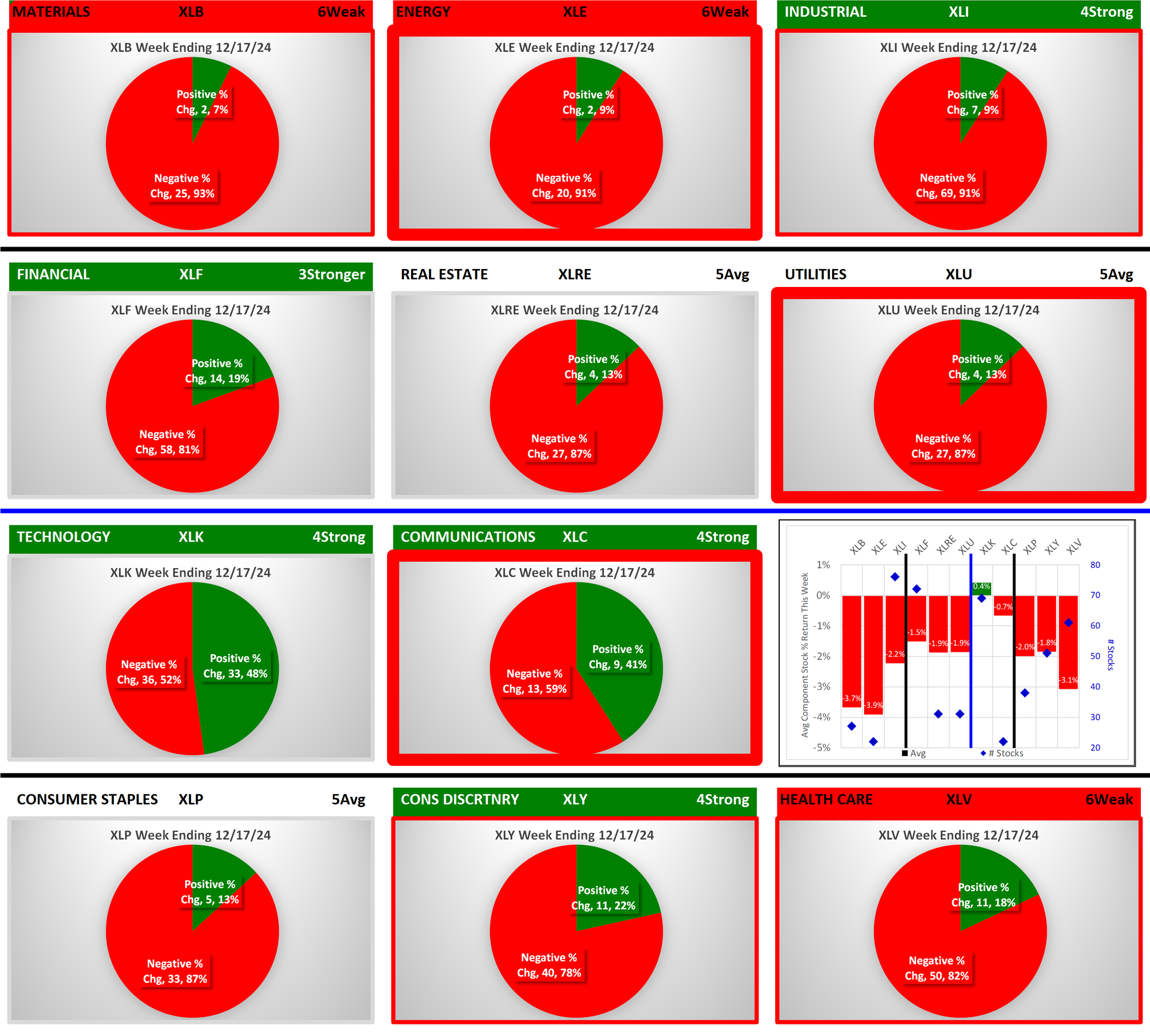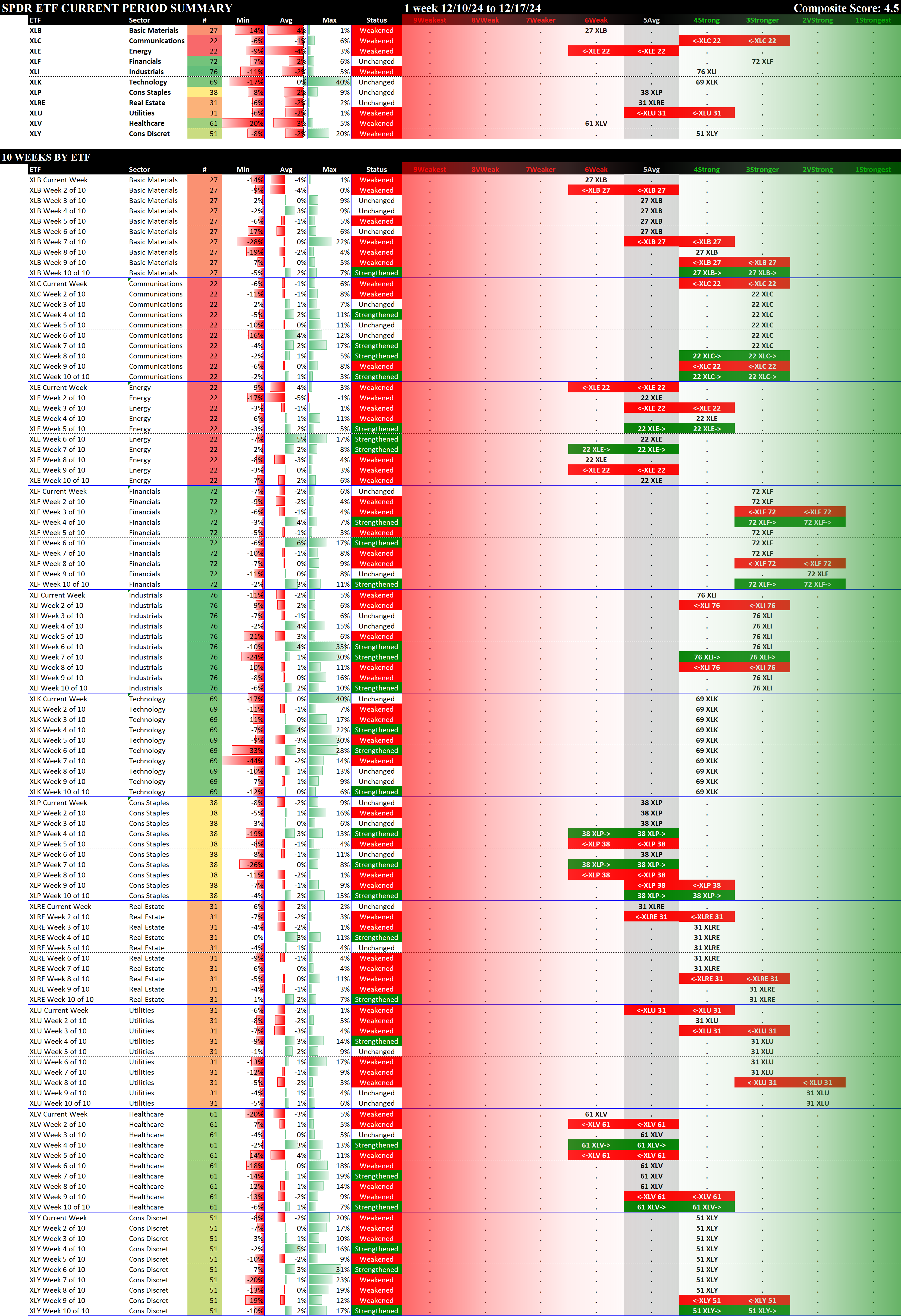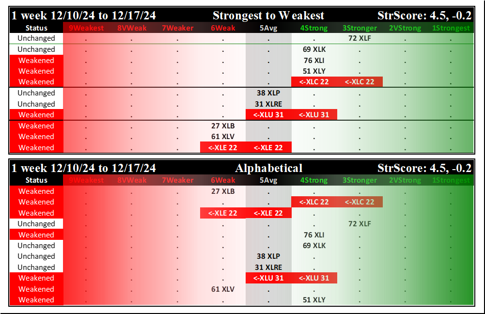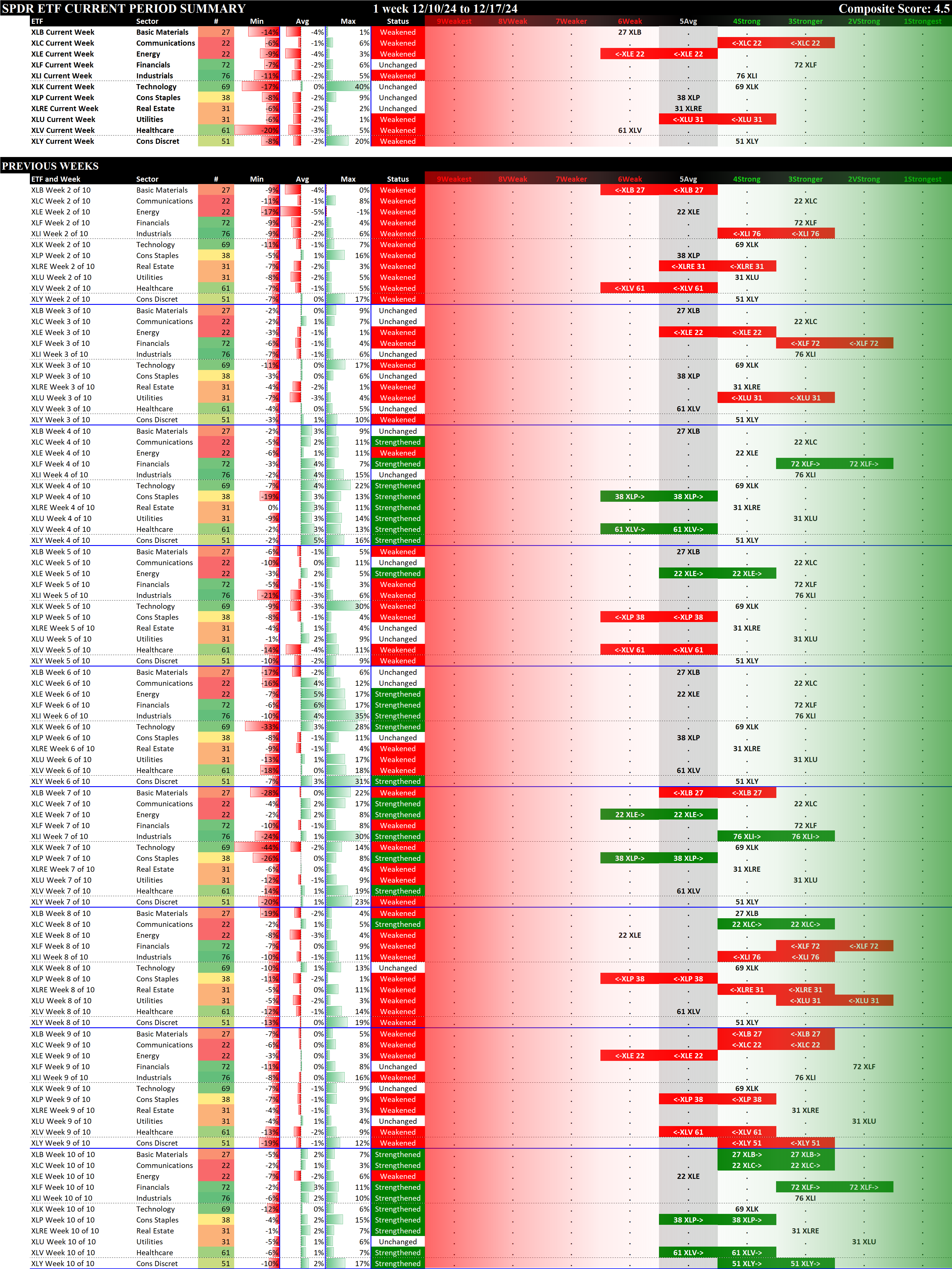 The following Stock Market Organizer strengthening/weakening analysis looks at the 11 SPDR ETFs and their underlying component stocks for the week ending Tuesday 2024-12-17, as follows: