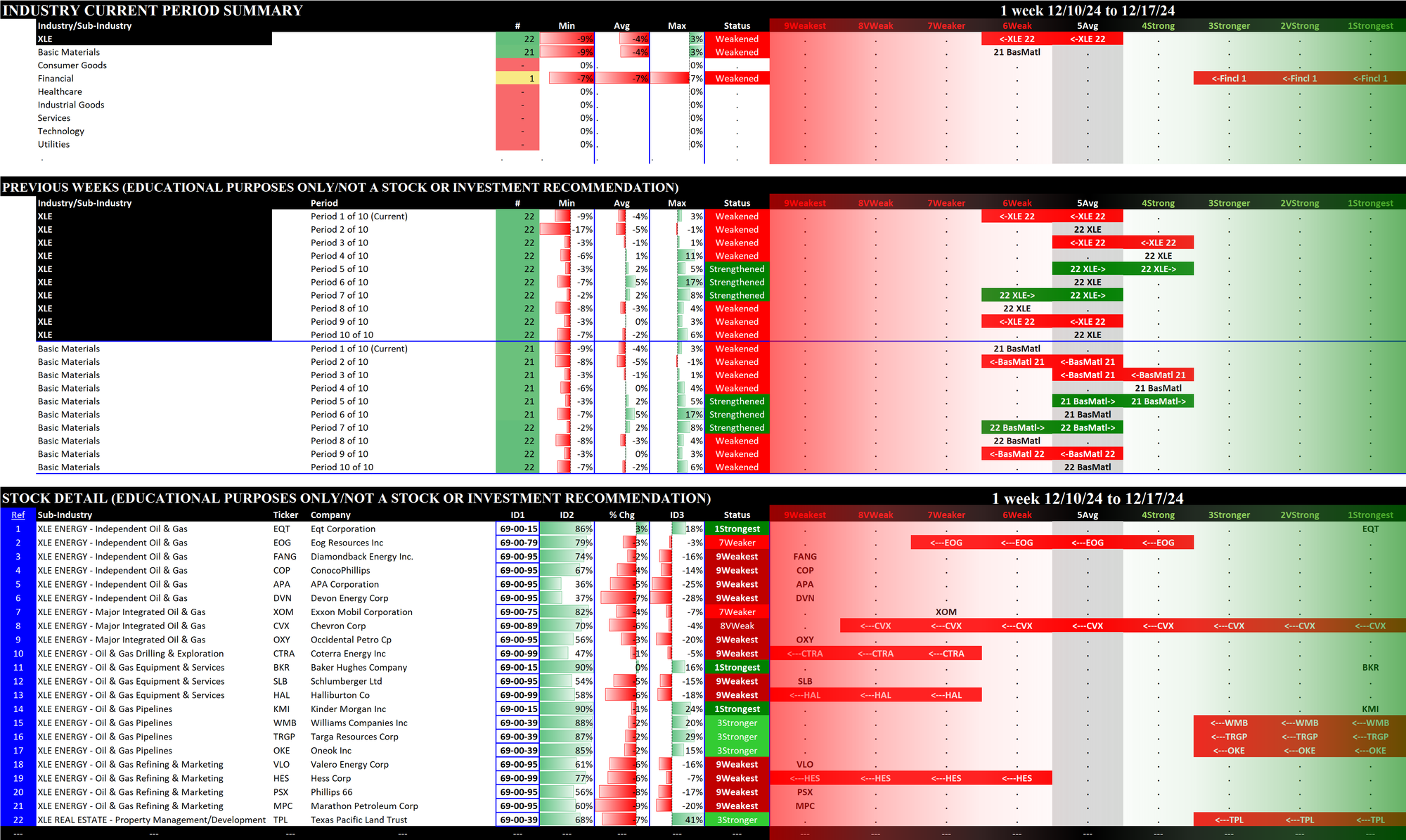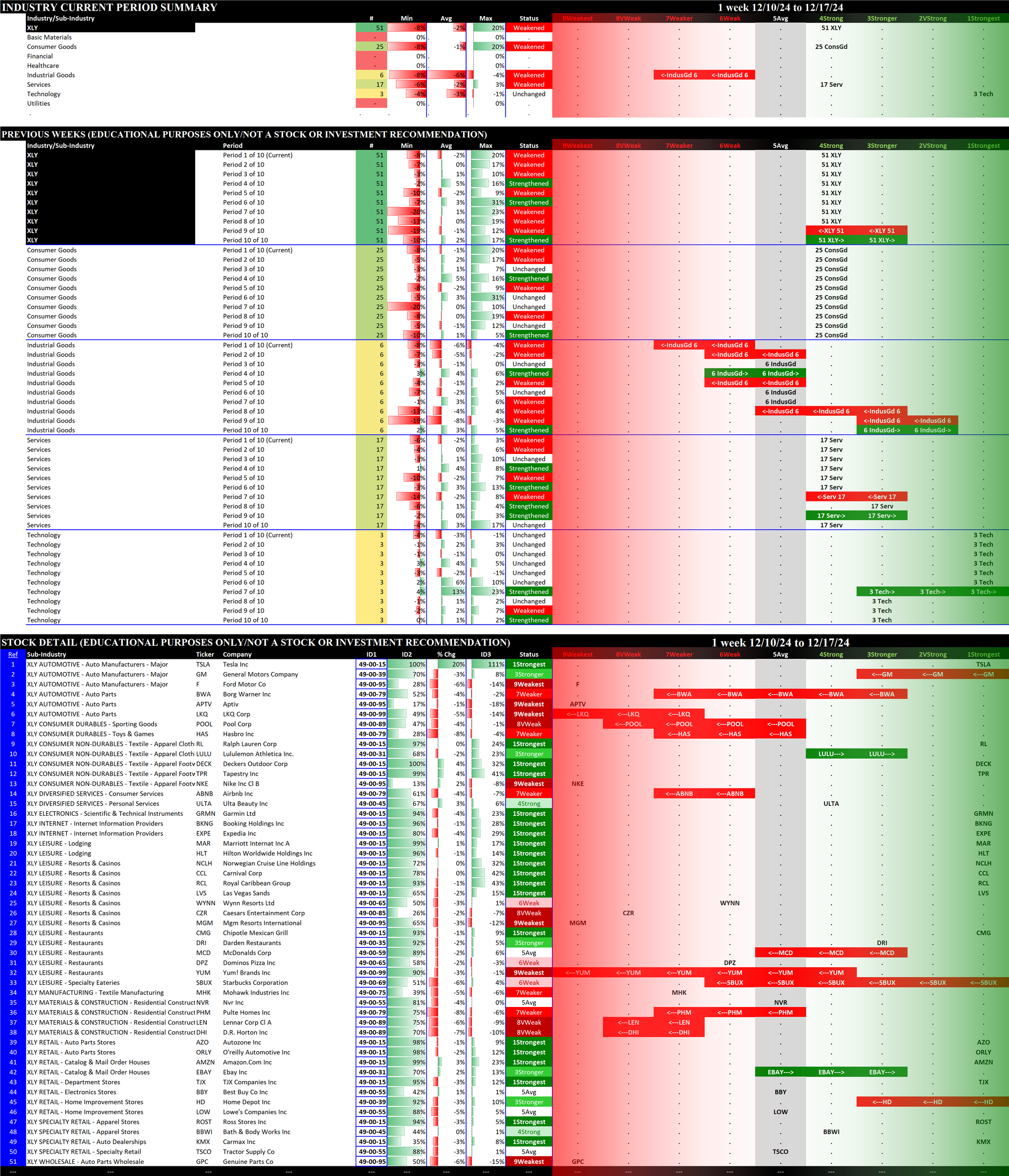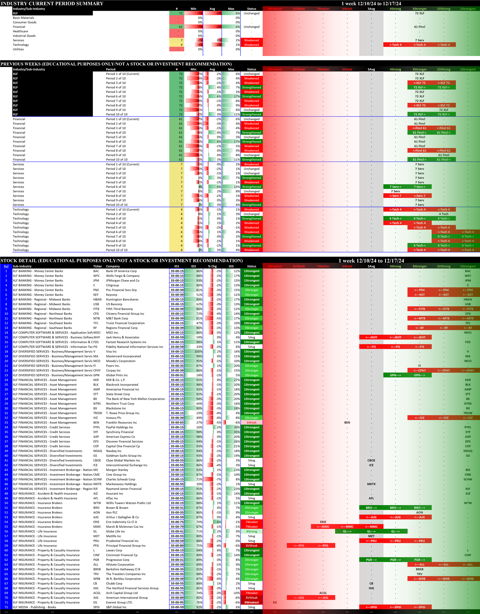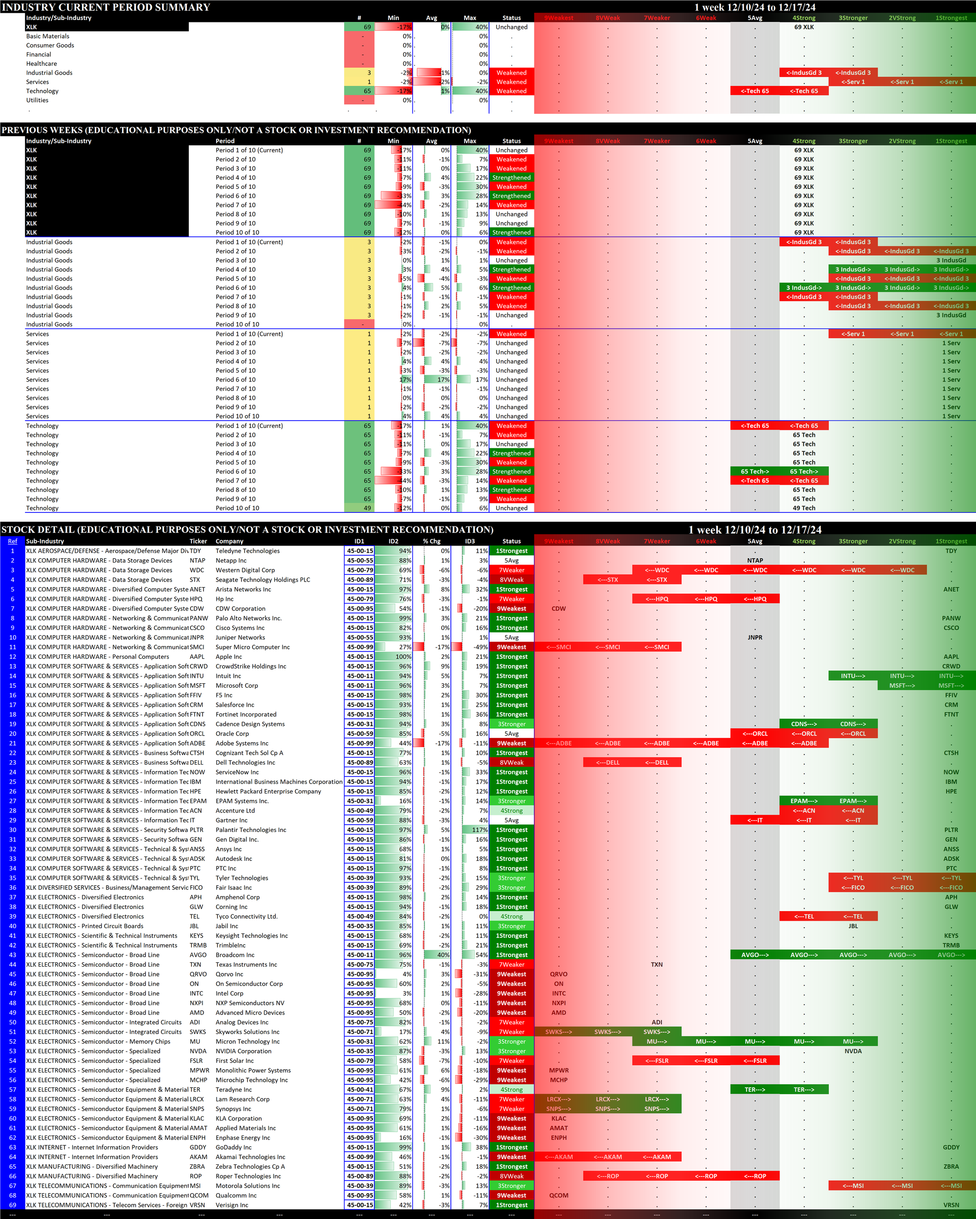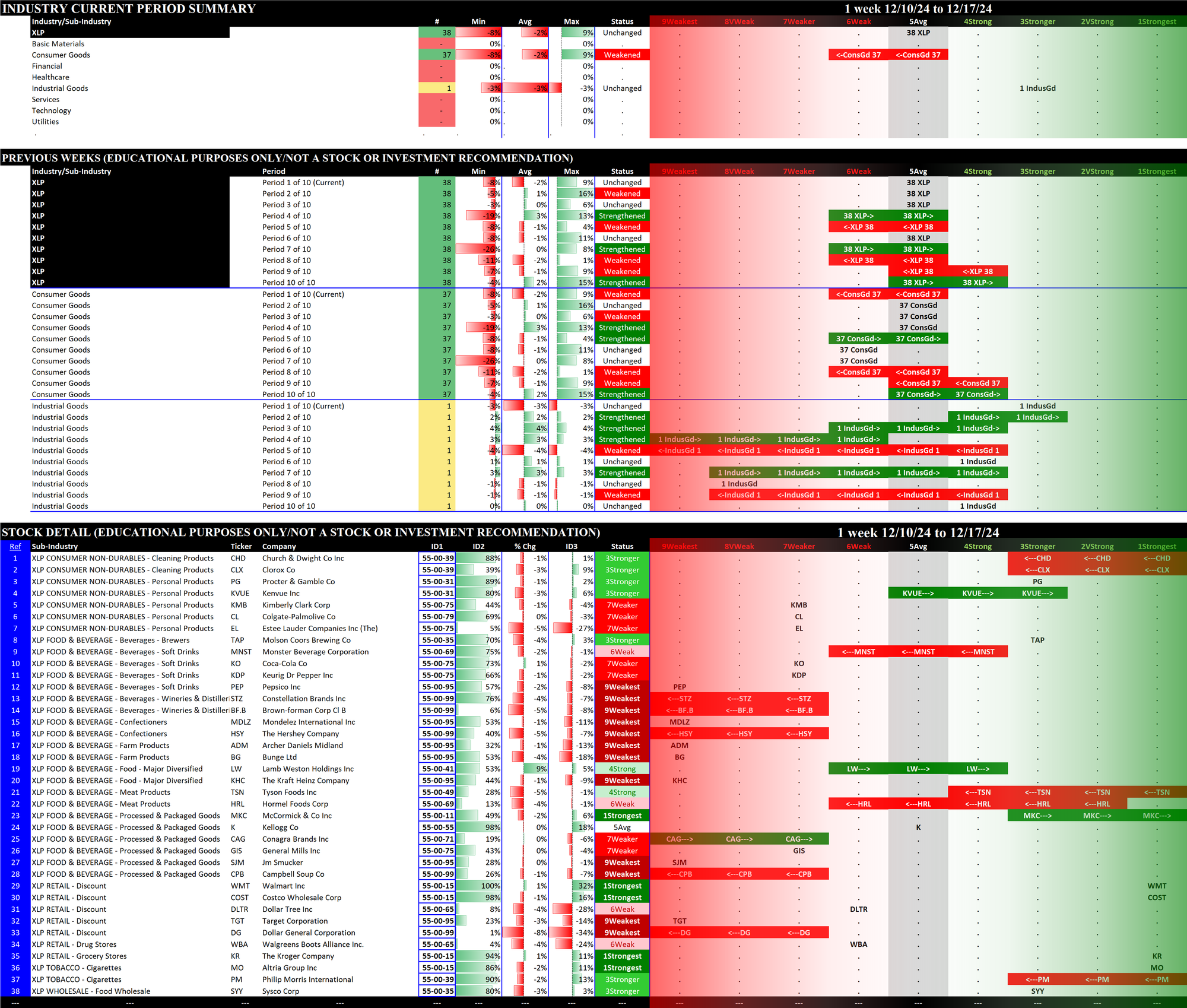 The following Stock Market Organizer strengthening/weakening analysis looks at the 11 SPDR ETFs and their underlying component stocks for the week ending Tuesday 2024-12-17, as follows: