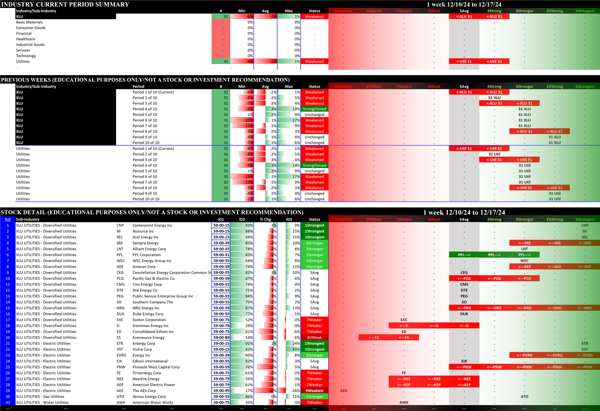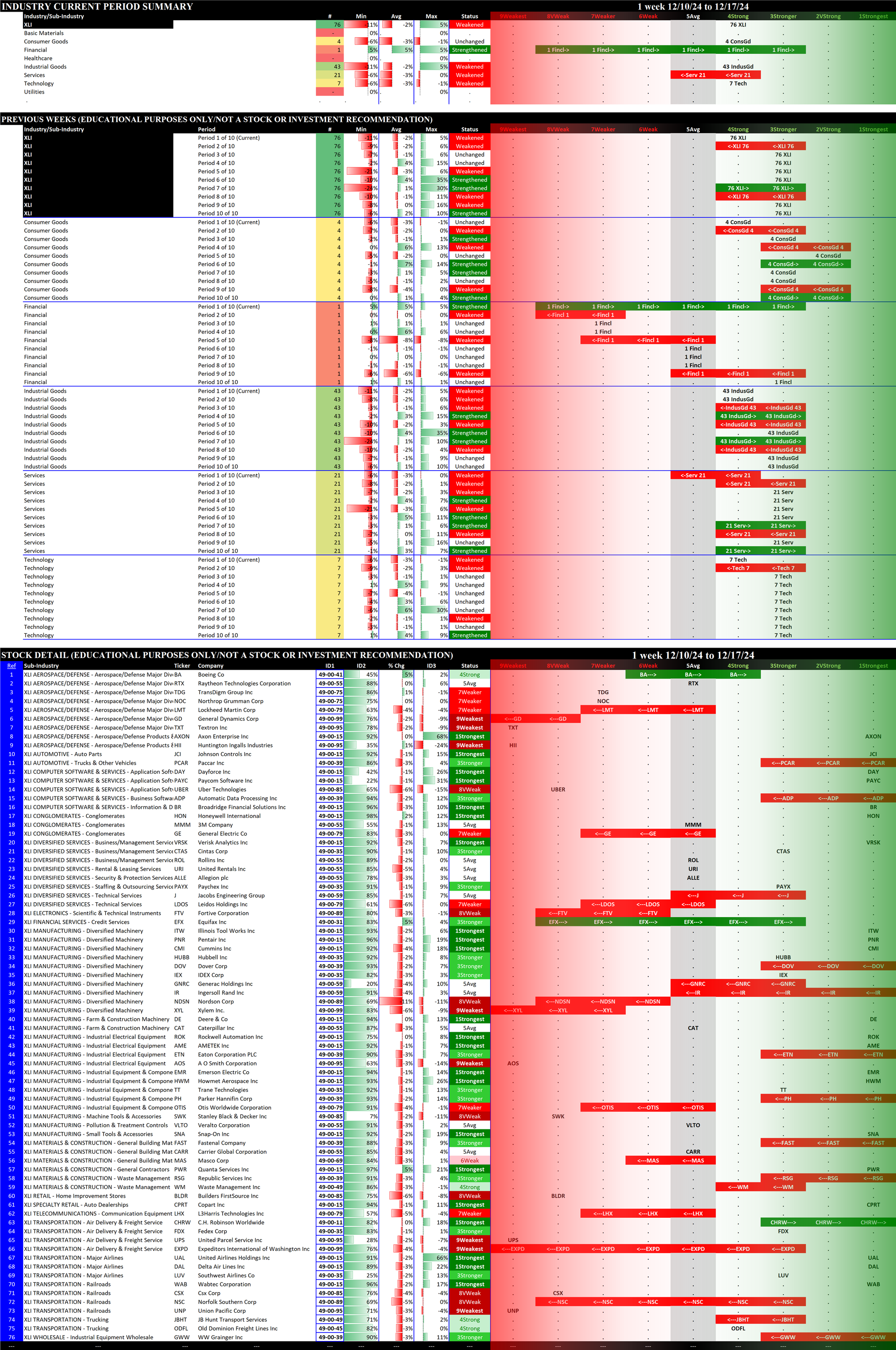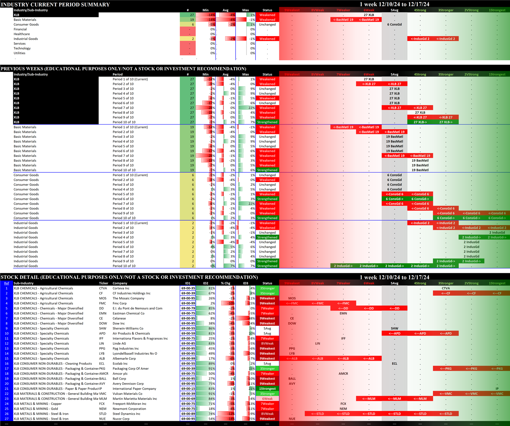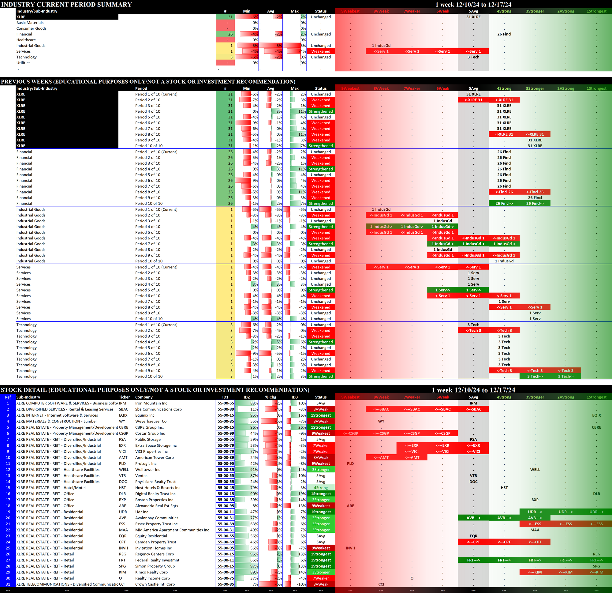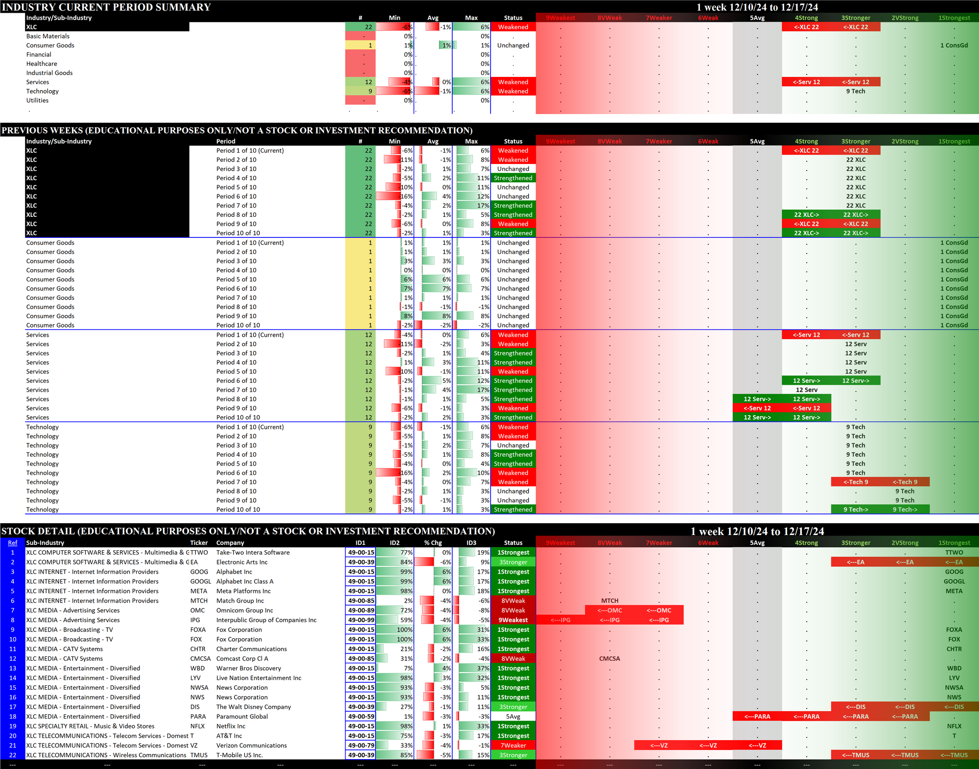 The following Stock Market Organizer strengthening/weakening analysis looks at the 11 SPDR ETFs and their underlying component stocks for the week ending Tuesday 2024-12-17, as follows:
