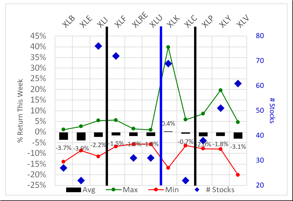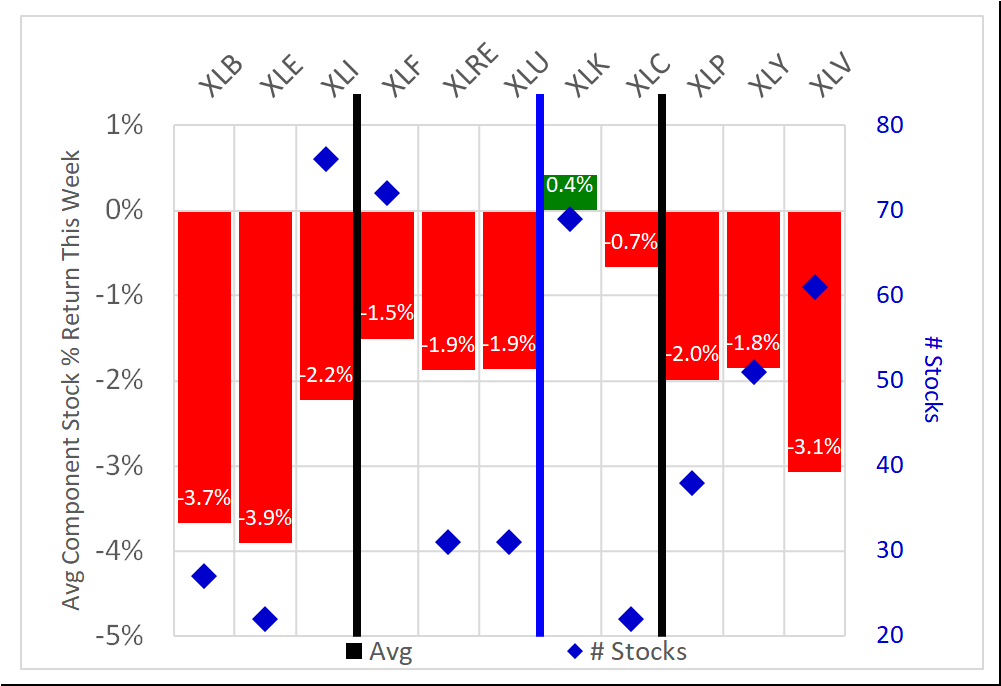 Only 1 of 11 ETFs (XLK/Technology, +0.4%) had positive average returns for the week for their component stocks.